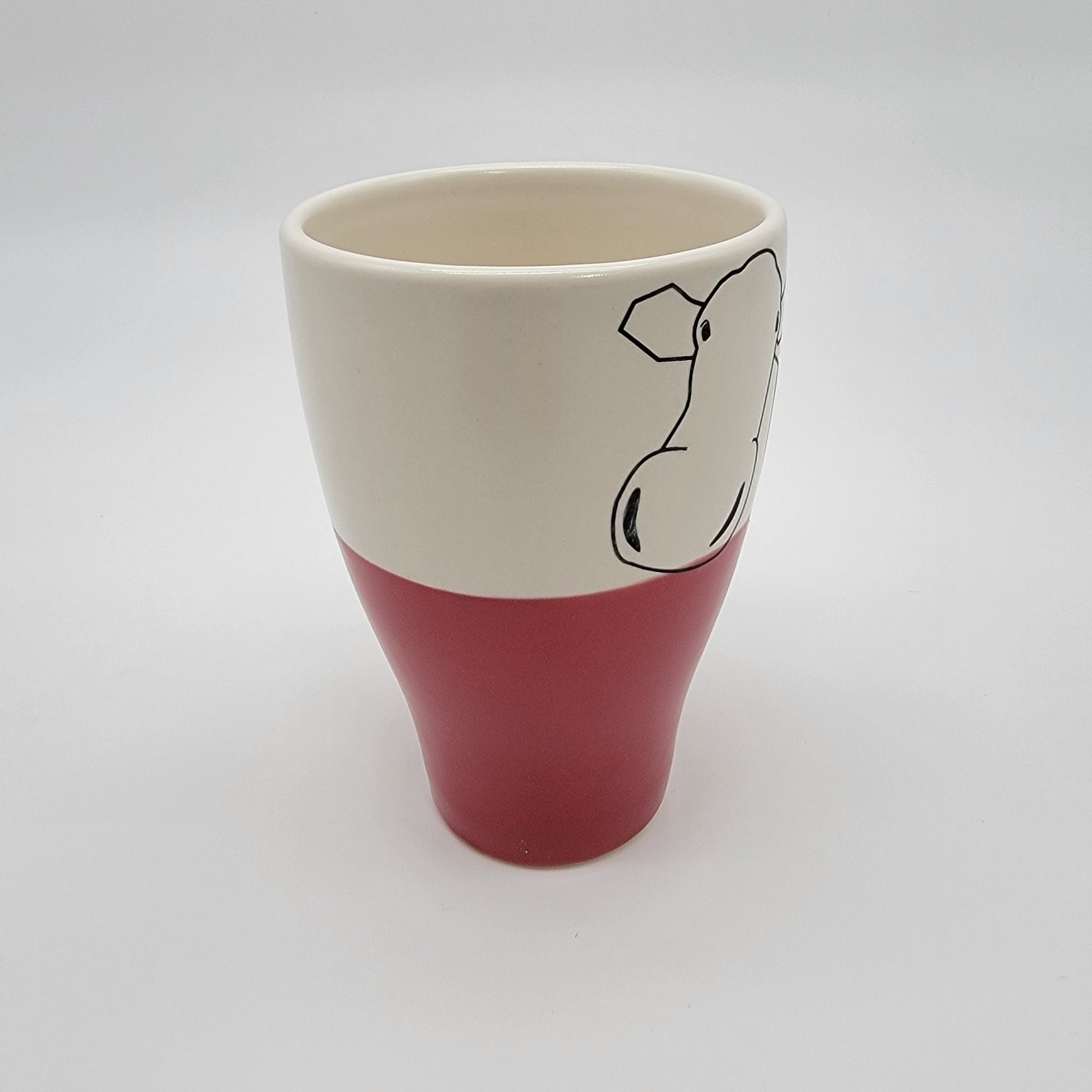 This ceramic mug features a whimsical cow graphic with a stylish red and white design. Ideal for beverages, it combines functionality and charm.