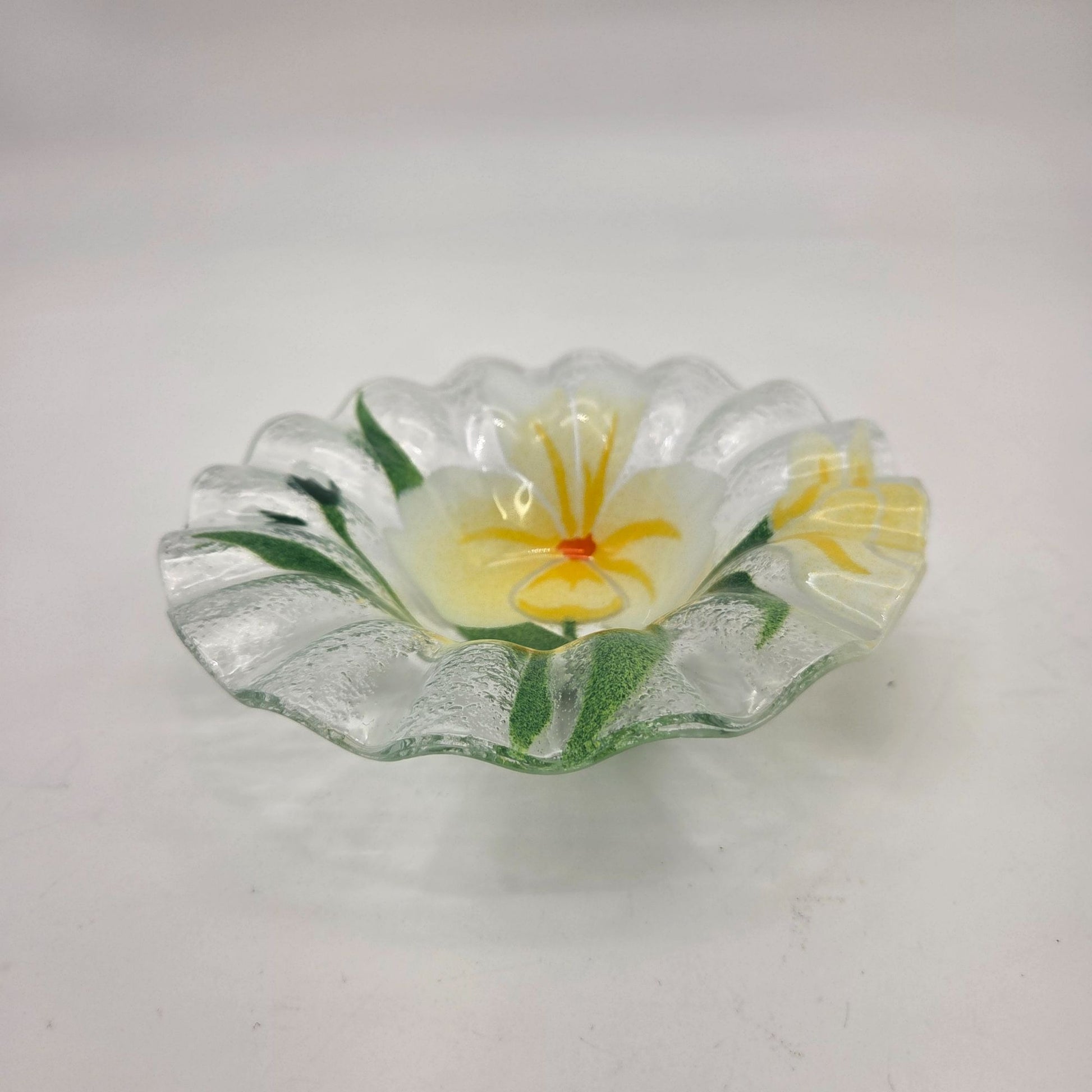 A charming piece of artistry, this fused glass bowl captures the delicate beauty of a blooming pansy. Its rippled edges and vibrant yellow petals evoke the serenity of a spring garden. Perfect as a decorative centerpiece or for small treasures, this handmade piece celebrates craftsmanship and nature’s elegance.
