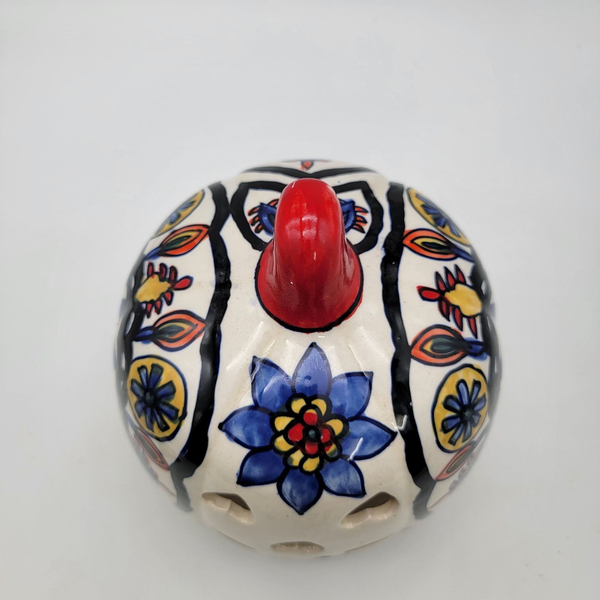 Talavera Style Halloween Pumpkin Jack-O-Lantern White with Large Blue Flower
