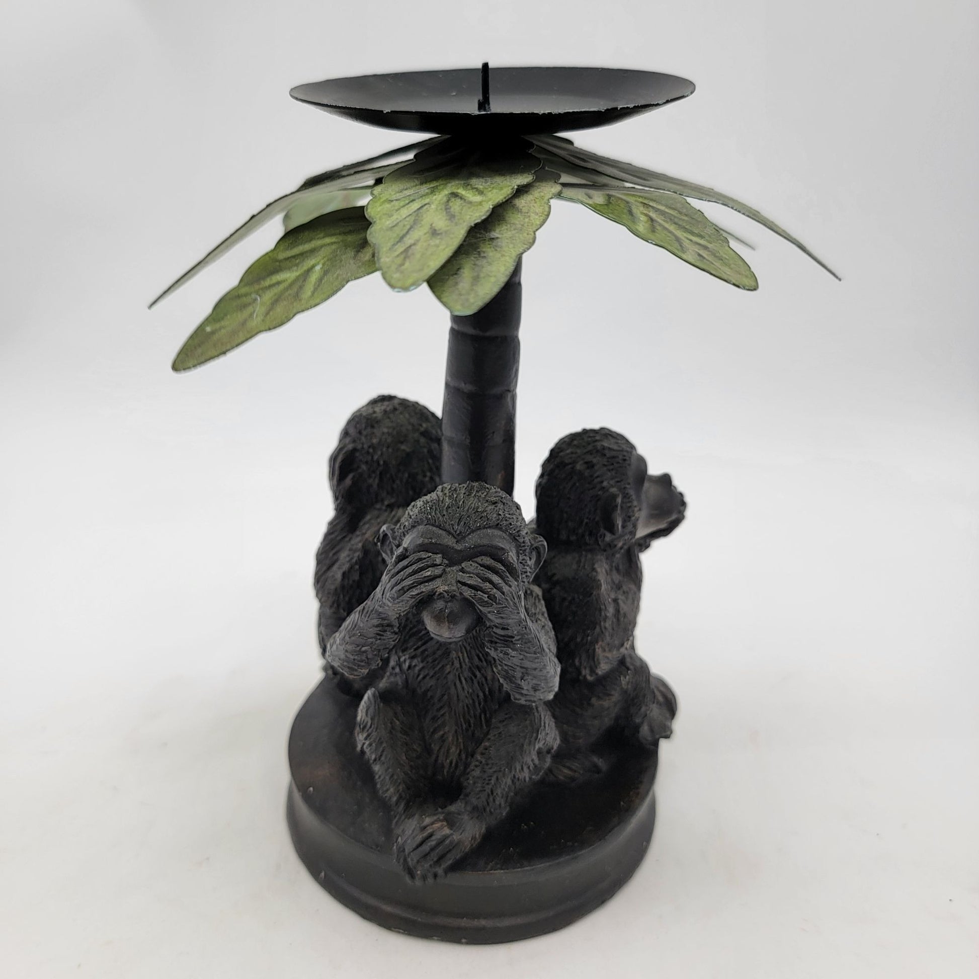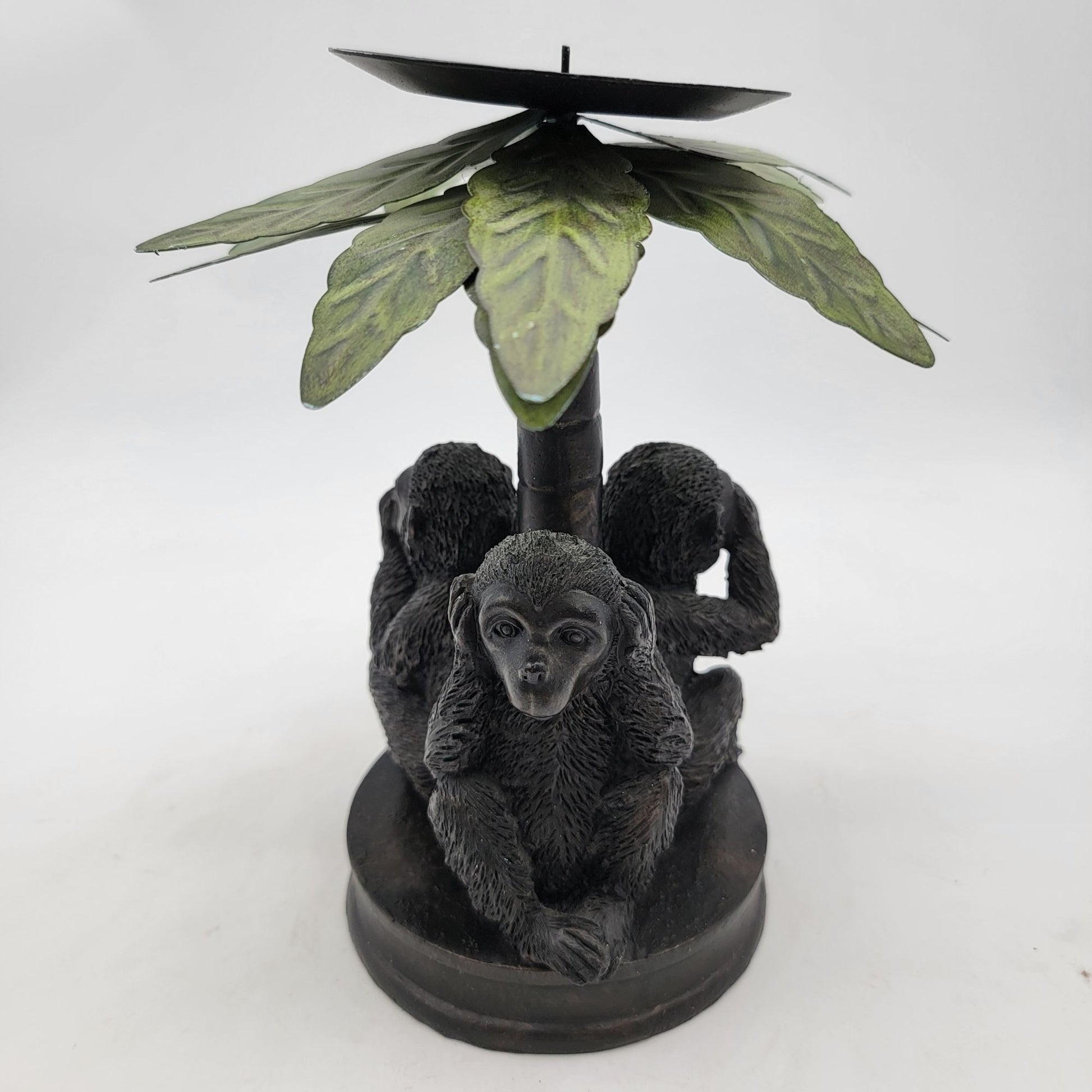This candle holder, featuring the iconic "See No Evil, Hear No Evil, Speak No Evil" monkeys, adds a touch of whimsy and wisdom to any setting. Its palm leaf shade offers a nod to vintage charm, while the intricate detailing of the monkeys imparts a sense of craftsmanship from a bygone era.