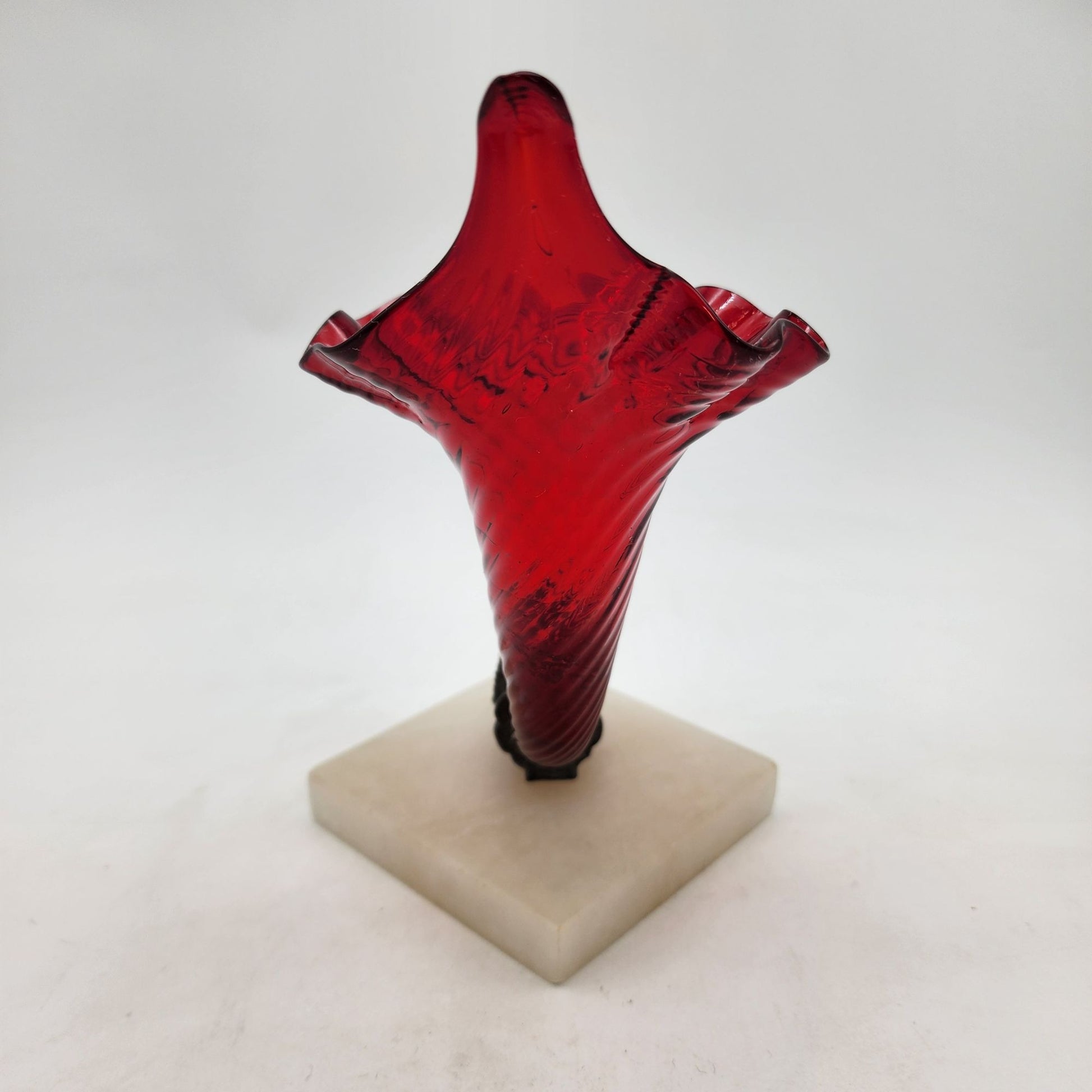 This exquisite vintage piece is a beautiful example of glass artistry, featuring a stunning red horn of plenty design atop an alabaster base. The ram's head detail provides a unique focal point, reminiscent of antique styles. This item can serve as an eye-catching decorative piece that adds a touch of classic elegance to any room.