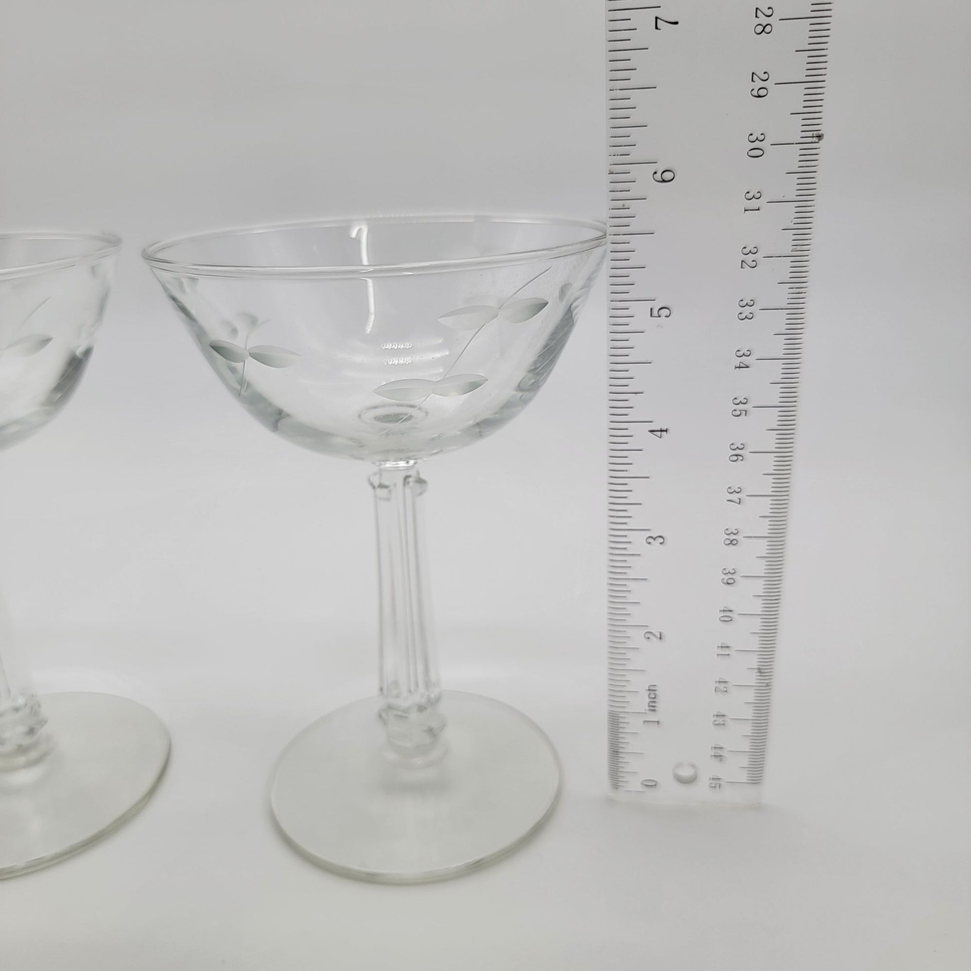 Step into the glamour of the 1960s with this exquisite pair of etched champagne coupes. Perfectly crafted with delicate leaf etchings and timeless elegance, these glasses elevate your gatherings. Their vintage charm and sturdy stems make them a sophisticated addition to your collection or a thoughtful gift for a connoisseur.