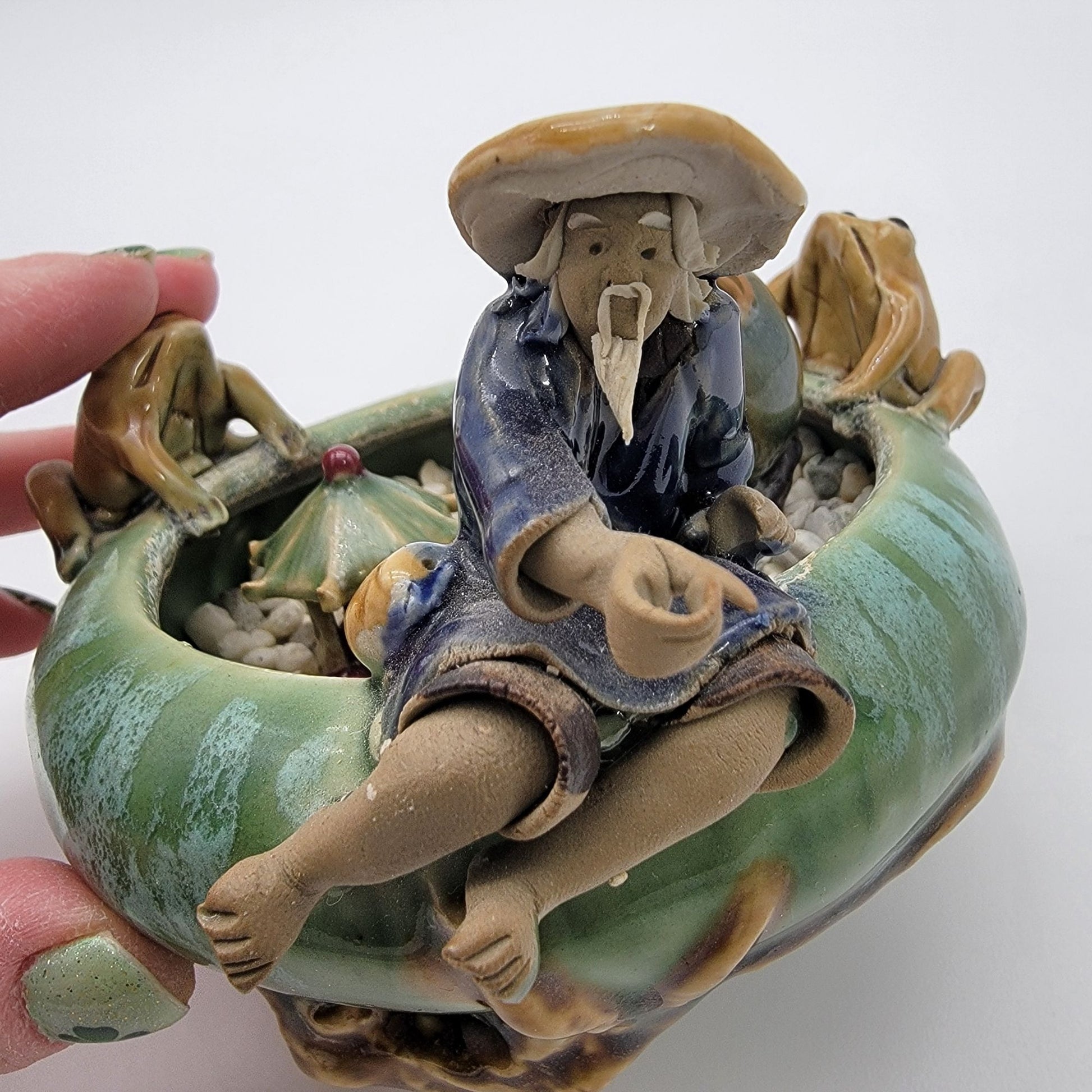 In a serene riverside setting, this vintage Majolica pottery bowl features two mudmen figures and playful frogs. The intricate hand-painted details bring life to the peaceful scene, making it a unique decorative piece or charming planter. A nostalgic nod to traditional art forms and craftsmanship.