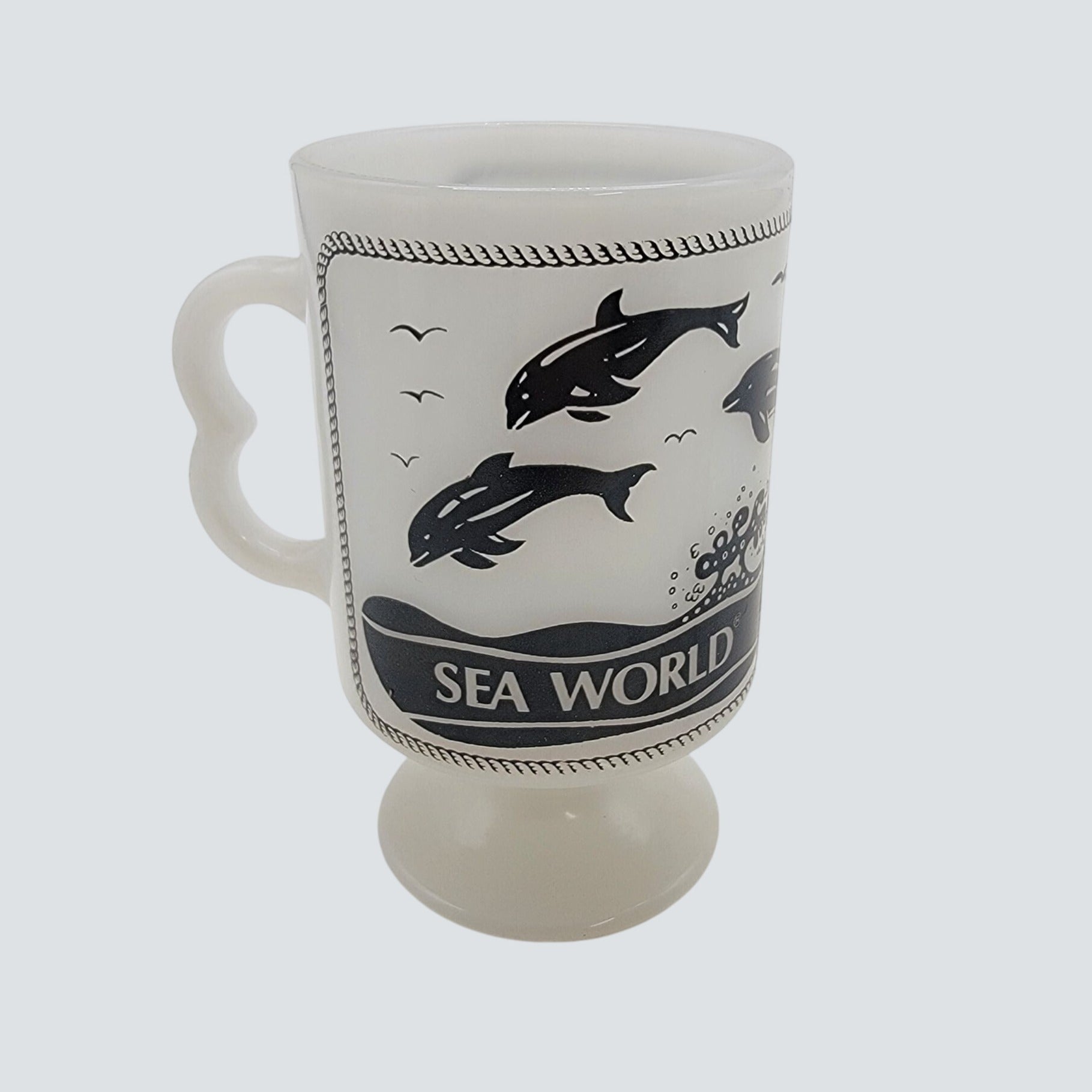This pair of vintage Sea World mugs evokes nostalgia with their classic milk glass design, detailed with playful orca whales. A true collector's gem.