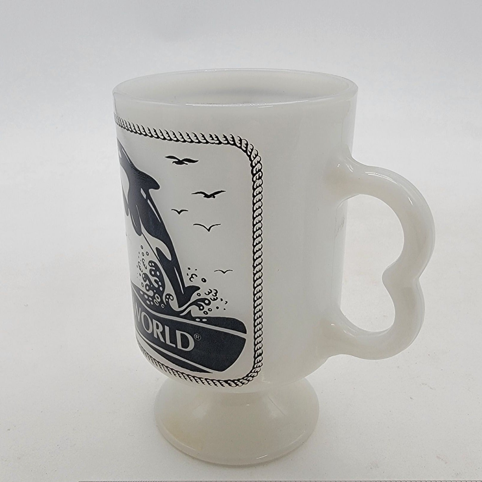 Vintage 1970's Sea World Shamu Killer Whale Footed Milk Glass Mugs Set Of 2