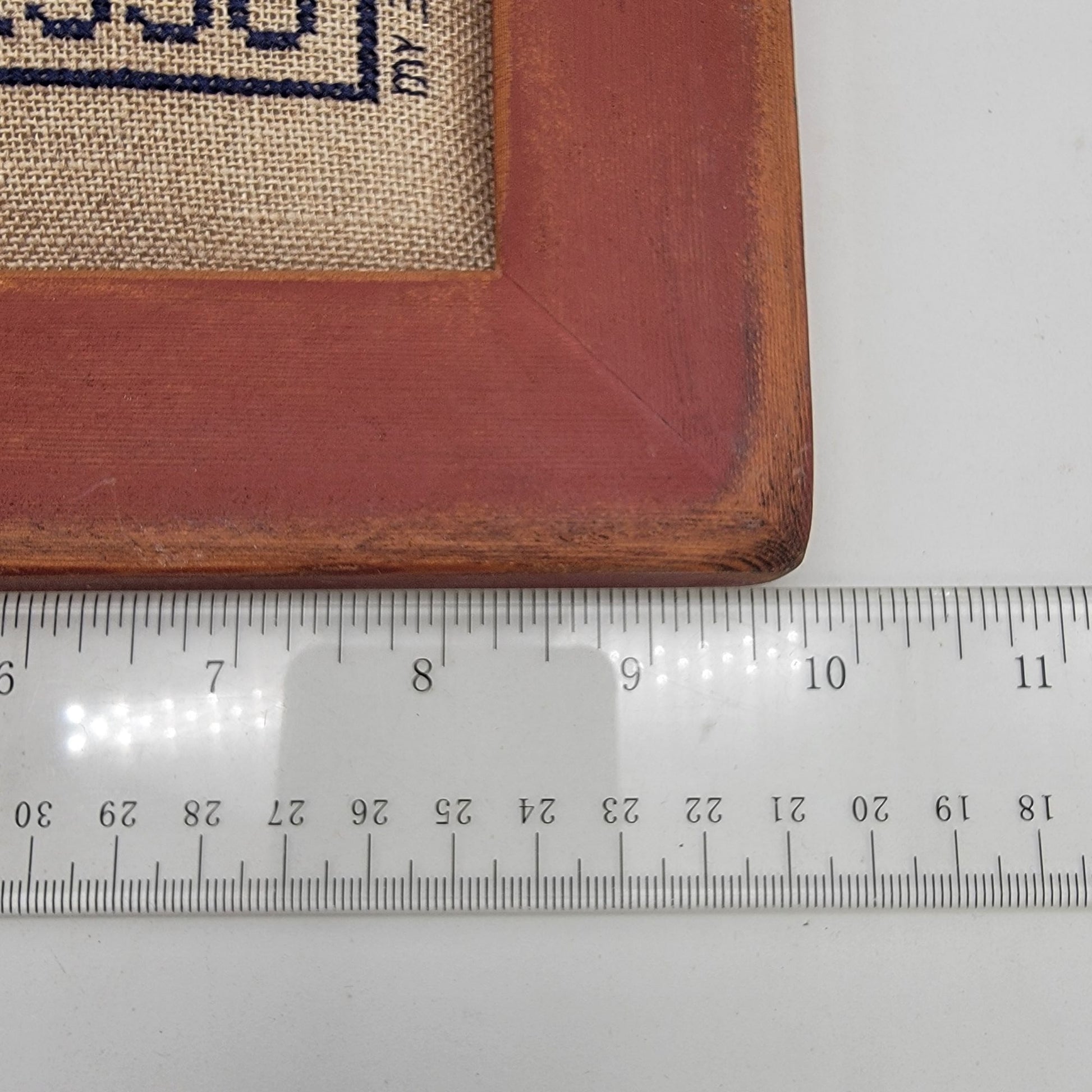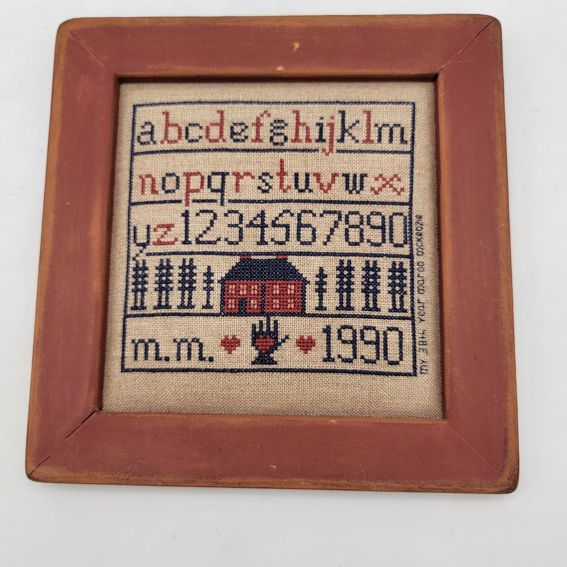 This vintage 1990 cross stitch sampler features a rustic design of alphabets, numbers, and a charming house motif. Signed and framed for timeless decor.