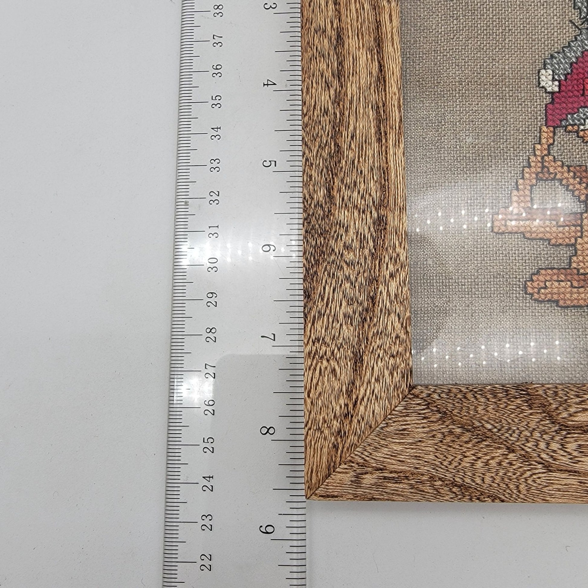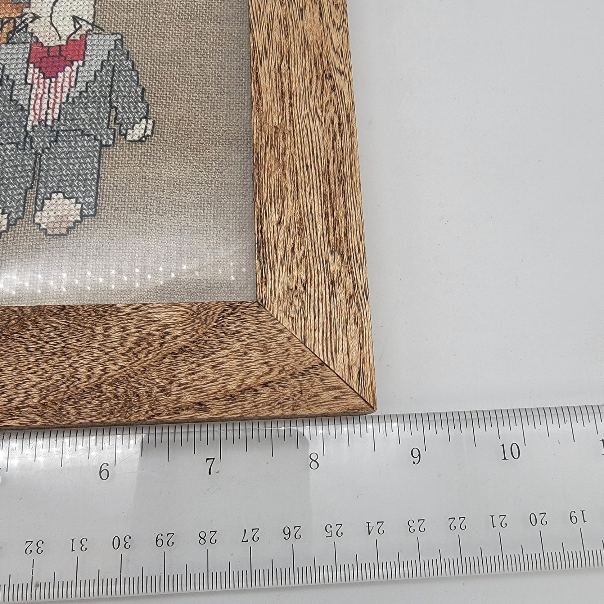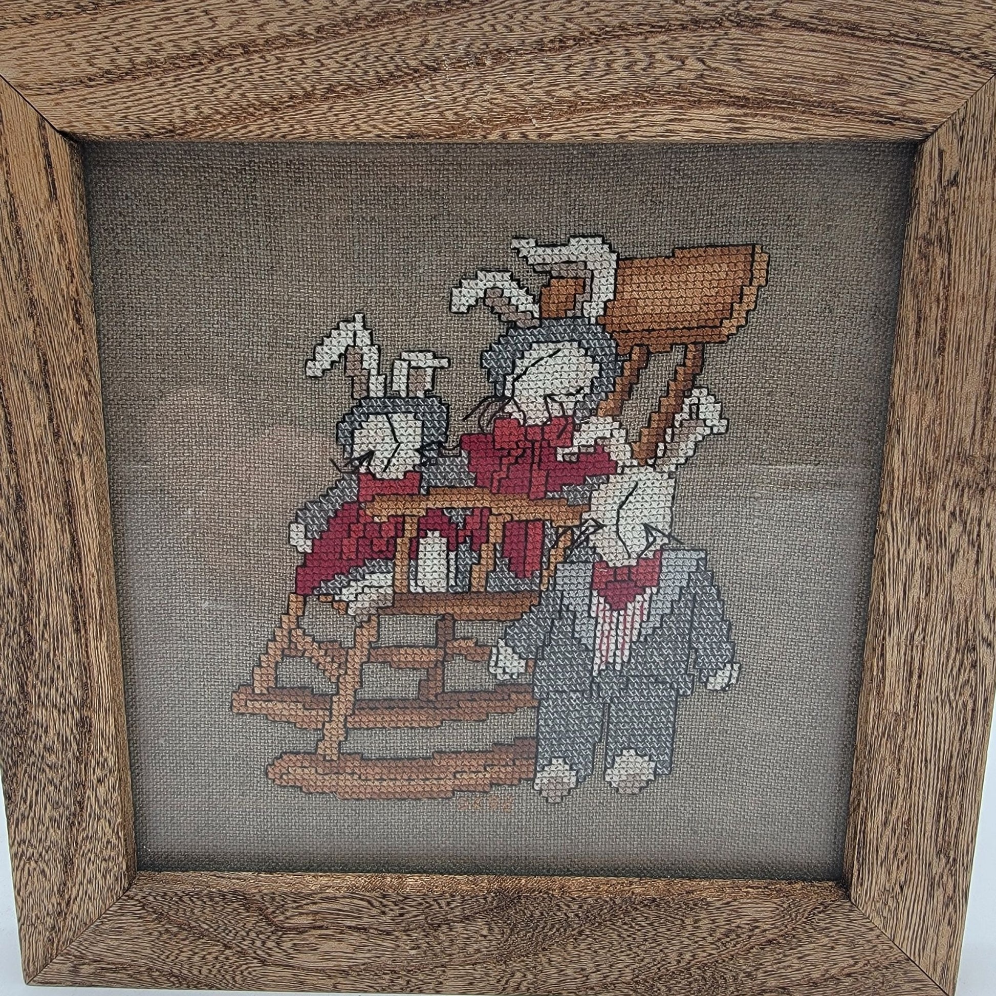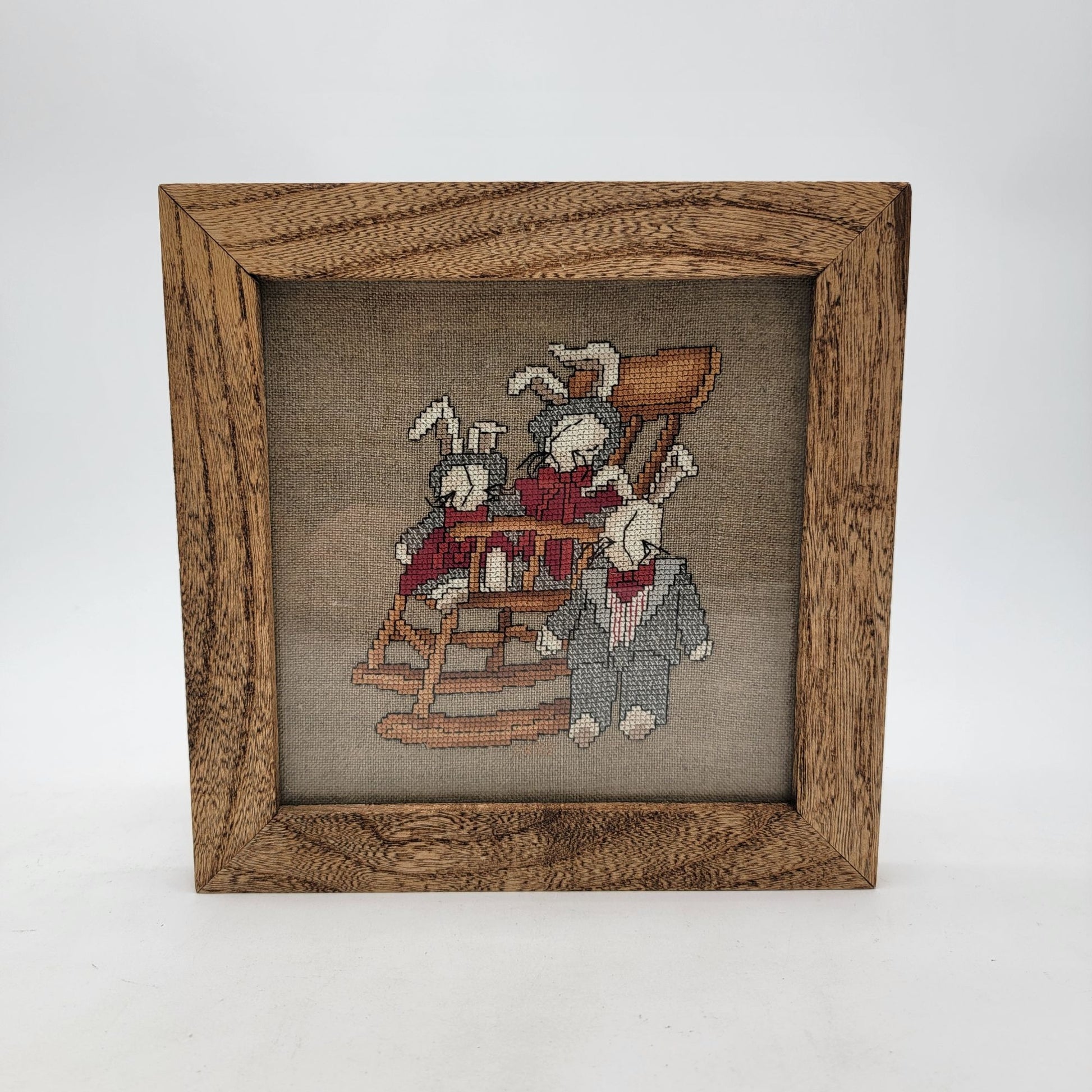 A charming vintage piece featuring a signed cross-stitch of whimsical bunny rabbits. Framed in a rustic hickory wood frame, adding timeless character.