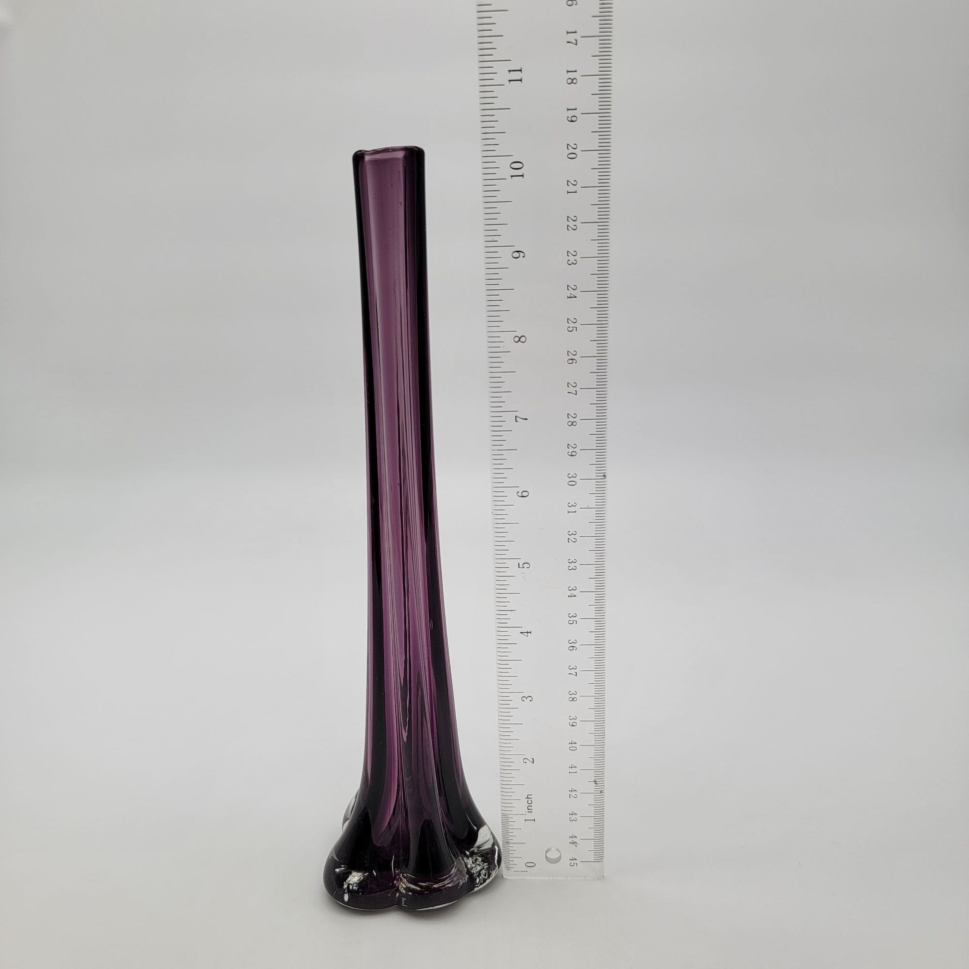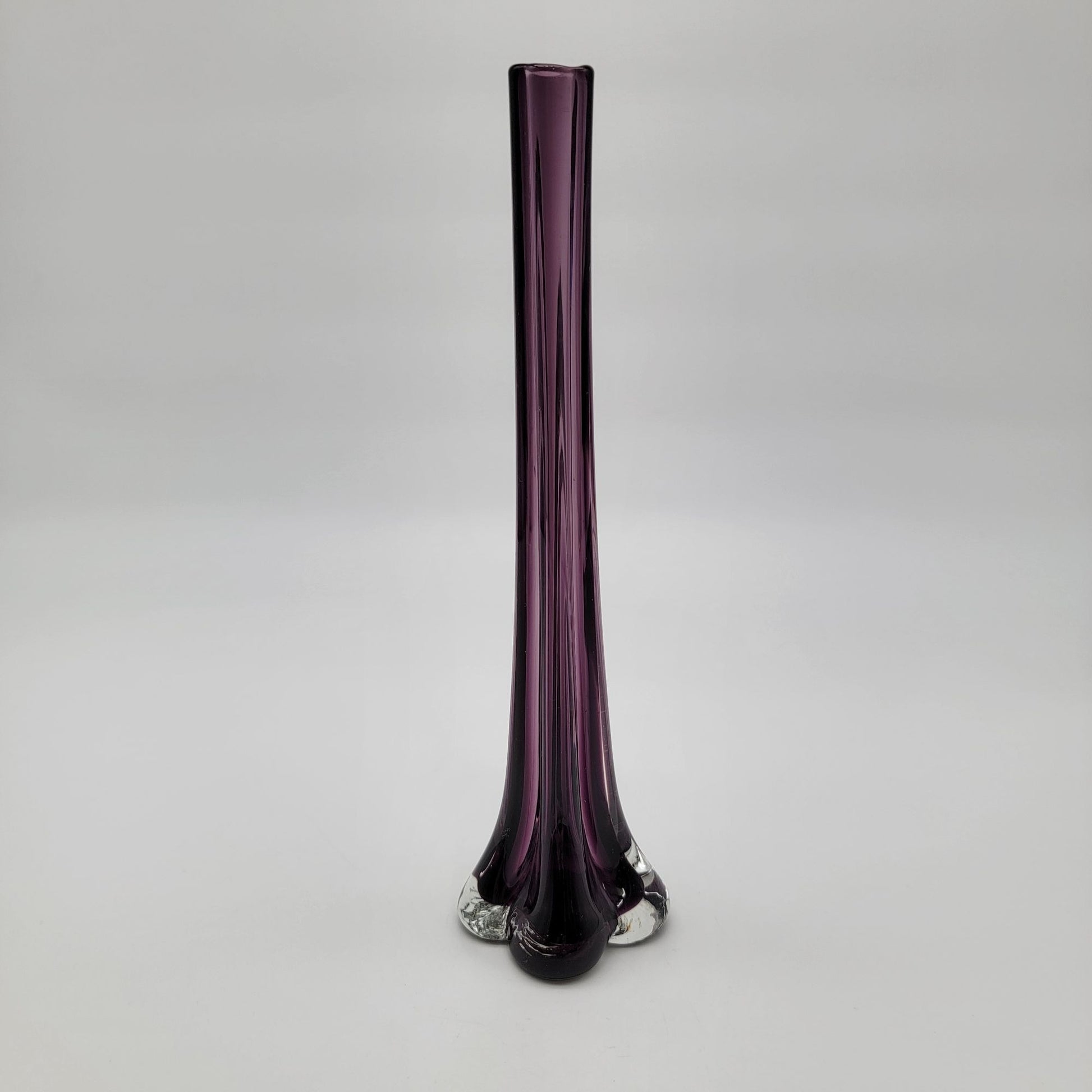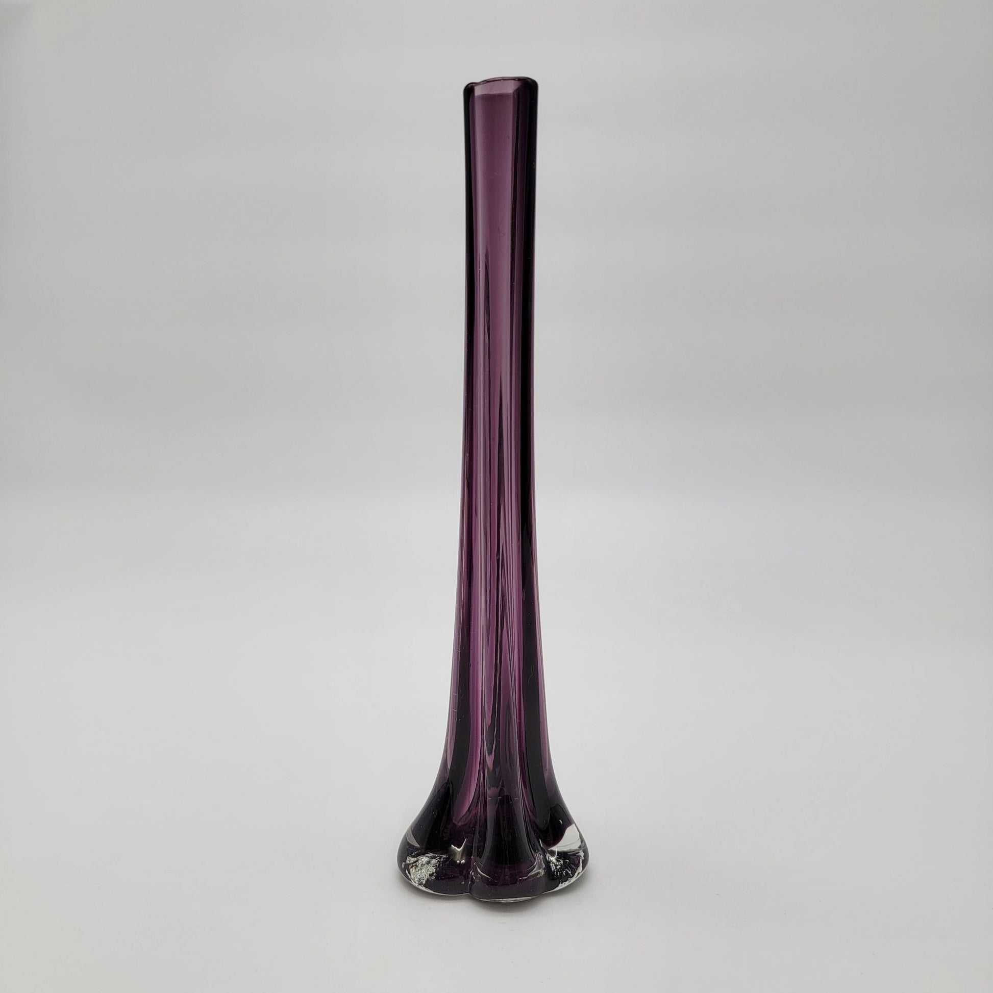 The elegance of this vintage art glass vase lies in its deep amethyst hue and unique elephant-footed base. Standing tall at 10.25 inches, its seamless design and delicate curves evoke a timeless charm. Perfect as a centerpiece or decorative accent, its craftsmanship showcases the beauty of hand-blown artistry.