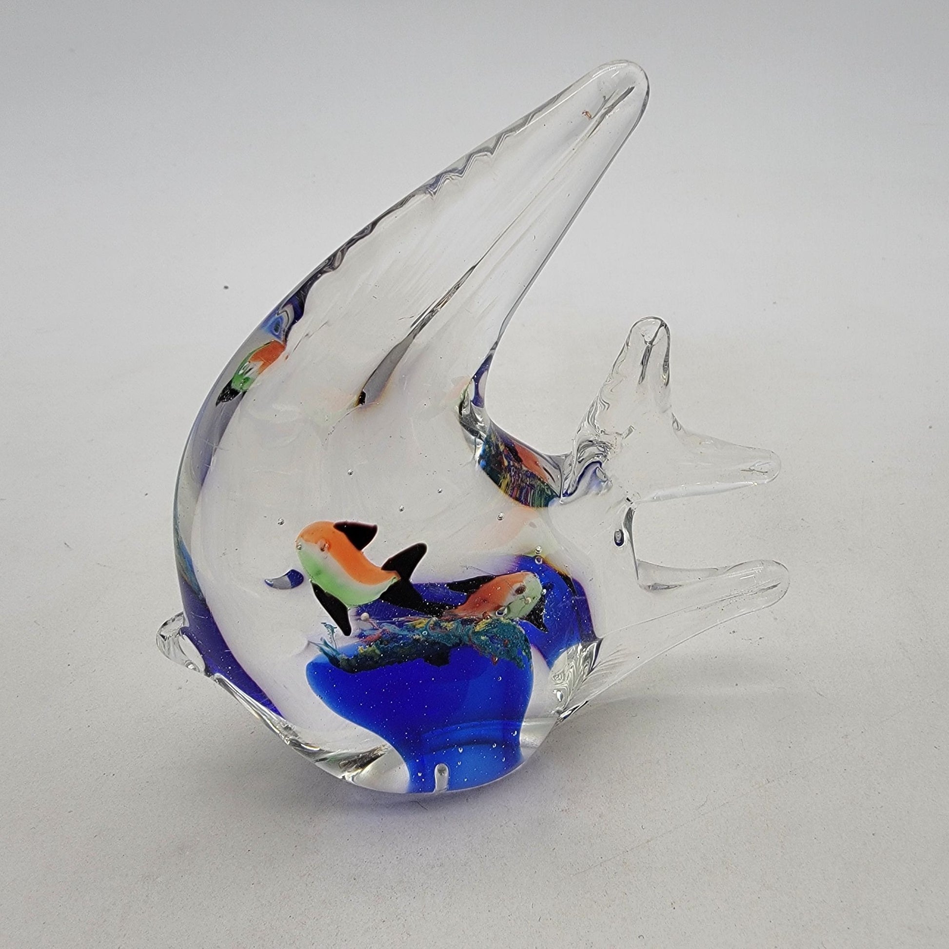 This charming vintage piece showcases the artistry of Italian glassmaking with a delicate angel fish design and vibrant aquarium scene.