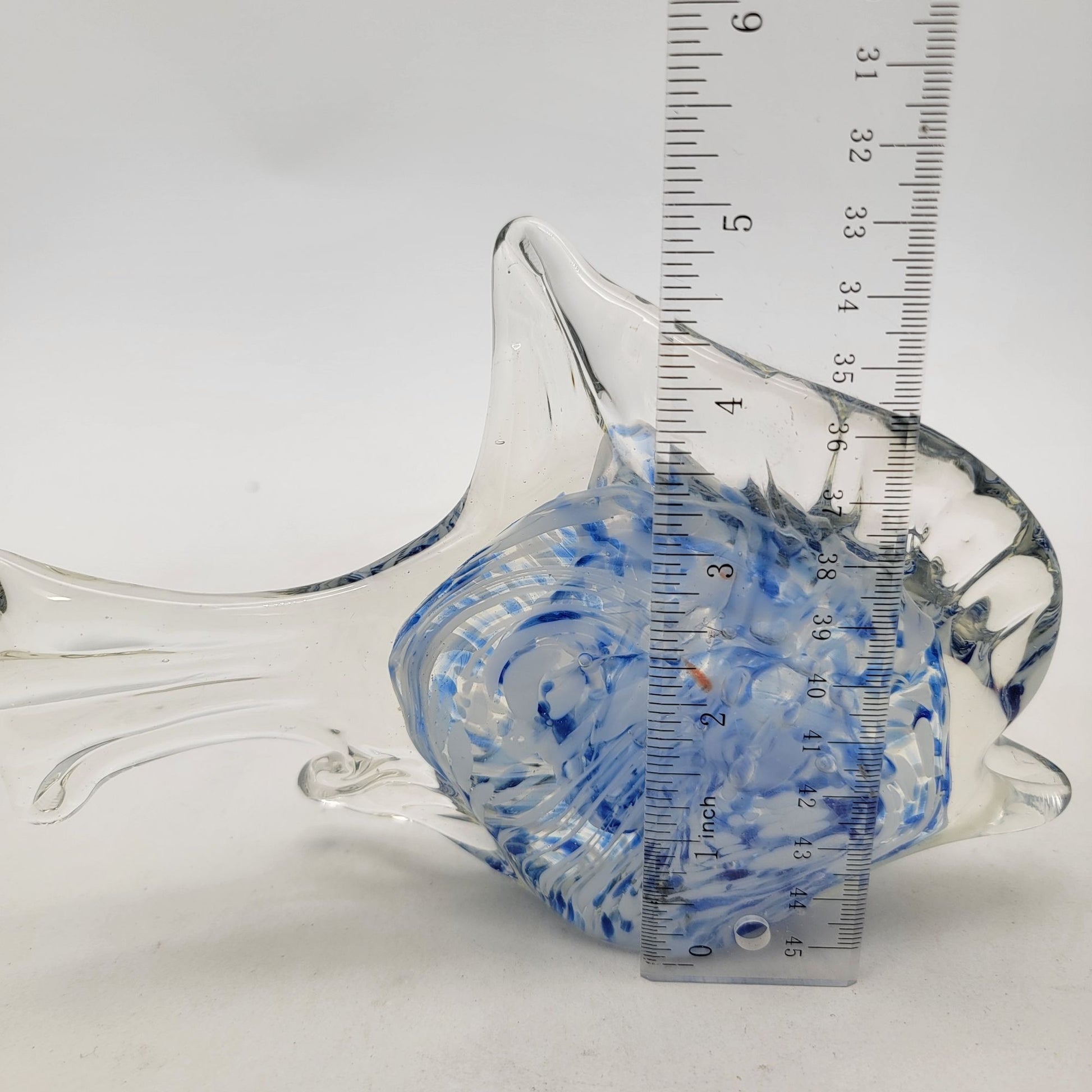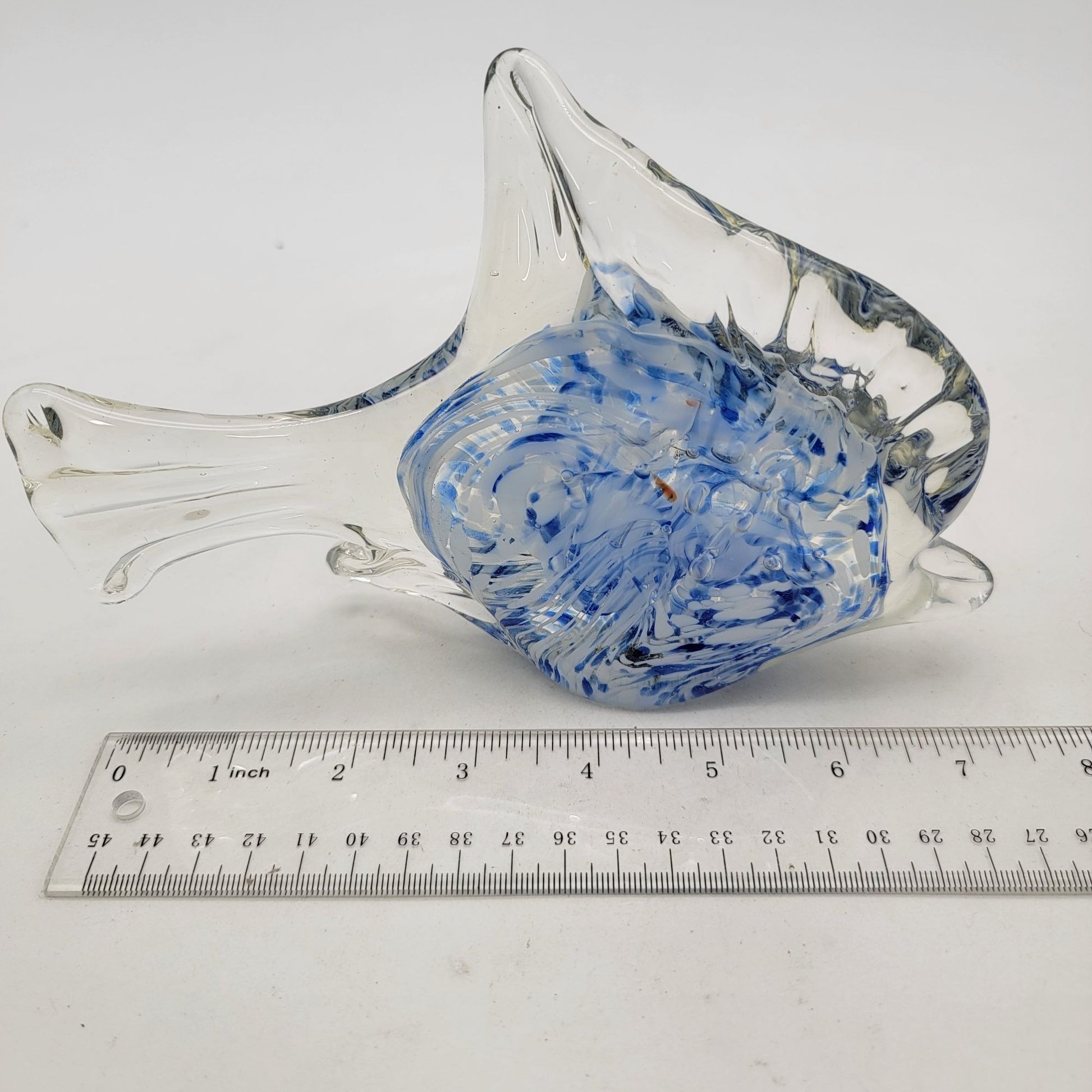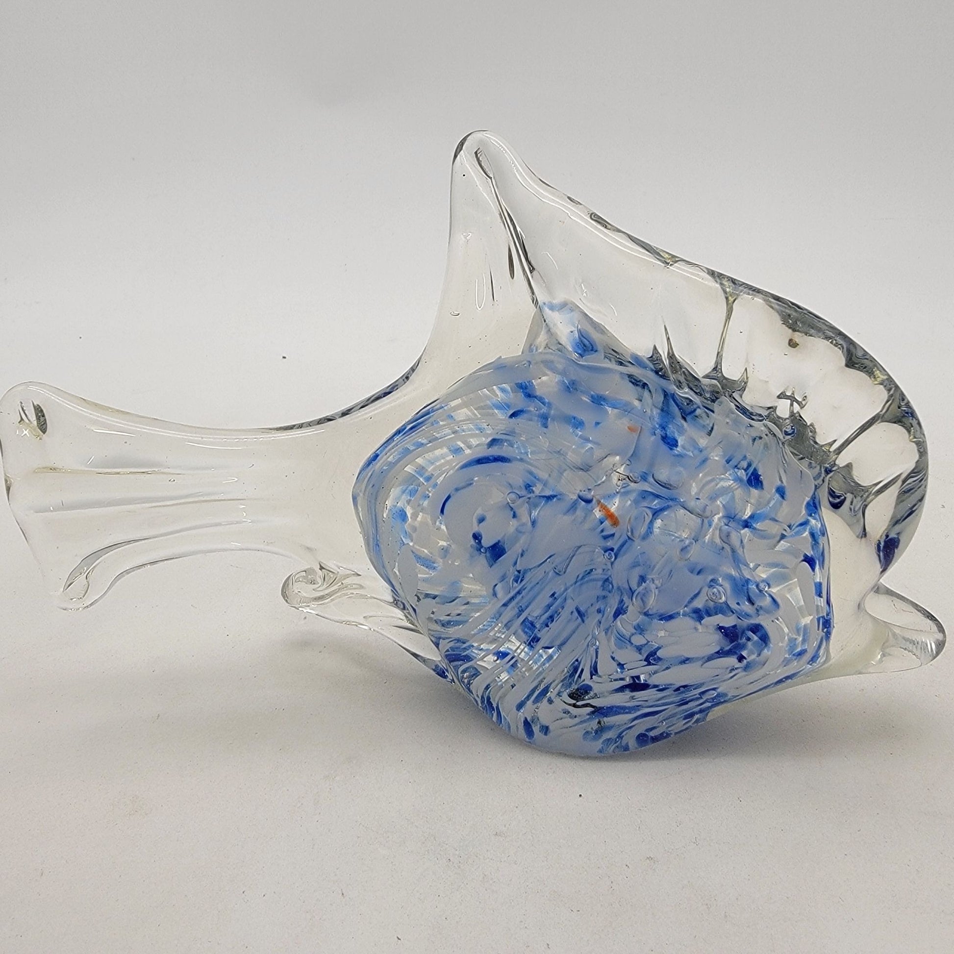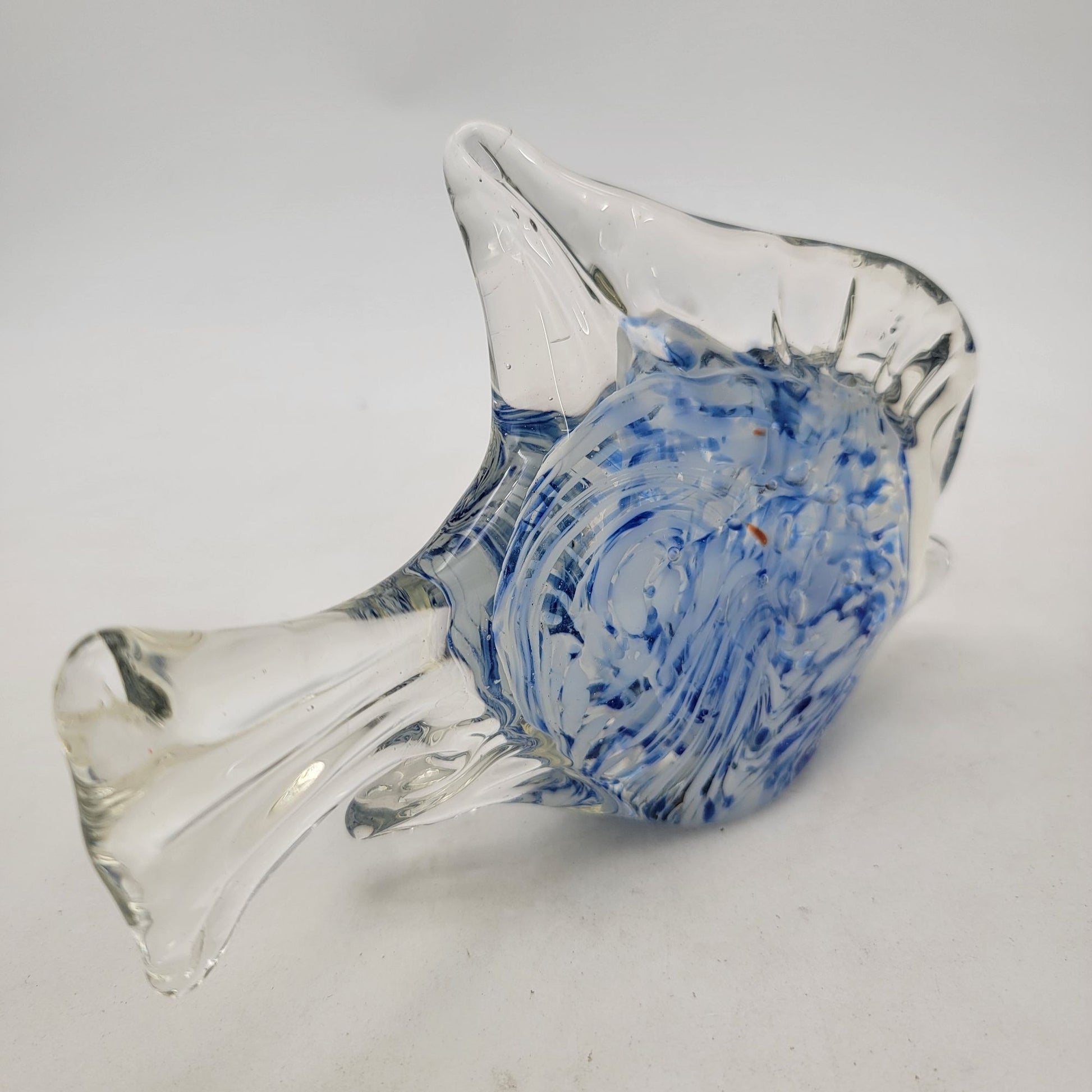 This vintage hand-crafted art glass angel fish sculpture features a striking blue and clear cased design, showcasing artistic swirled patterns in a timeless aesthetic.