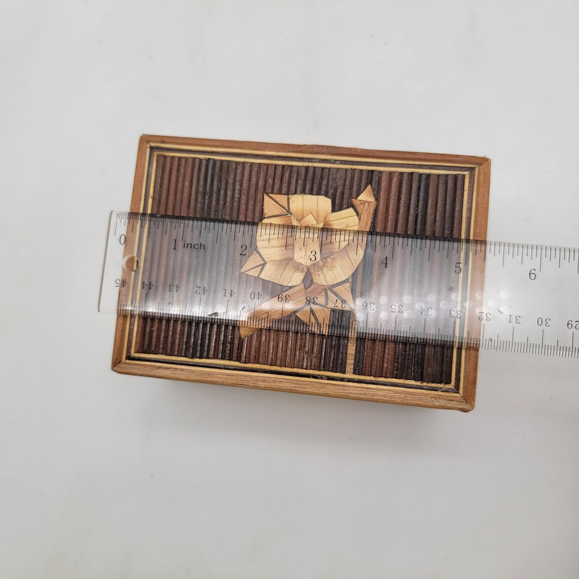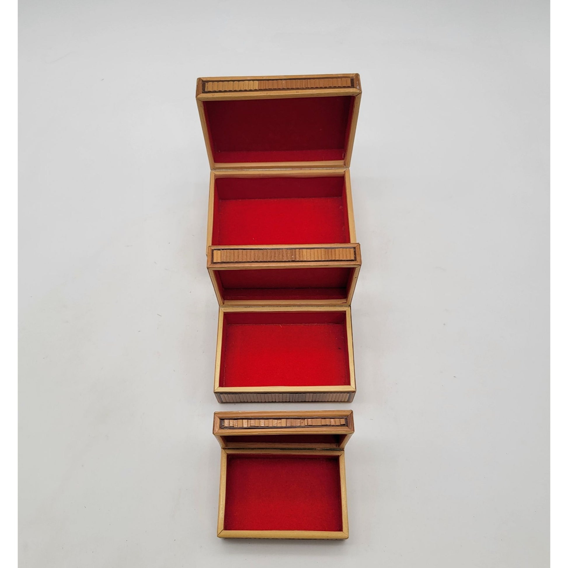 This exquisite set of vintage bamboo marquetry trinket boxes features intricate craftsmanship. The bamboo material and floral marquetry design evoke timeless elegance. The nesting design allows for compact storage, making them a practical yet decorative addition to any collection. Red velvet lining adds a touch of luxury.