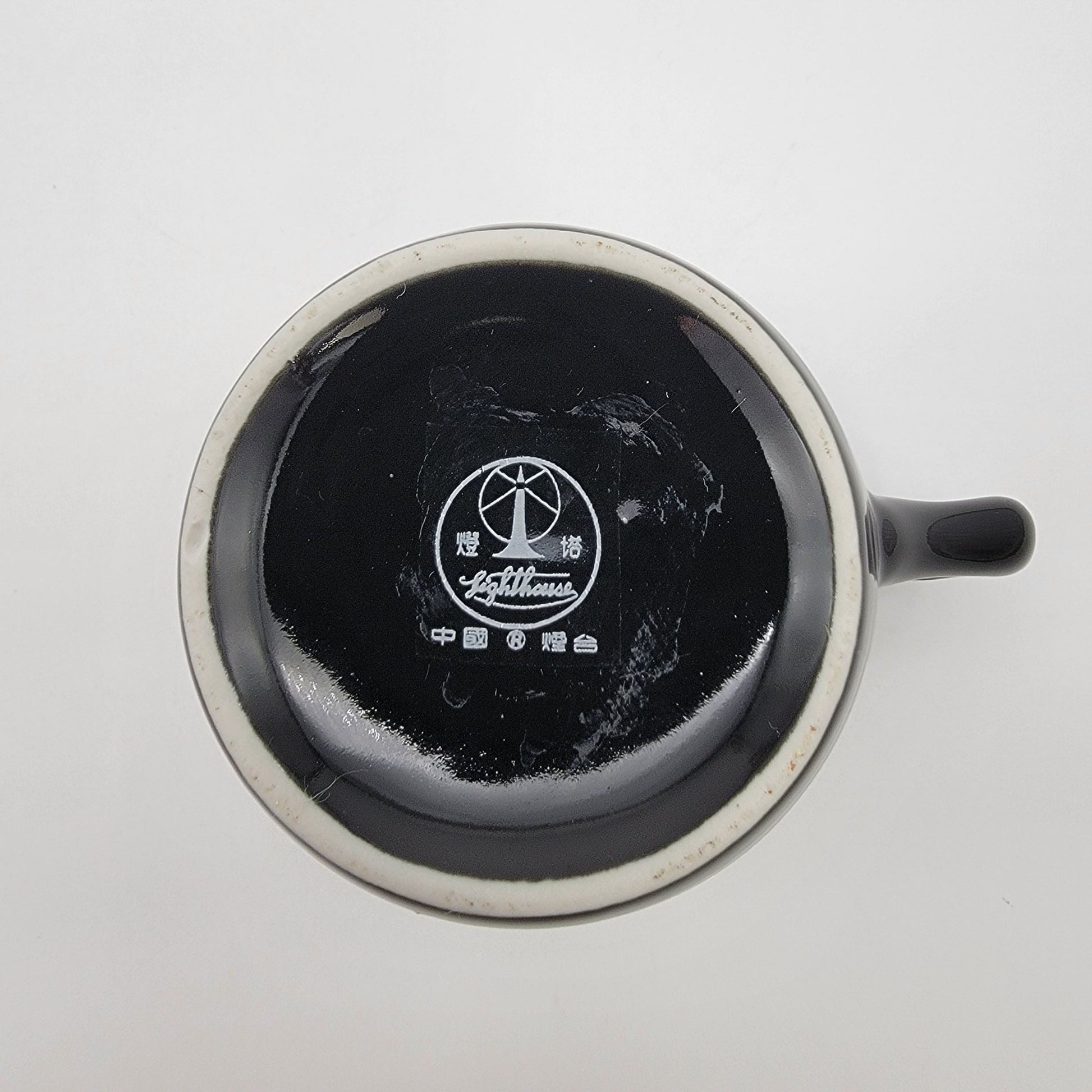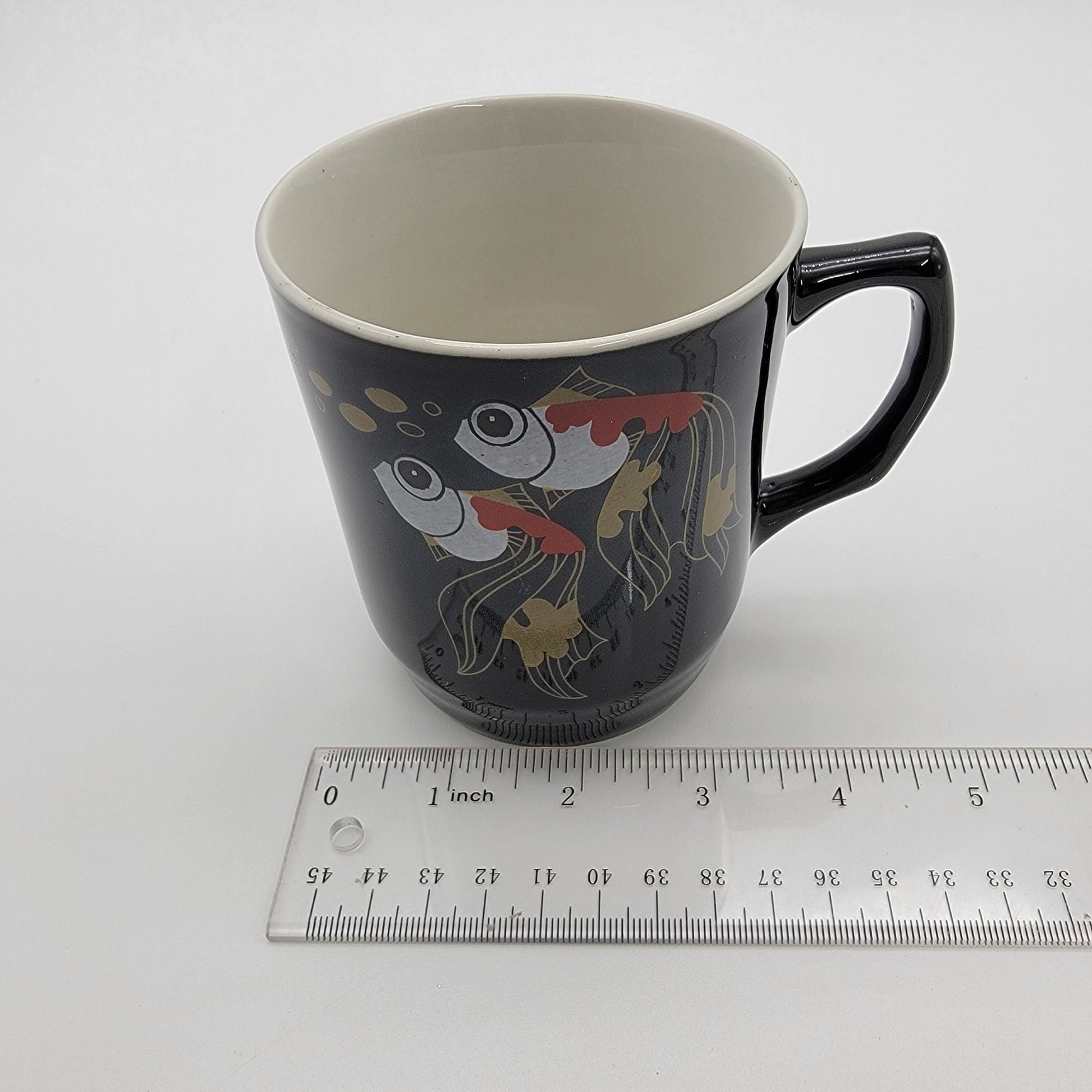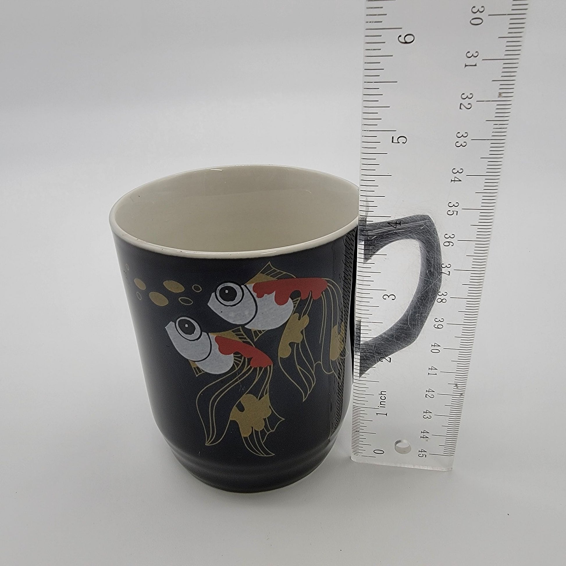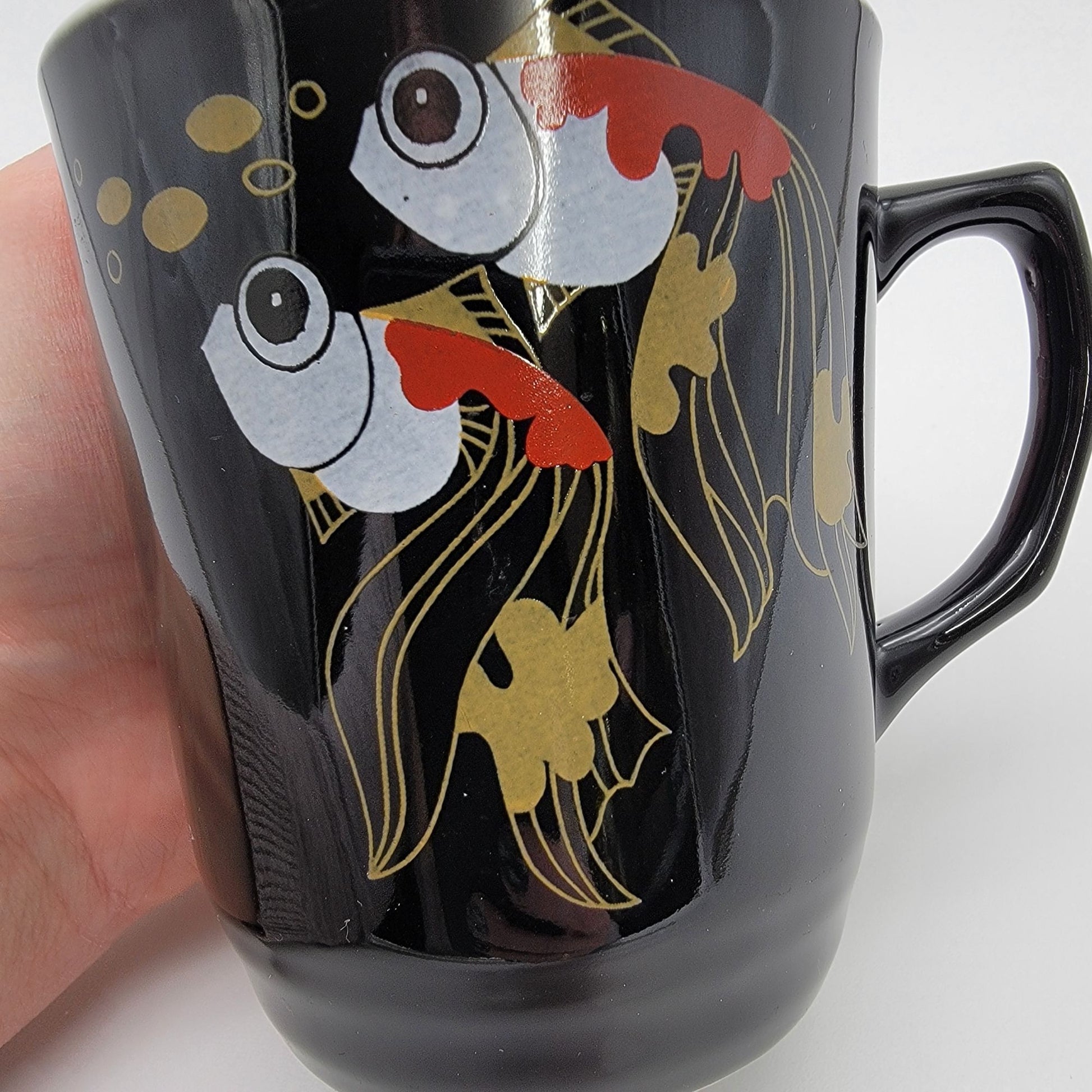 This vintage porcelain mug features a sleek black finish and a detailed goldfish design with elegant long fins. Ideal for coffee or tea enthusiasts.