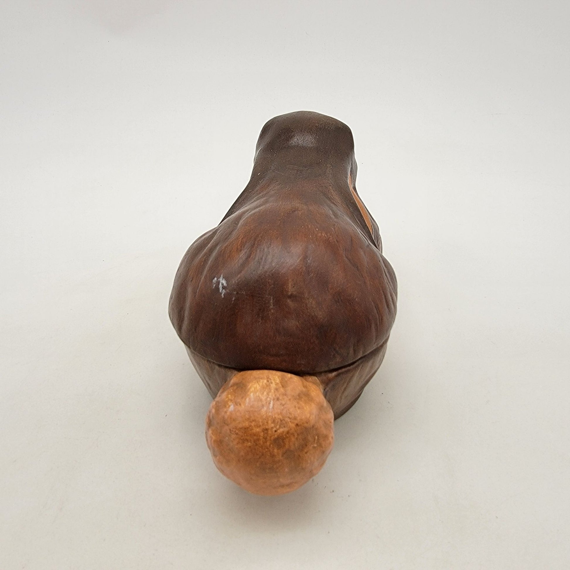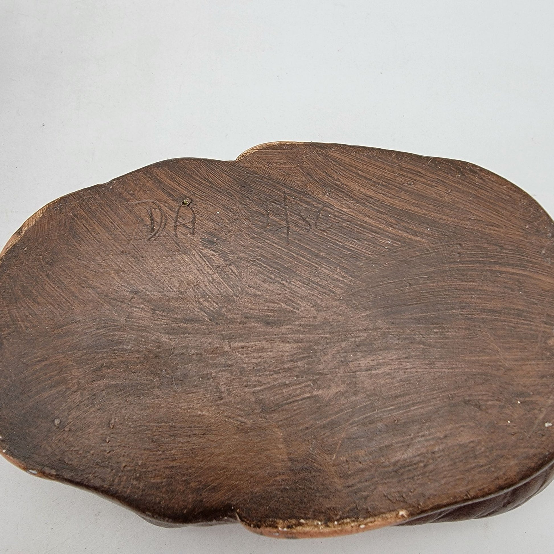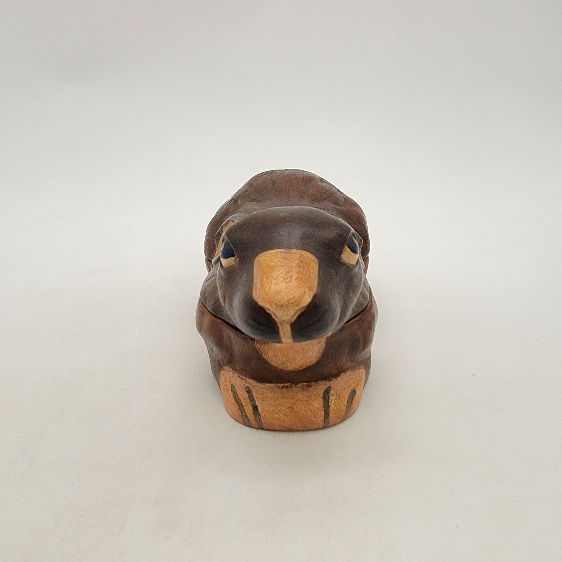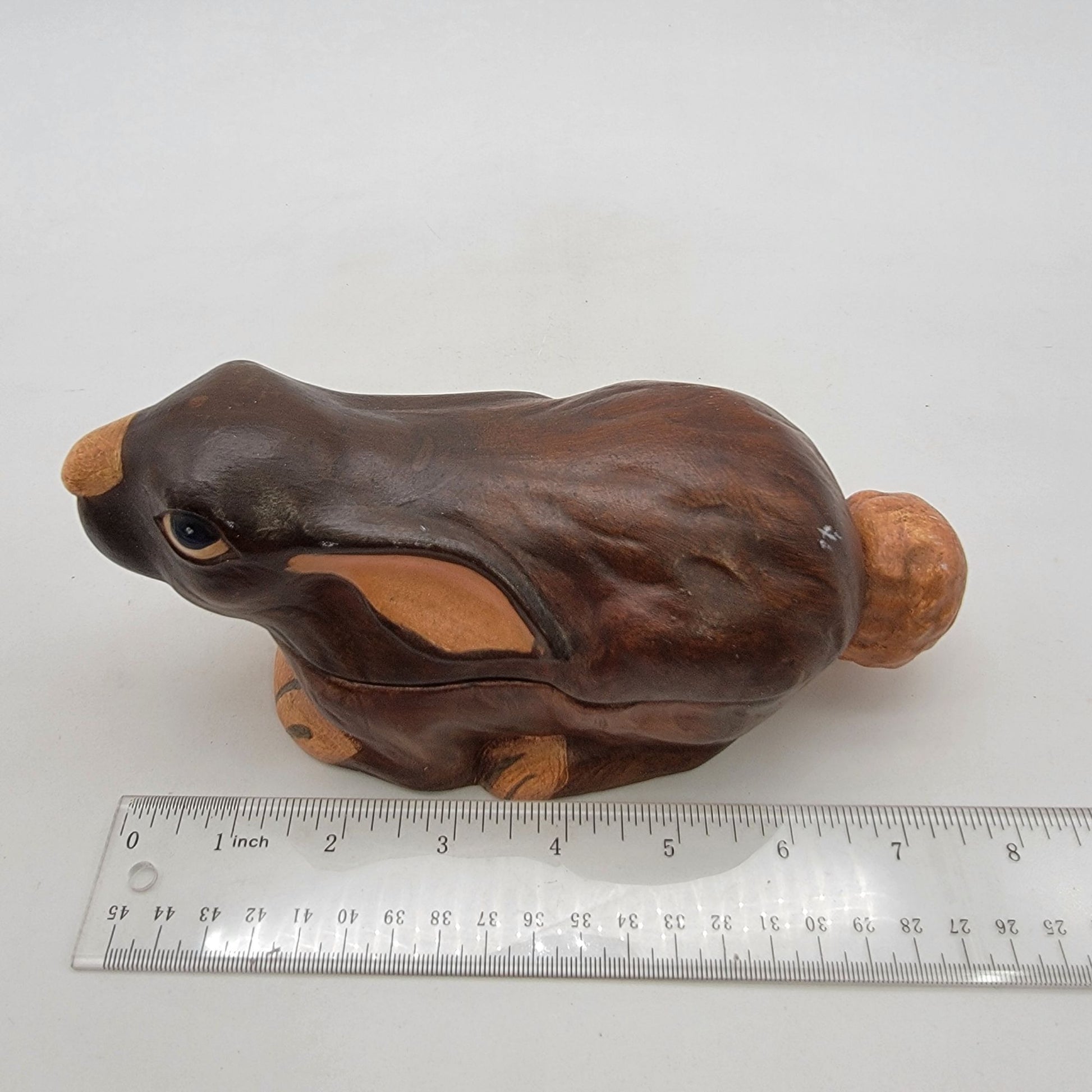 This handpainted ceramic bunny dish exudes vintage charm. Its rustic craftsmanship and signed detailing make it a delightful collectible or functional decor piece.