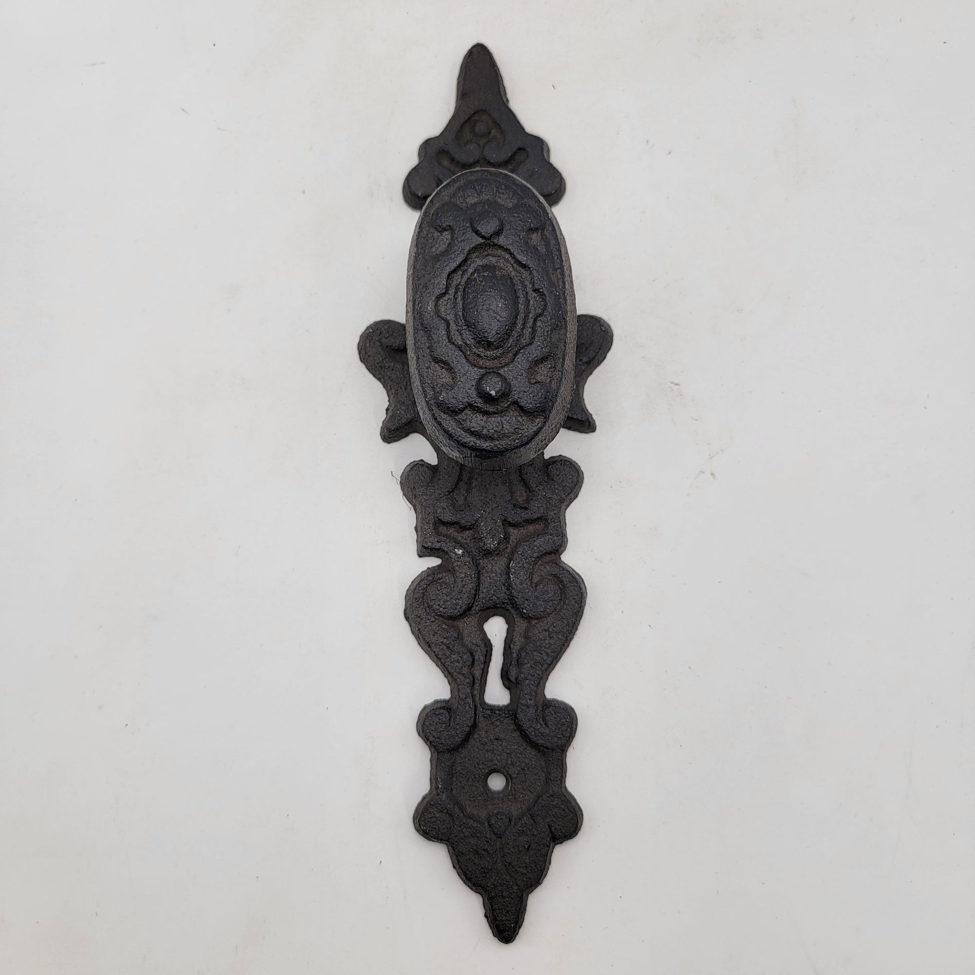 Embodying the elegance of vintage craftsmanship, this cast iron door knob backplate features intricate designs that evoke an old-world charm. Its robust build ensures durability while adding a touch of nostalgia and sophistication to any door.