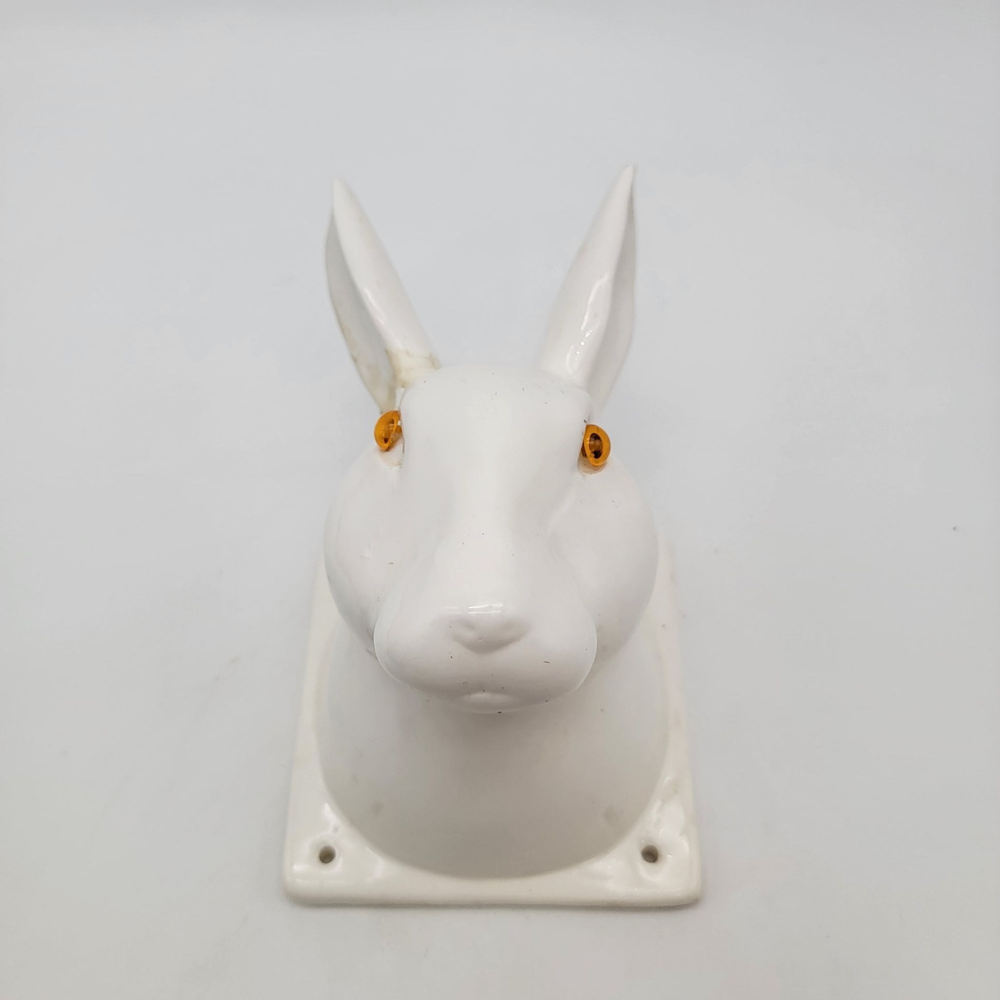 This charming ceramic rabbit wall mount features striking orange eyes and a glossy white finish, evoking a whimsical vintage aesthetic. Ideal for adding character to any space, this piece serves as a delightful conversation starter. With its intricate detailing and unique design, it embodies a classic yet playful style reminiscent of bygone eras.