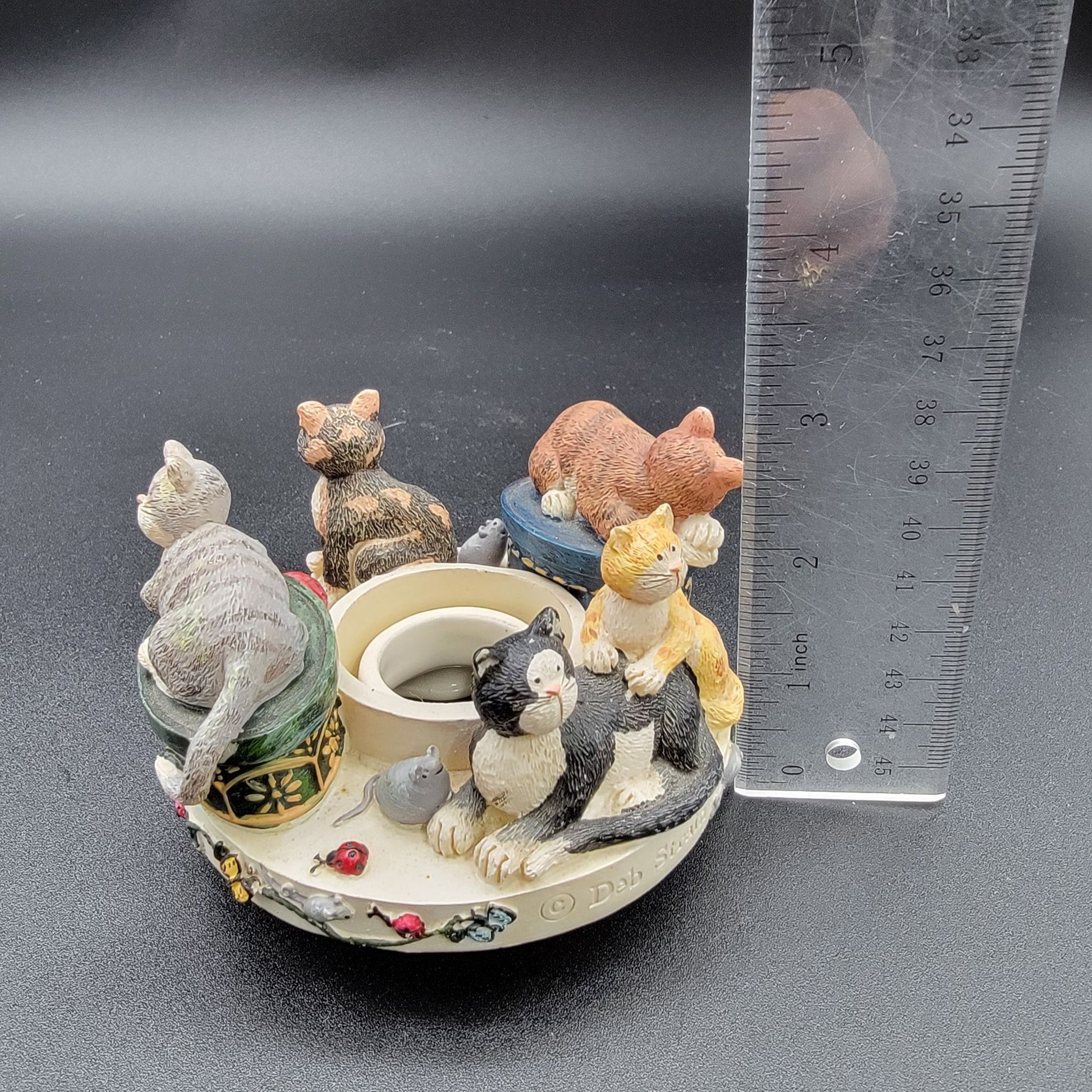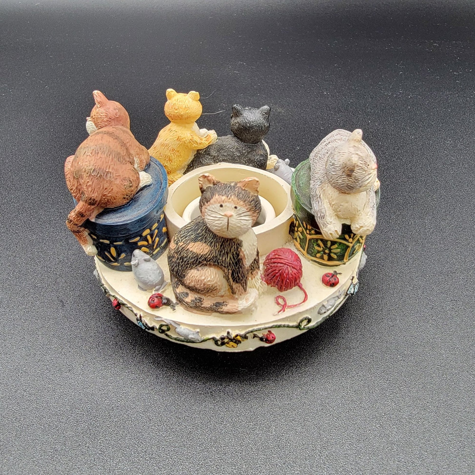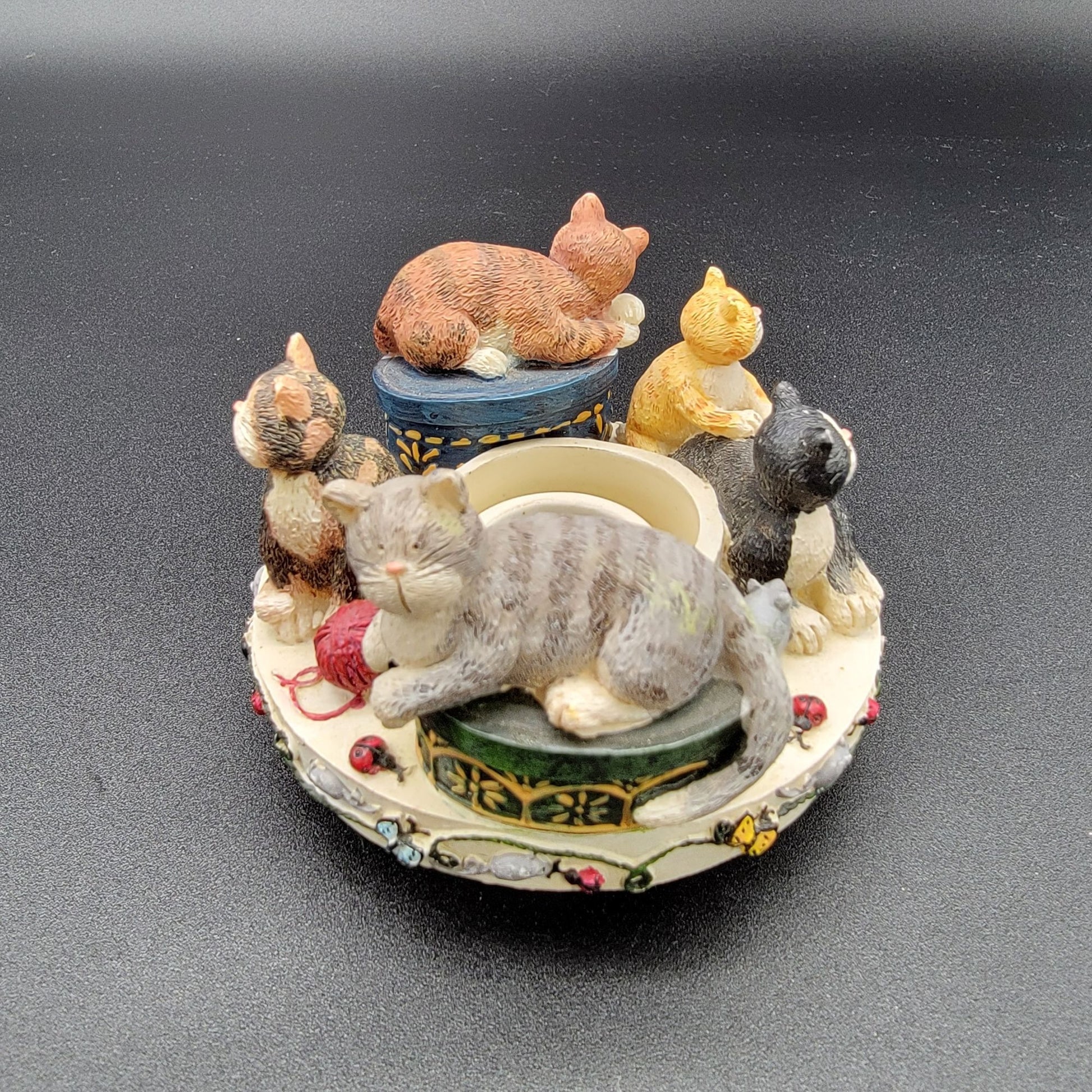A charming vintage 1990s Deb Strain "Candle Capper" featuring playful cats surrounding a candle jar topper. Adds a whimsical touch to any decor.