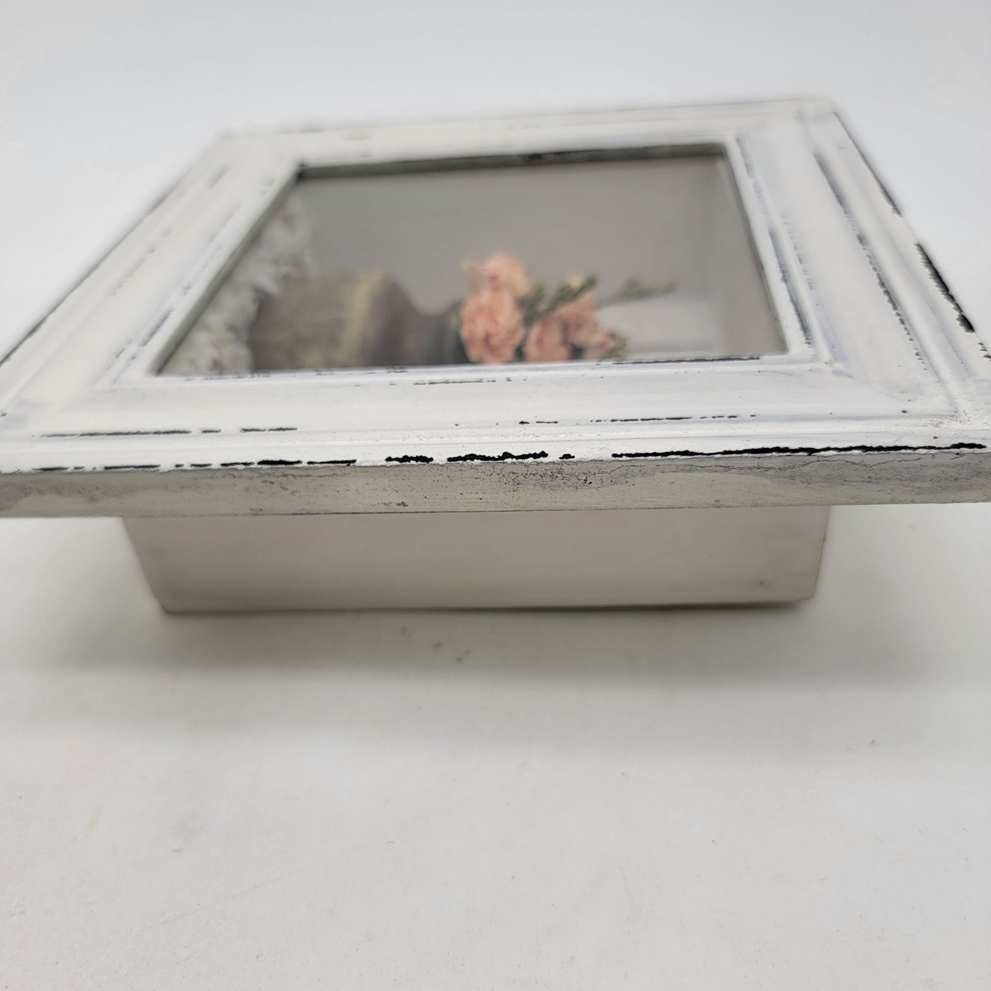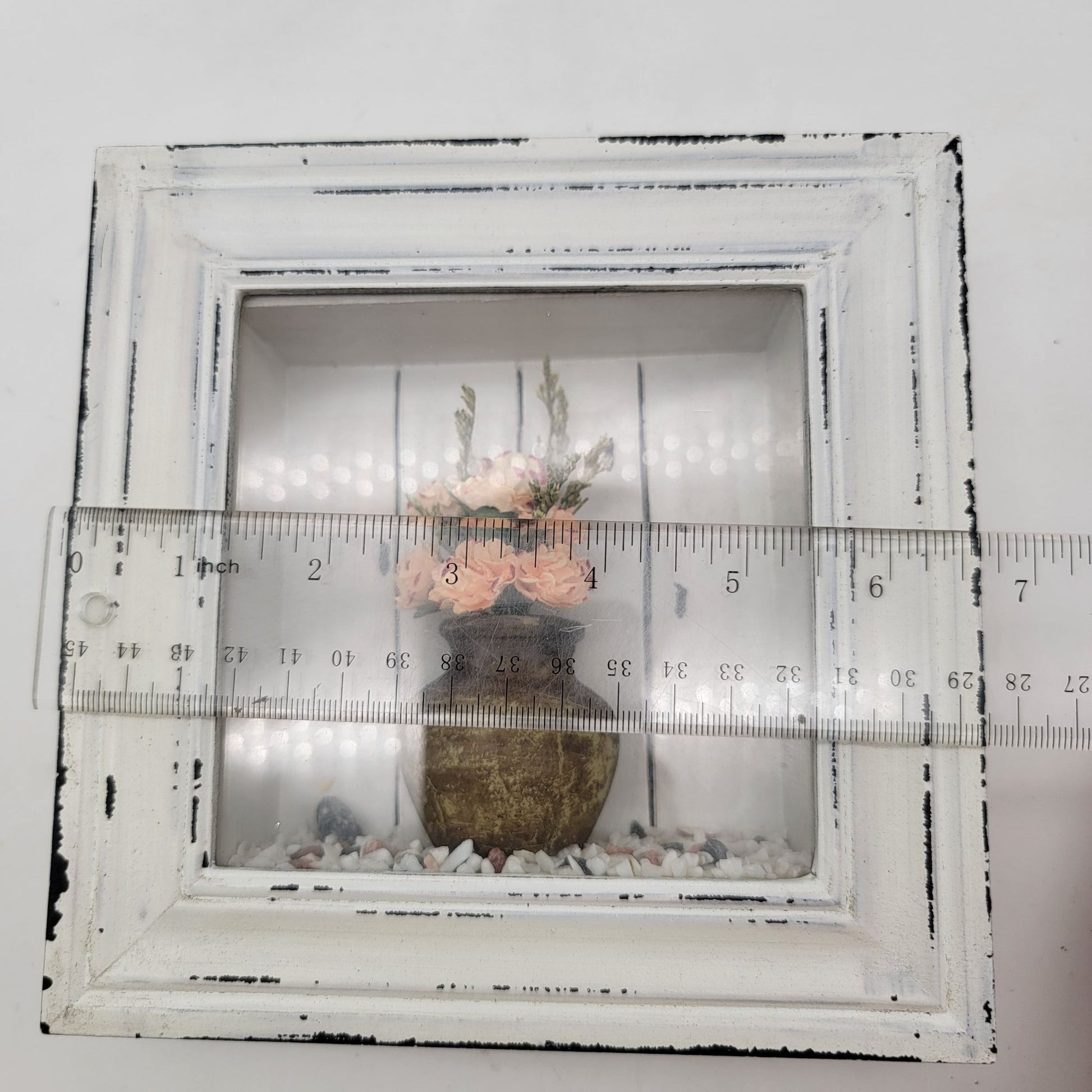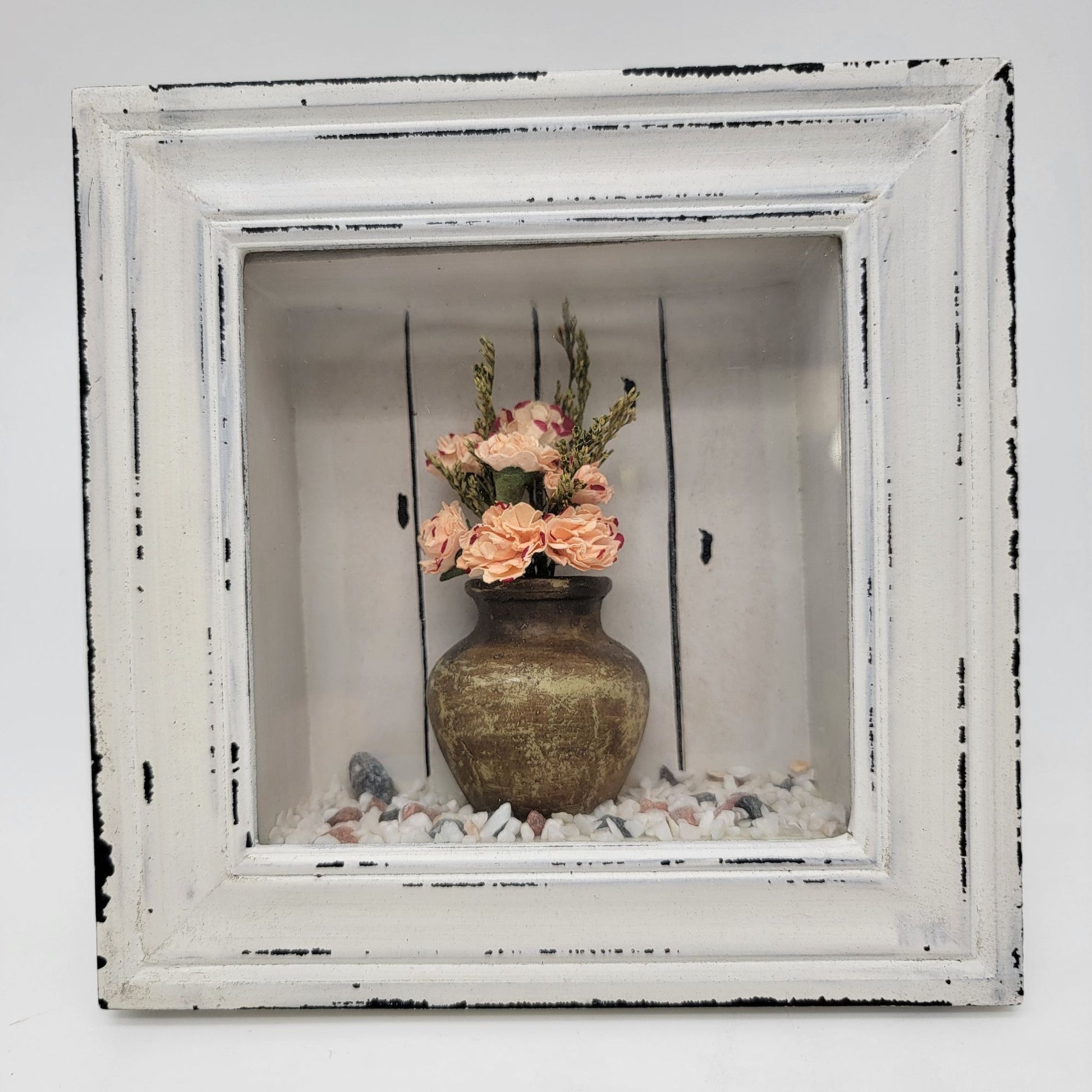 This charming vintage wall art piece from the past embodies the elegance of a bygone era. The shadowbox features delicate pink carnations arranged in a rustic vase, capturing the timeless beauty of floral arrangements. Its distressed white frame adds to its antique appeal, making it a delightful addition to classic home decor.