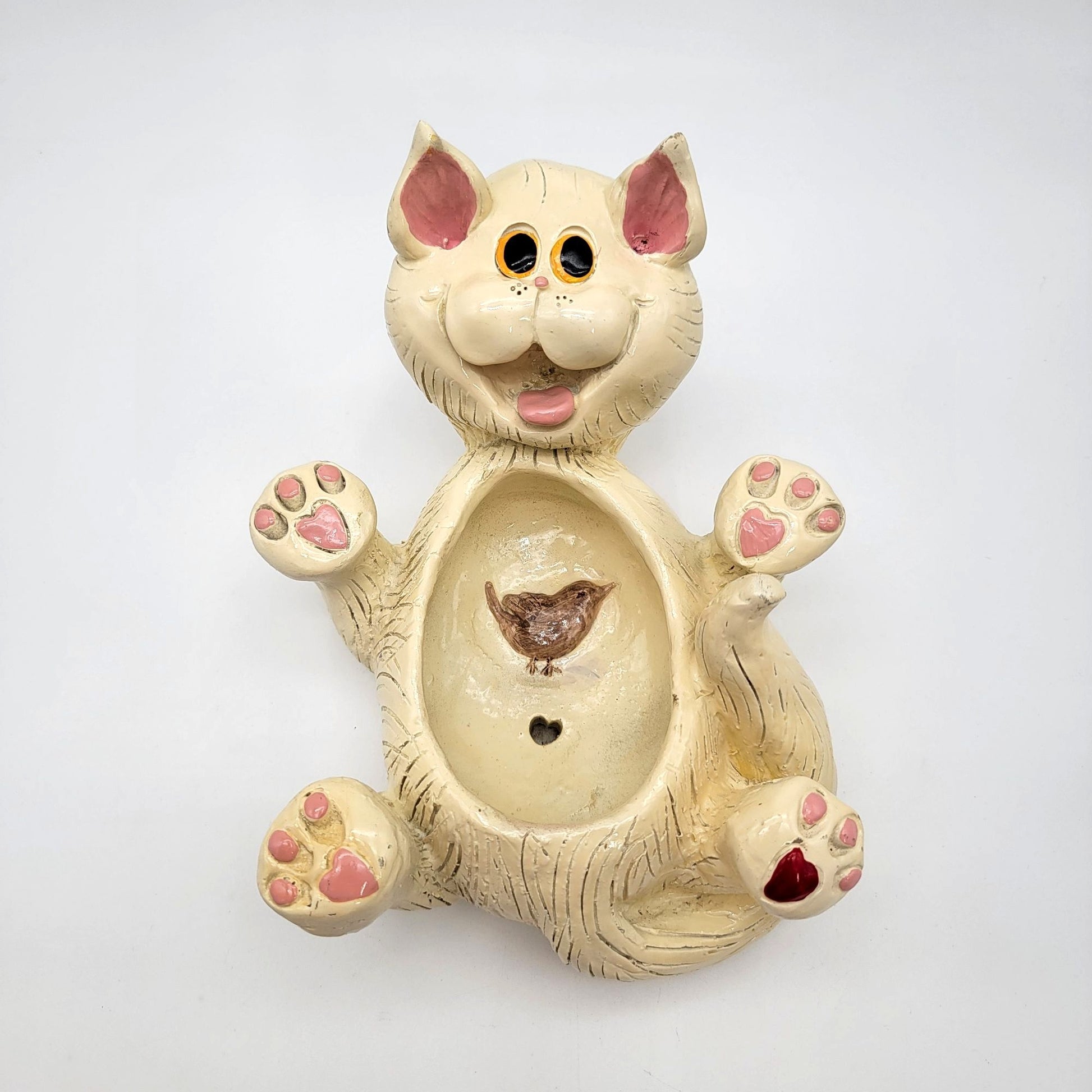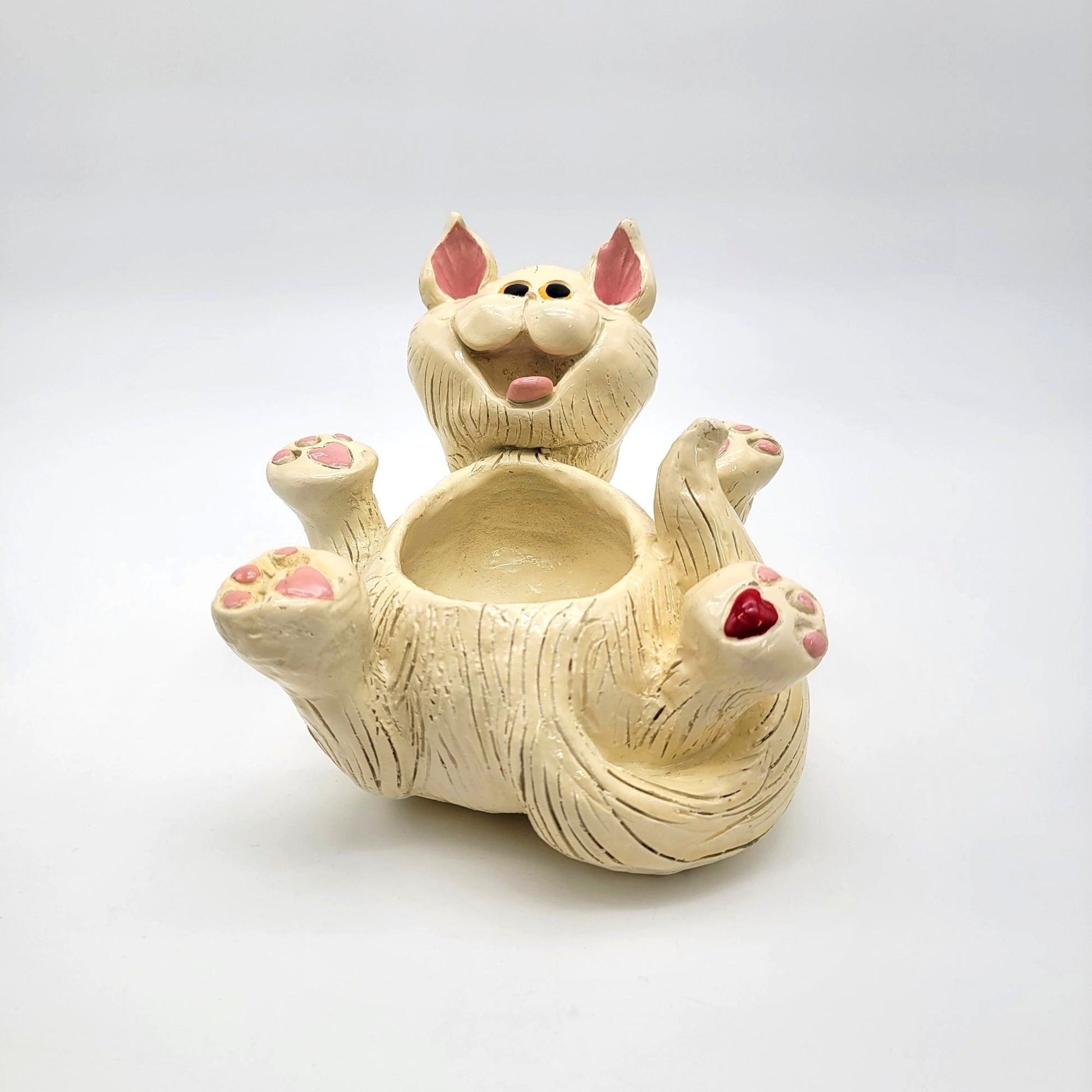 This playful resin planter brings a whimsical touch to your space. This cheerful cat showcases detailed craftsmanship and is perfect for holding small plants or trinkets. Its unique design makes it a charming collector's piece for cat enthusiasts and art lovers alike.