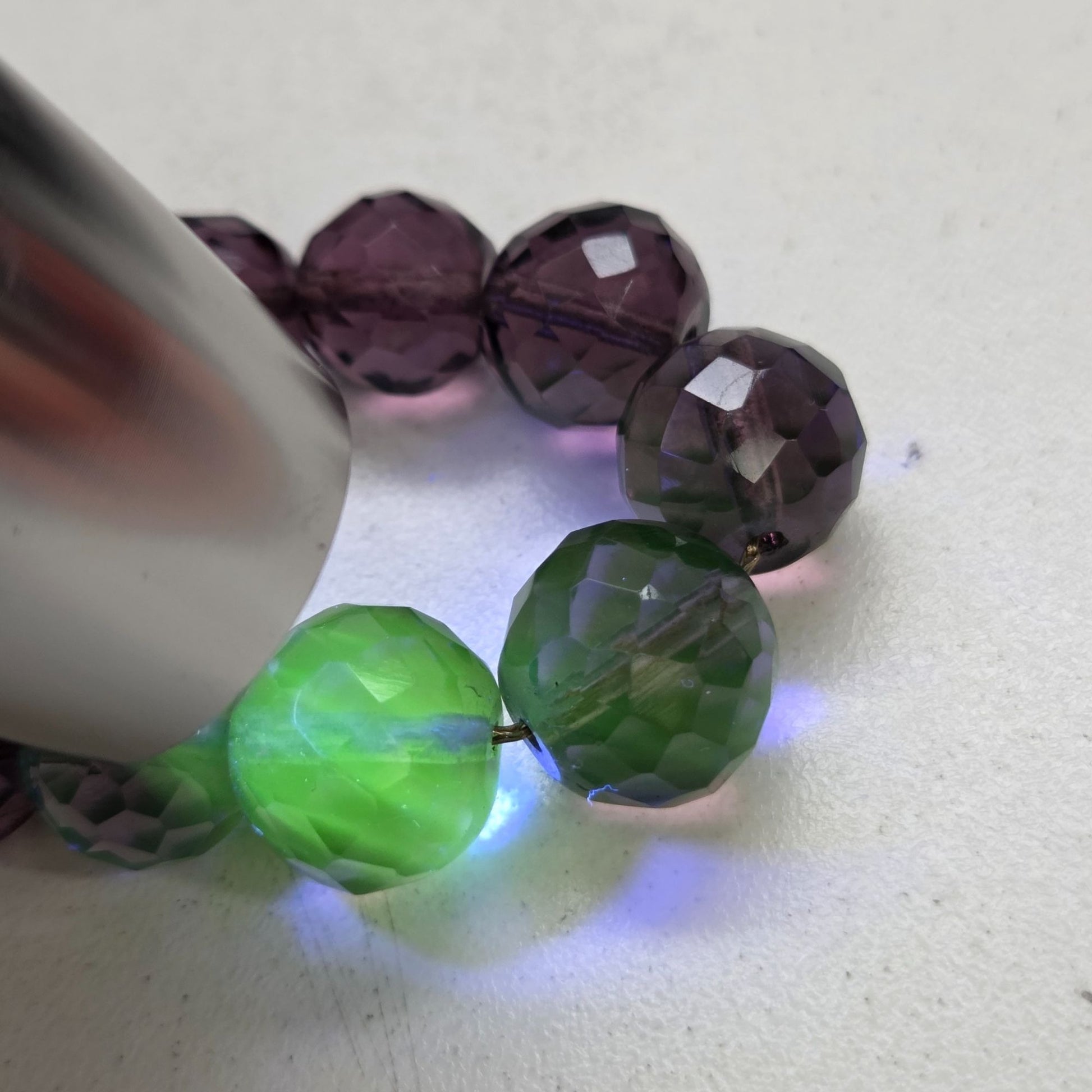 A timeless treasure, this vintage necklace showcases faceted amethyst-hued beads that flouresces under black light beautifully. Each bead exudes elegance, creating a graceful statement piece.
