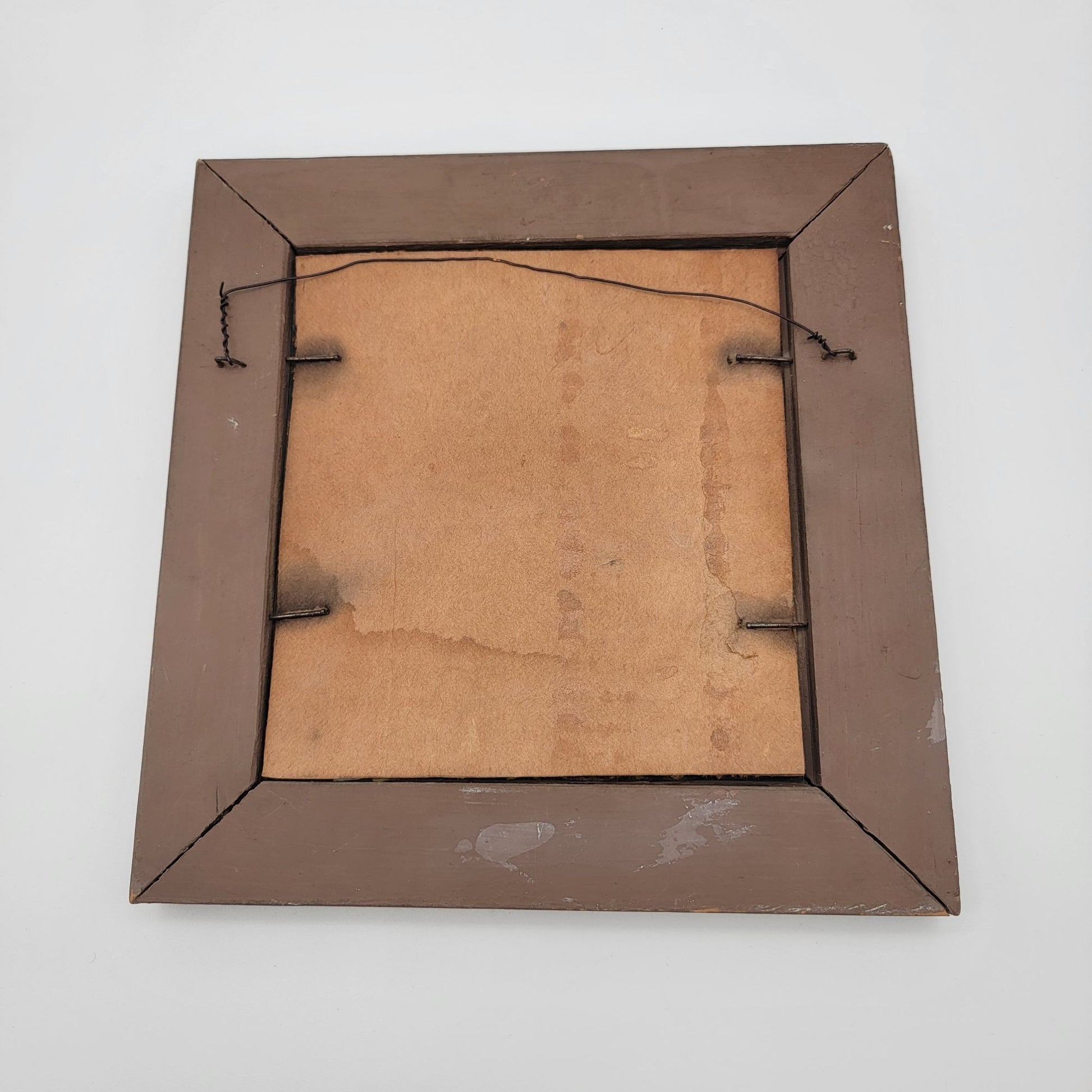 This vintage wall art features a high-relief copper depiction of a nude figure, professionally framed in a 9-inch square wooden frame.
