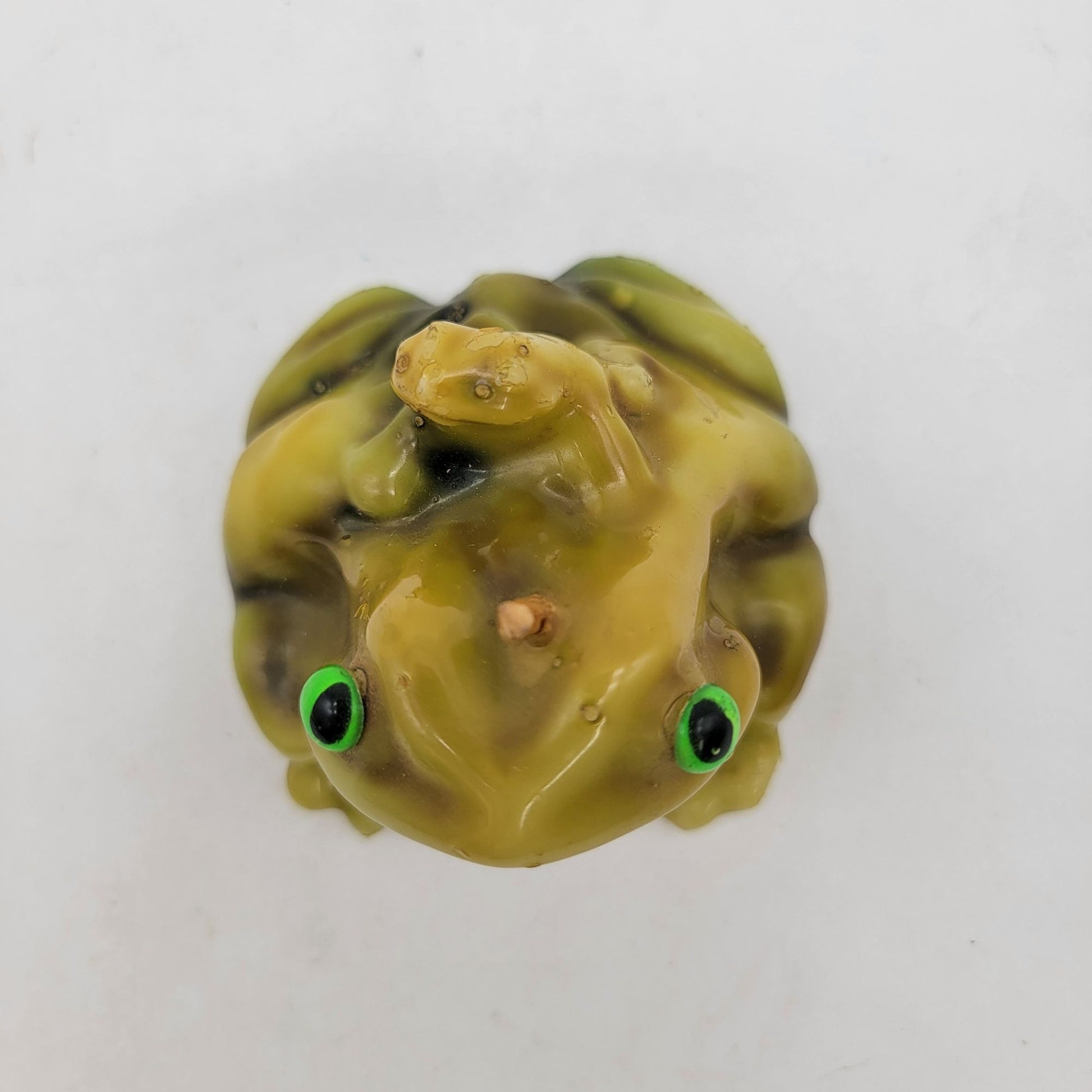 This charming candle tells the story of a nurturing mama frog protectively carrying her baby. A unique vintage piece from Maui, it embodies warmth and care. The vibrant green tones and intricate detailing make it a heartwarming addition to any collection or decor.