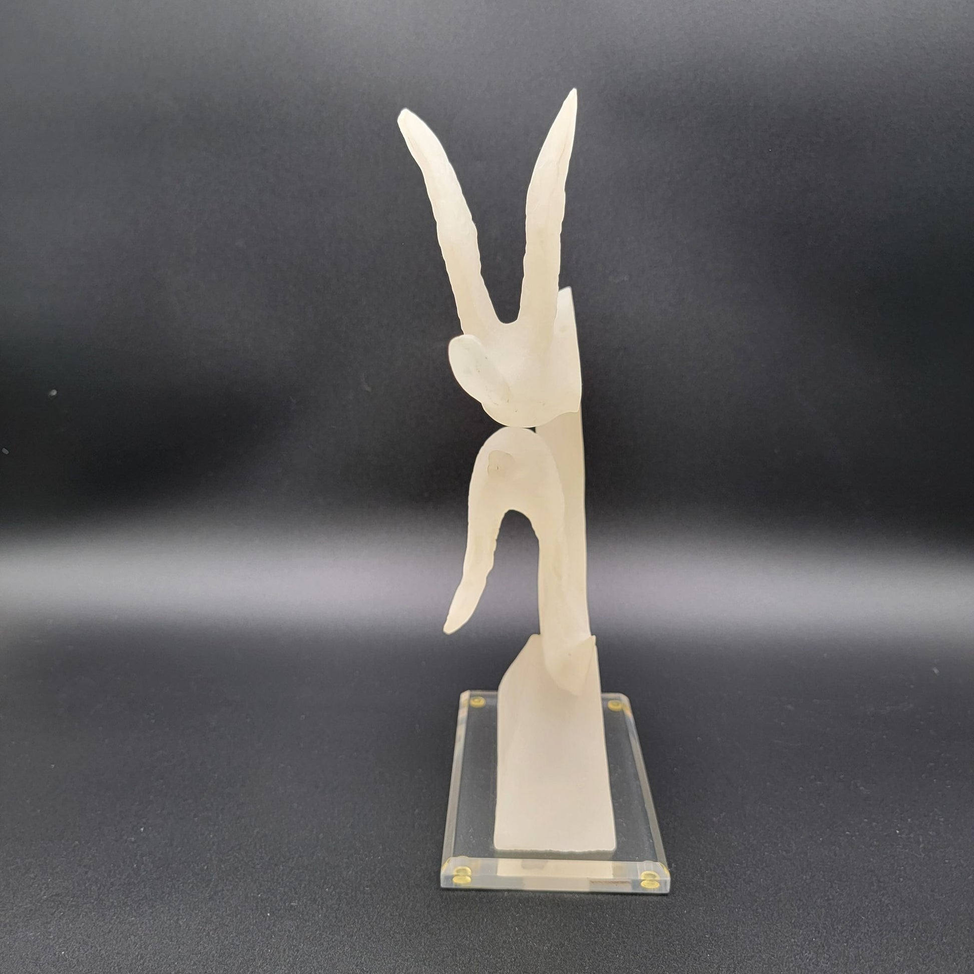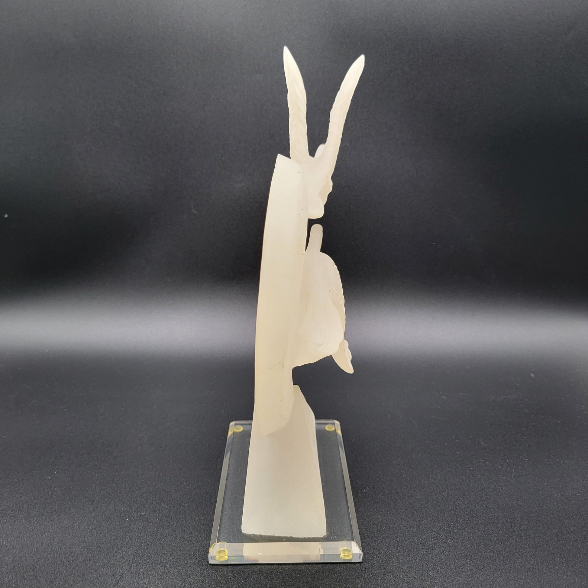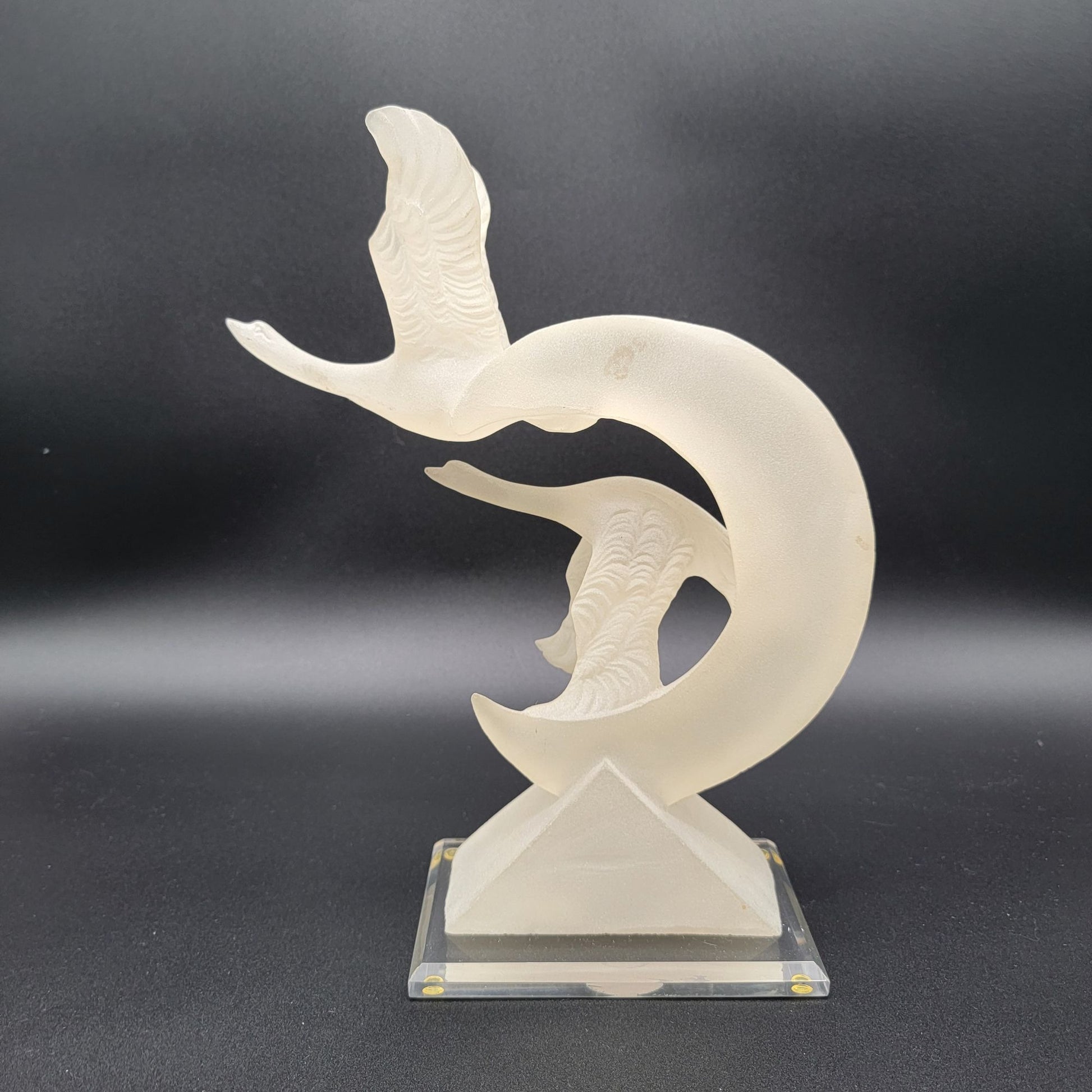 This vintage sculpture captures a timeless elegance with geese in flight against a crescent moon, crafted in frosted lucite on a clear base.
