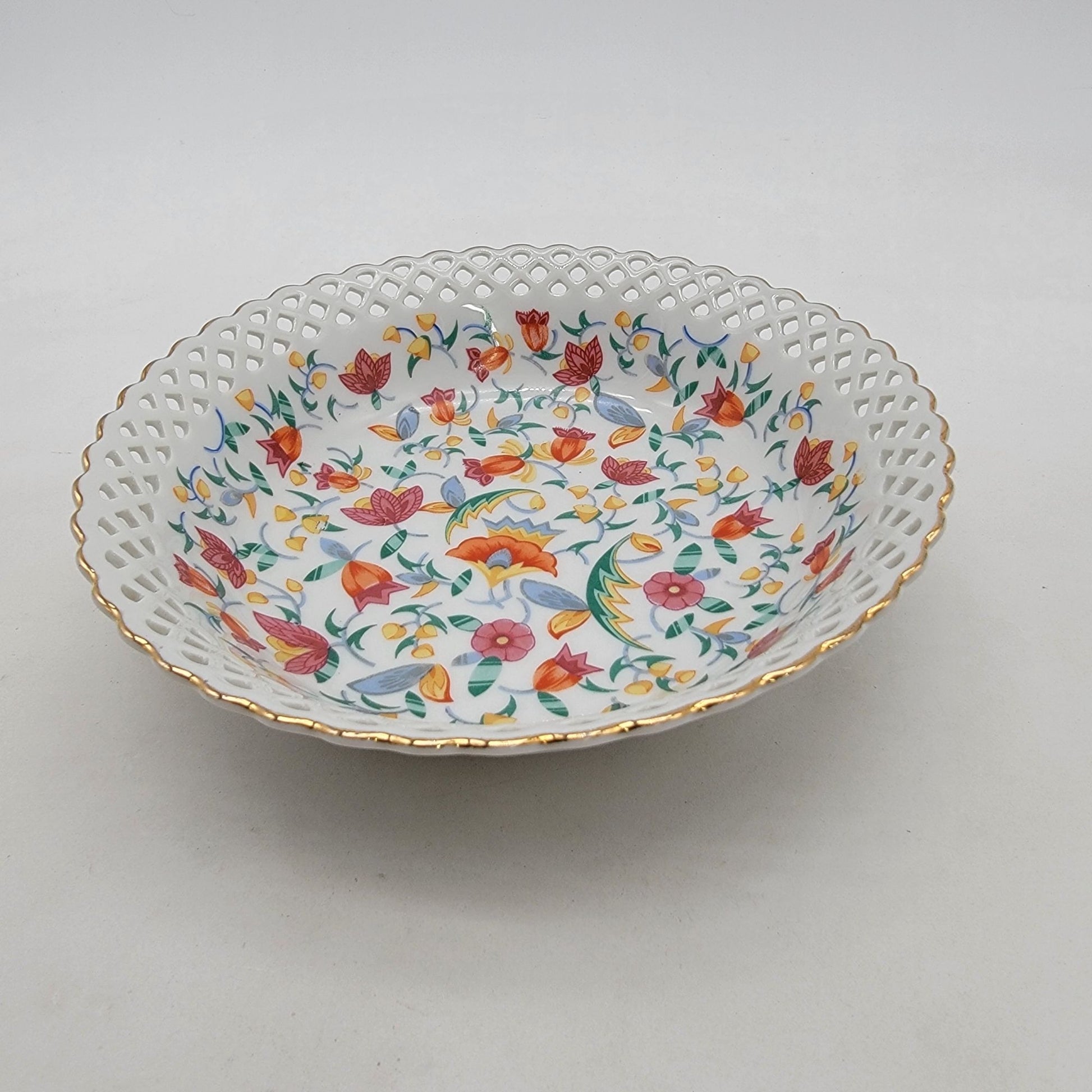 Vintage German Porcelain Bowl With Reticulated Lattice Rim Chintz Floral Pattern