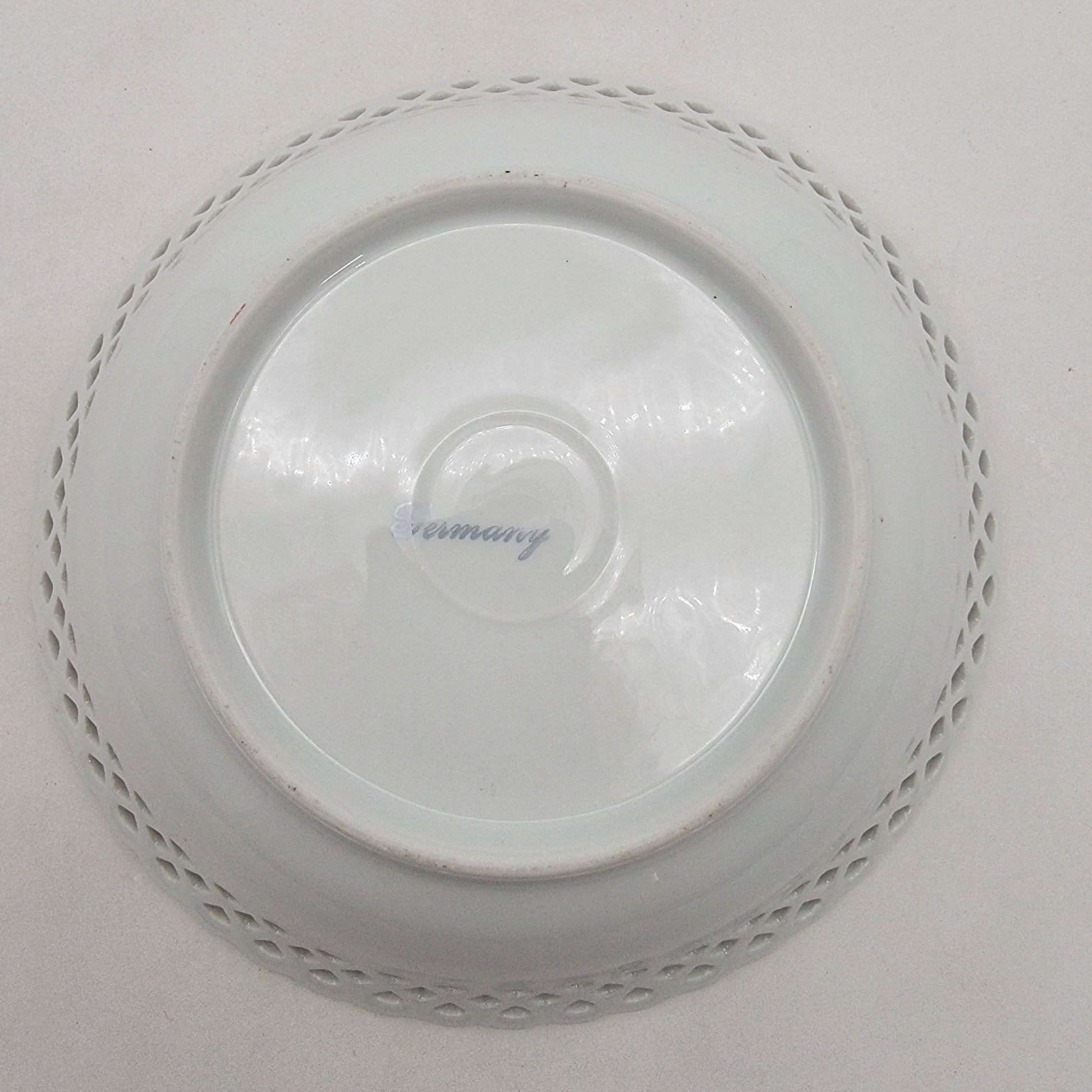 This vintage German porcelain bowl showcases a charming floral pattern, reticulated lattice rim, and gold trim. A timeless decorative or functional piece.