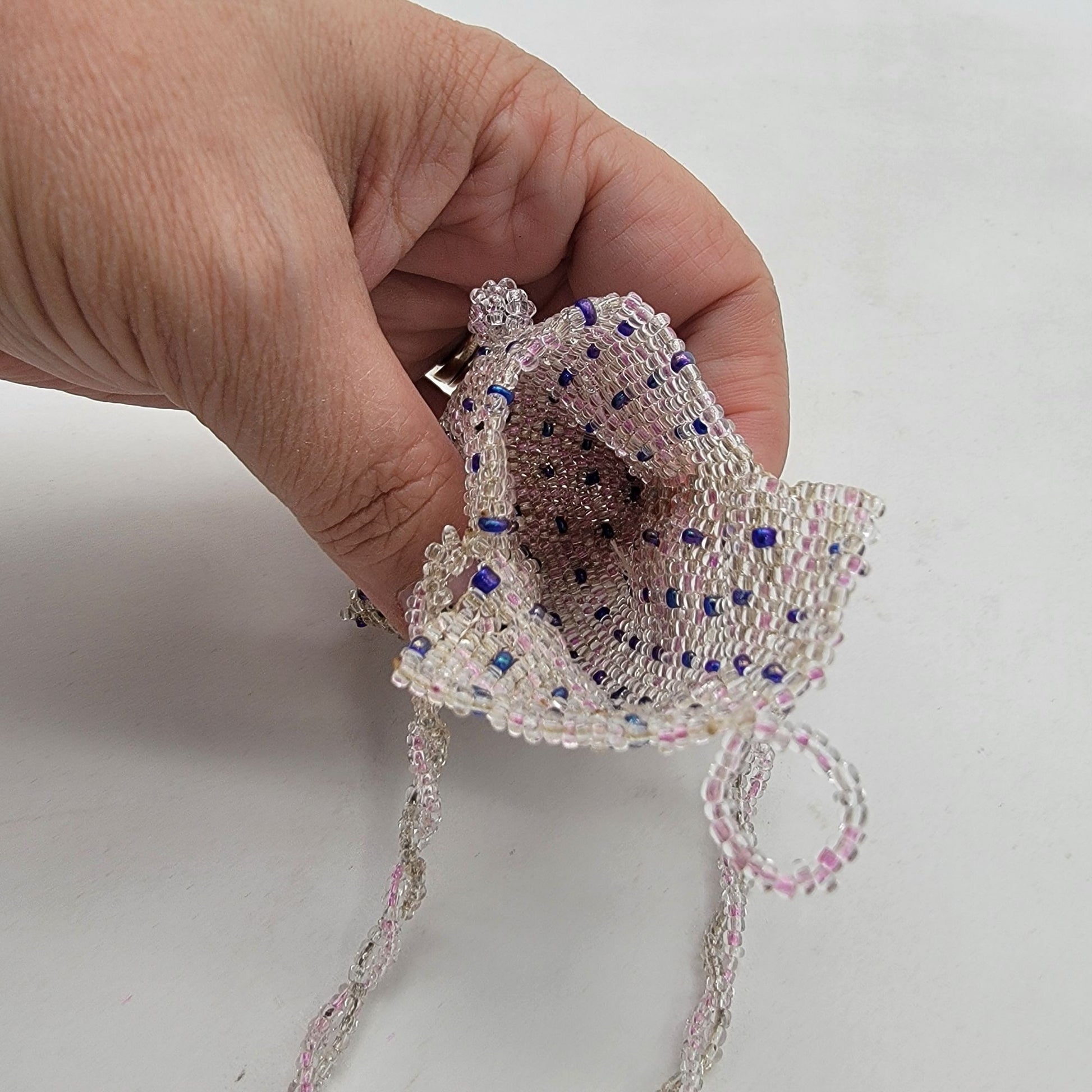 This intricately hand-beaded spirit bag tells stories of tradition and craftsmanship. Delicately adorned in shimmering pink, purple, and blue beads, it exudes a timeless charm. The tassels sway gently, echoing whispers of history and culture, while the strap ensures it remains close to the heart.