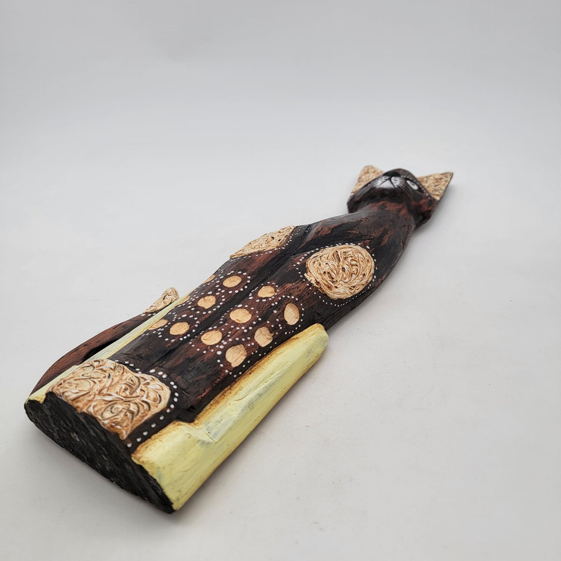 This hand-carved and painted wood cat statue showcases intricate patterns and vintage charm. A striking piece for collectors or decorative enthusiasts.