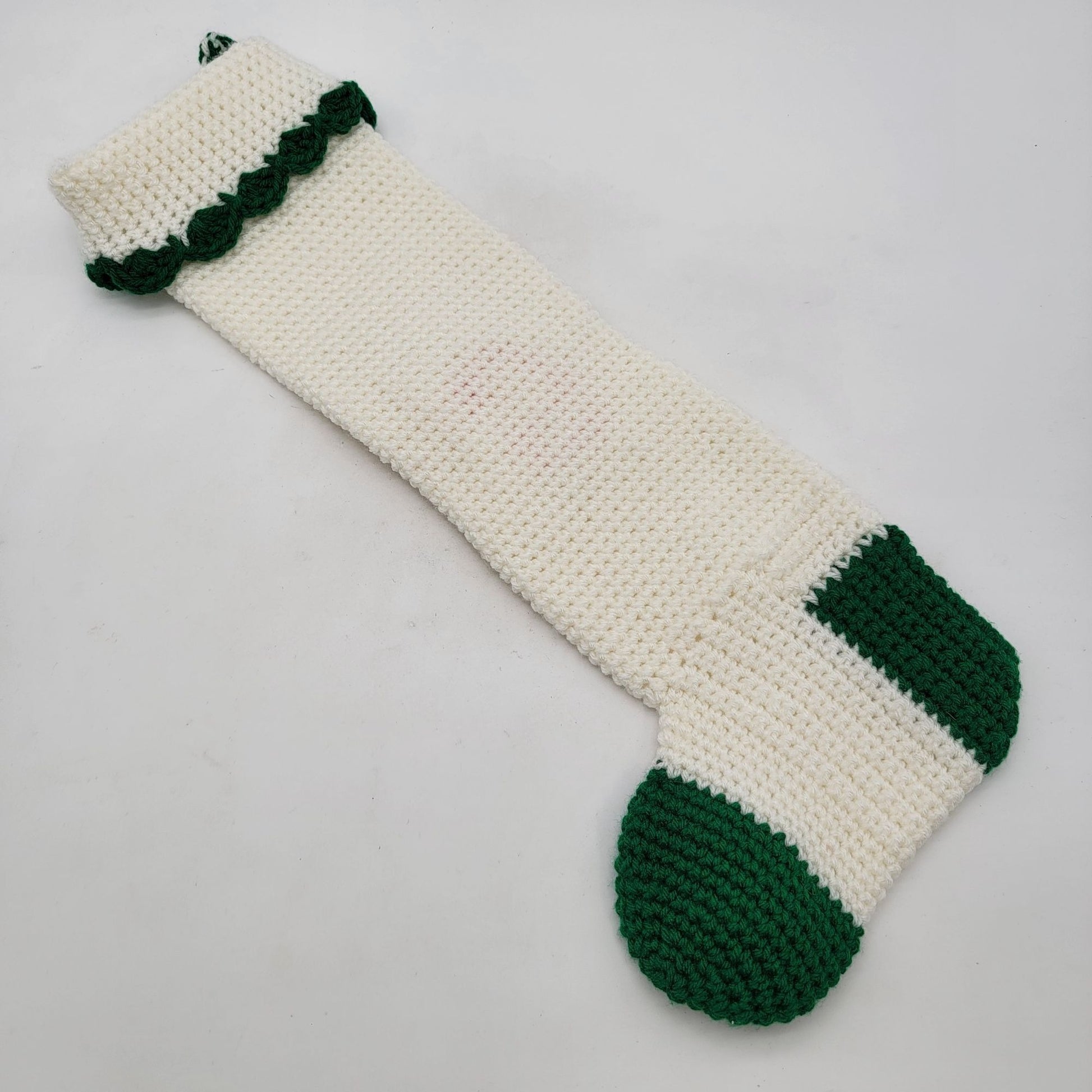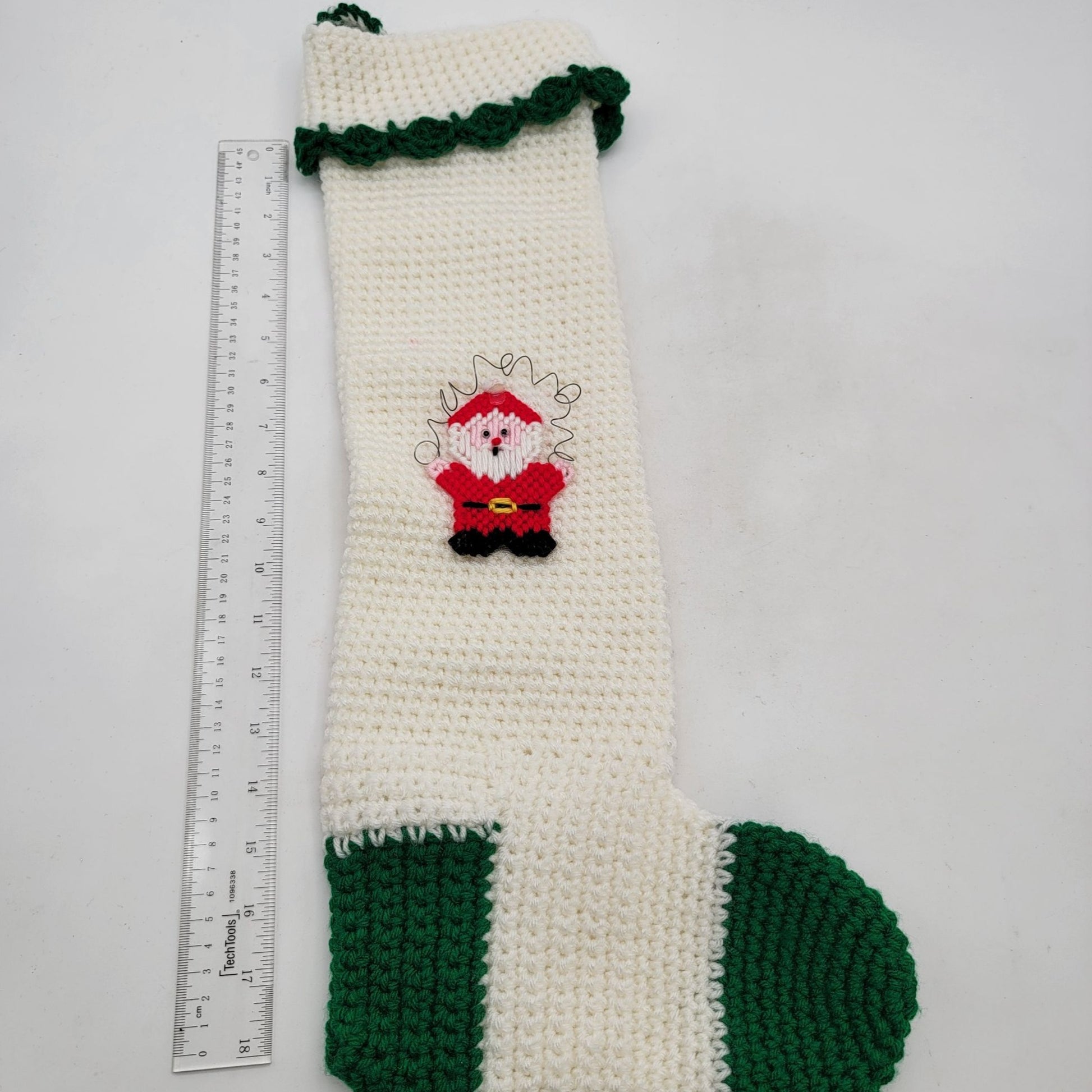 Vintage Hand-Crocheted Santa Christmas Stocking White & Green
