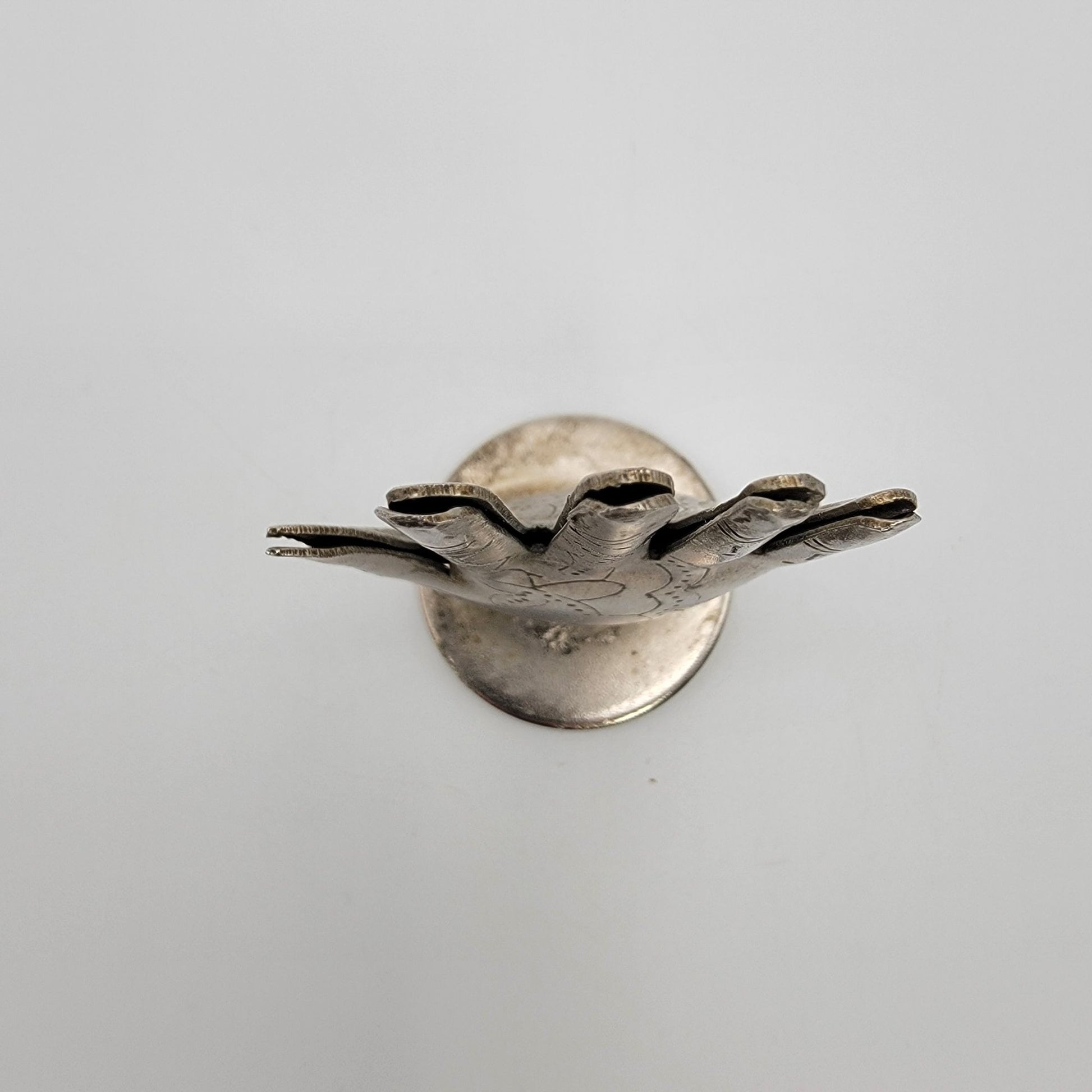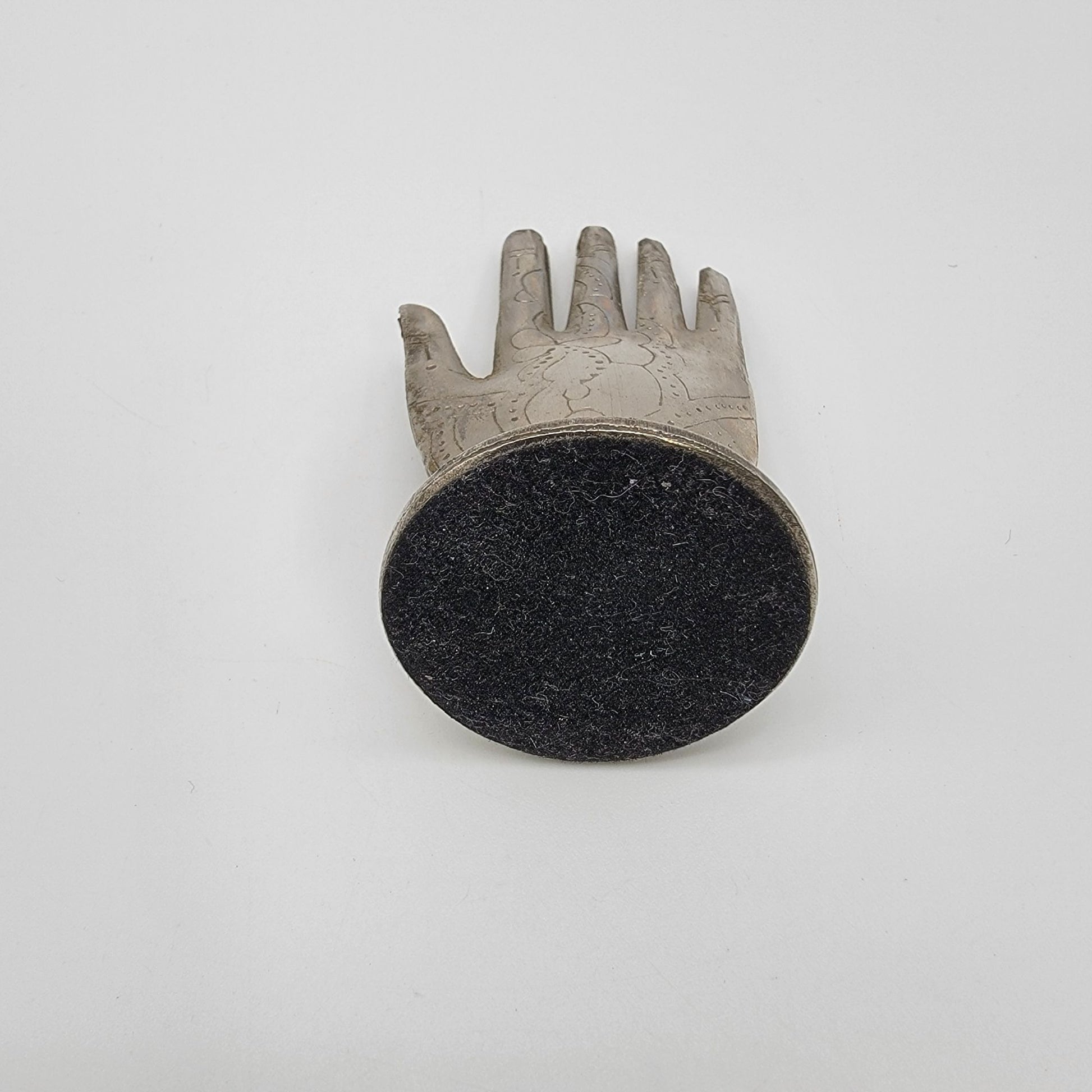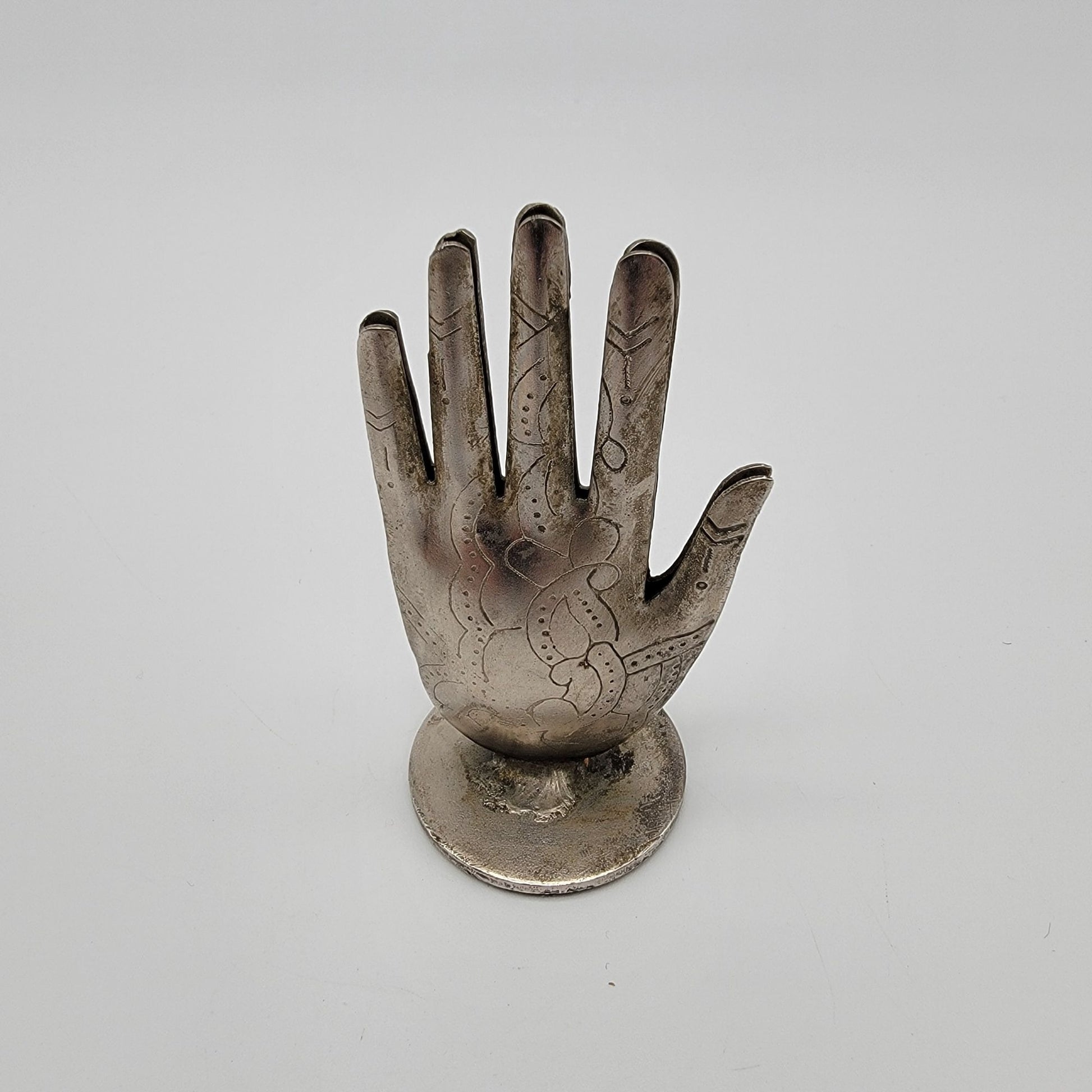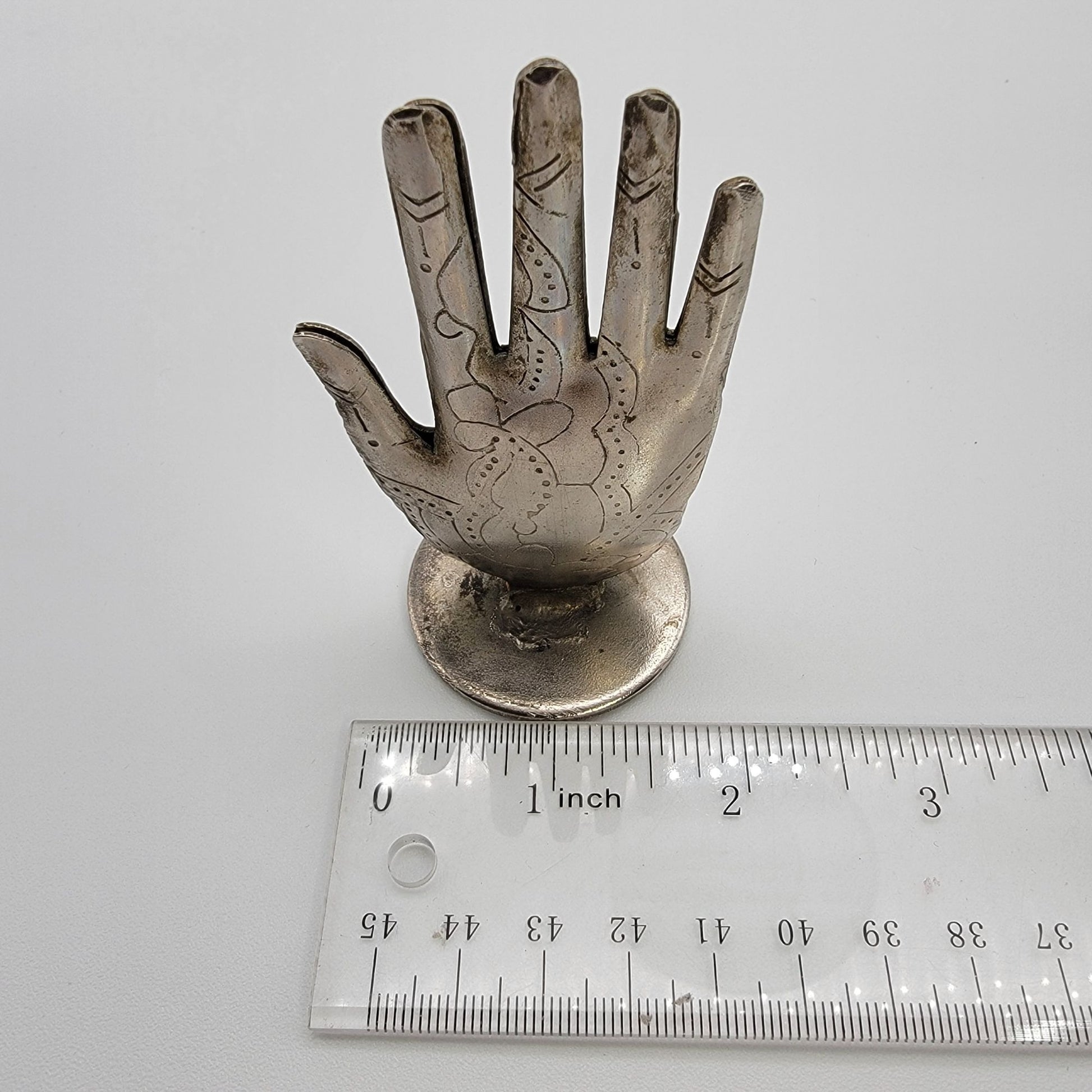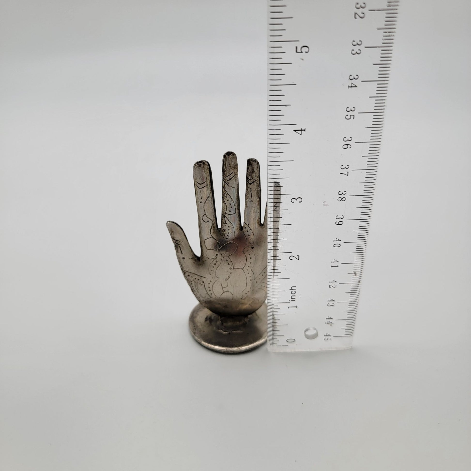 A delicate metalwork sculpture capturing the intricate details of an open hand, designed as an incense holder with ornate etched patterns across the palm and fingers. The piece sits elegantly on a circular base, revealing meticulous craftsmanship in its vintage silver finish.