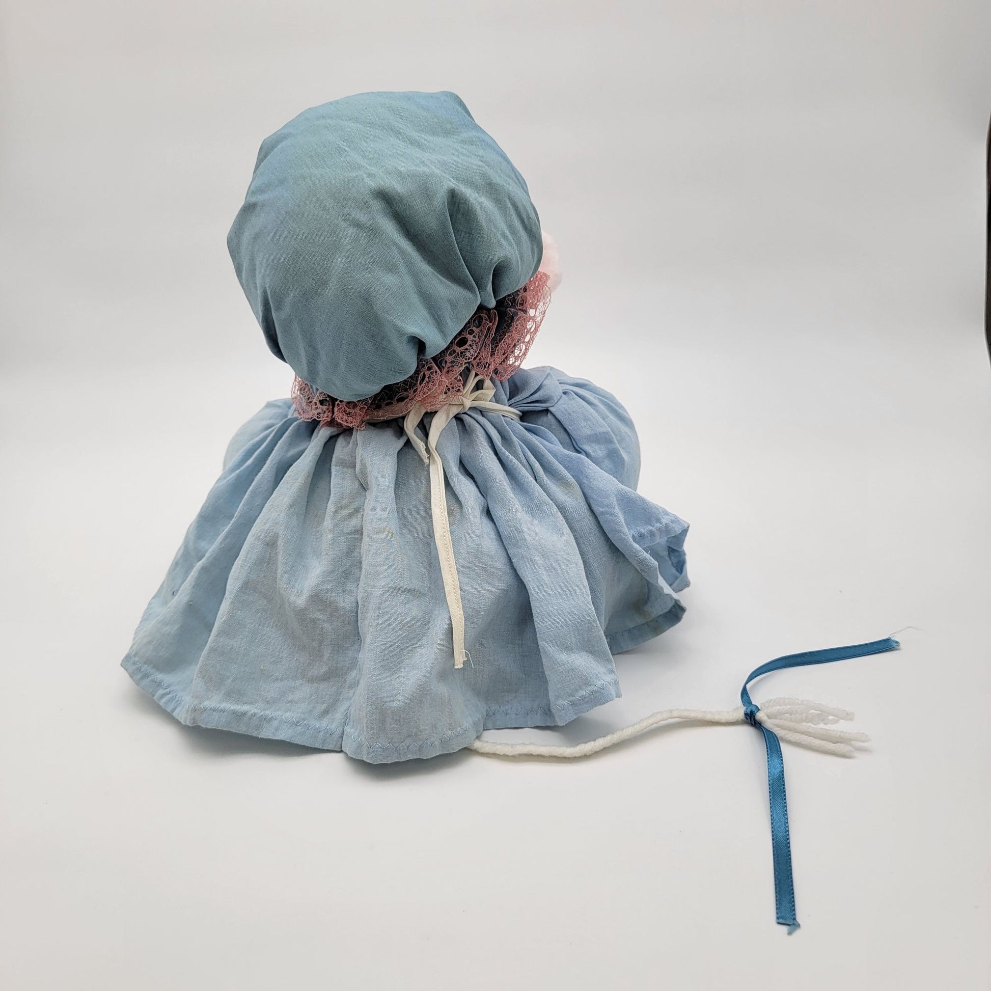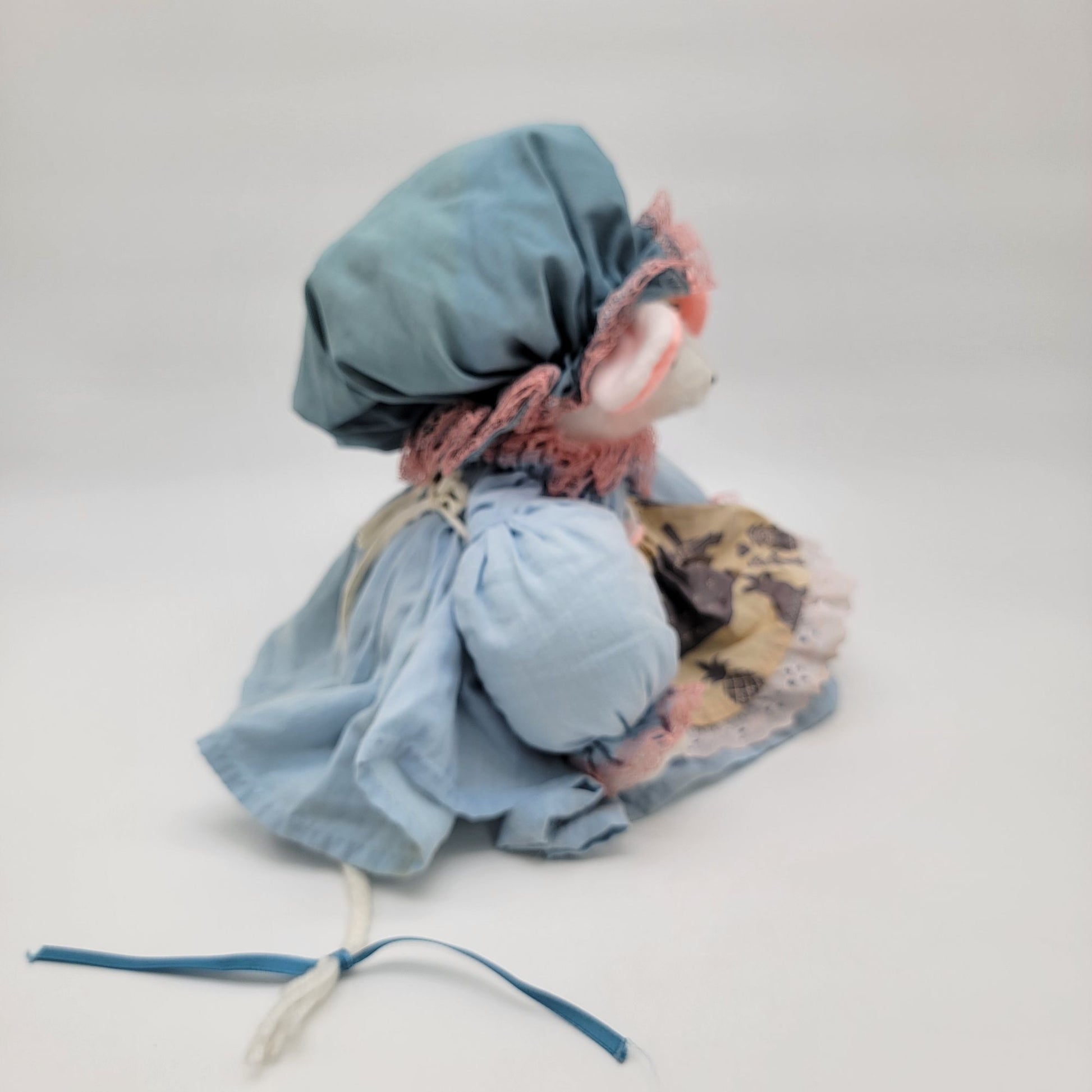 Once upon a time, this charming granny mouse doorstop kept doors safely ajar in a warm and cozy home. Dressed in a delicate blue dress and lace-trimmed bonnet, she tells tales of yesteryear. Filled and weighted perfectly, she is both functional and decorative, embodying timeless charm.