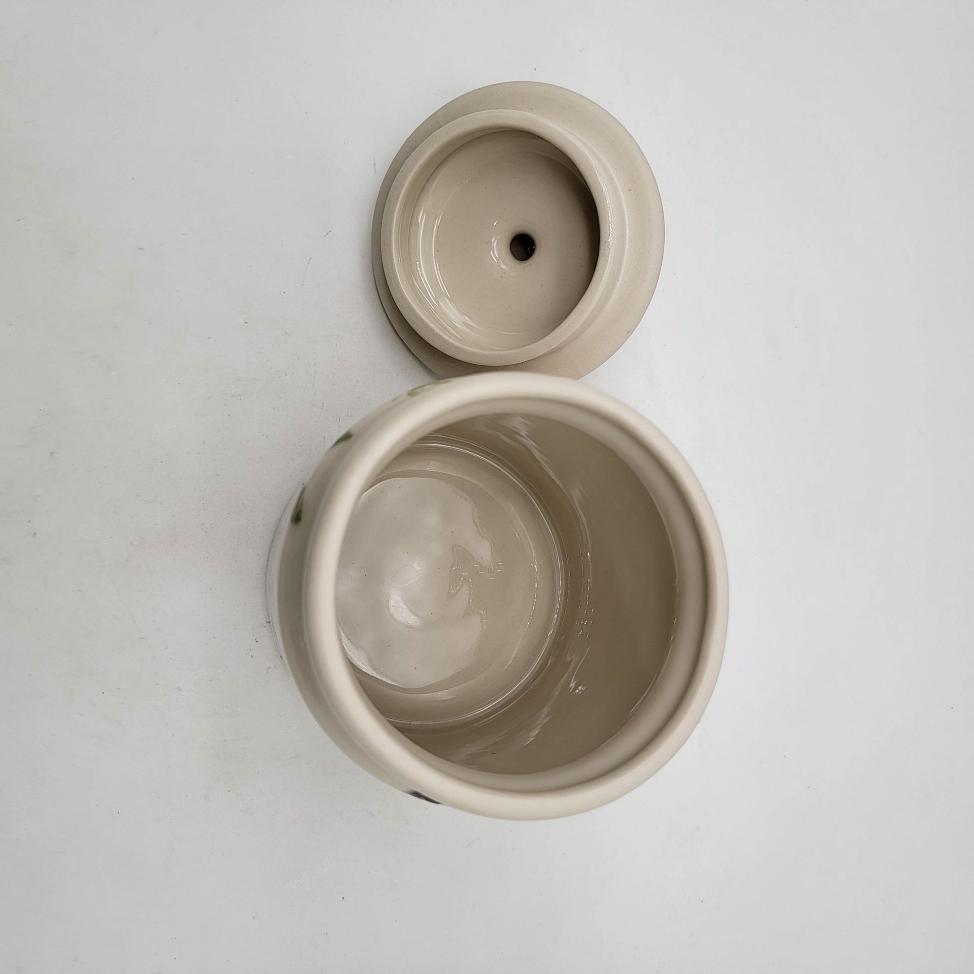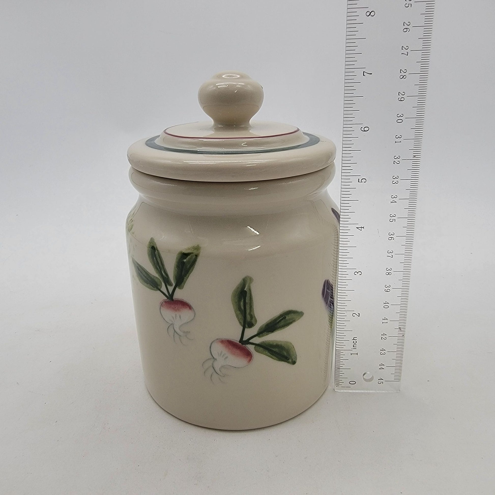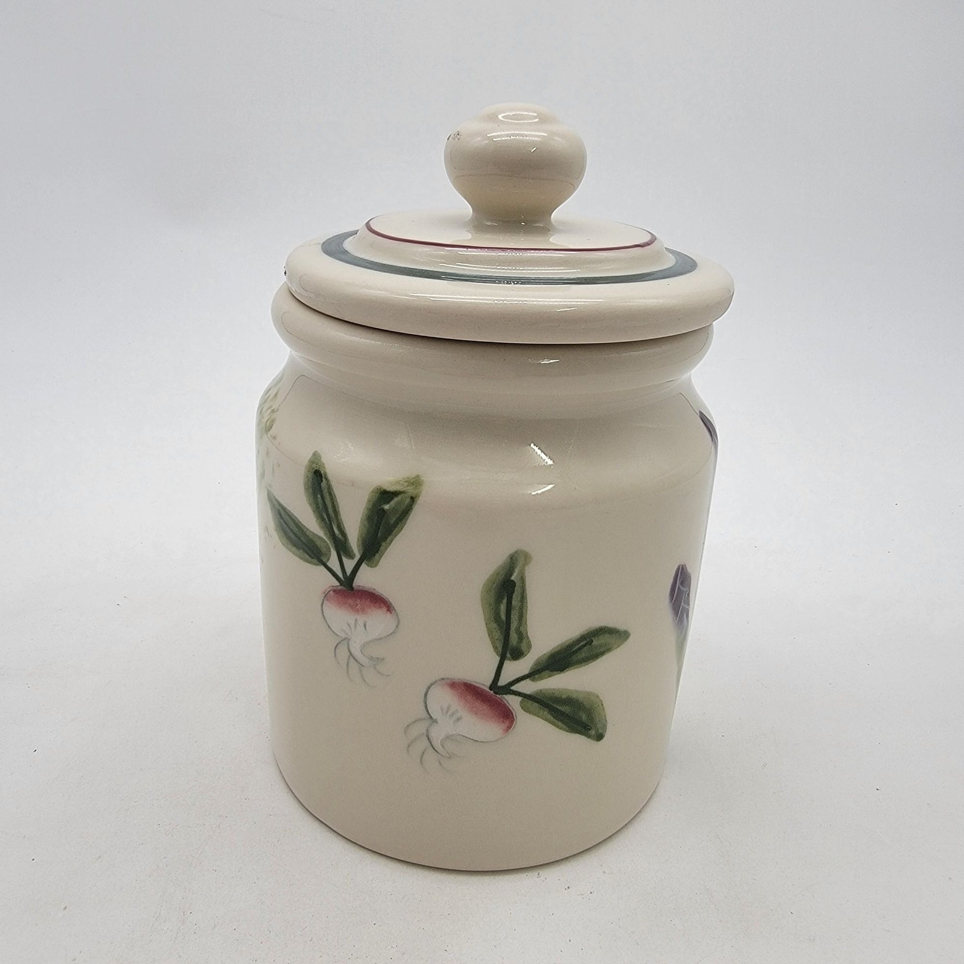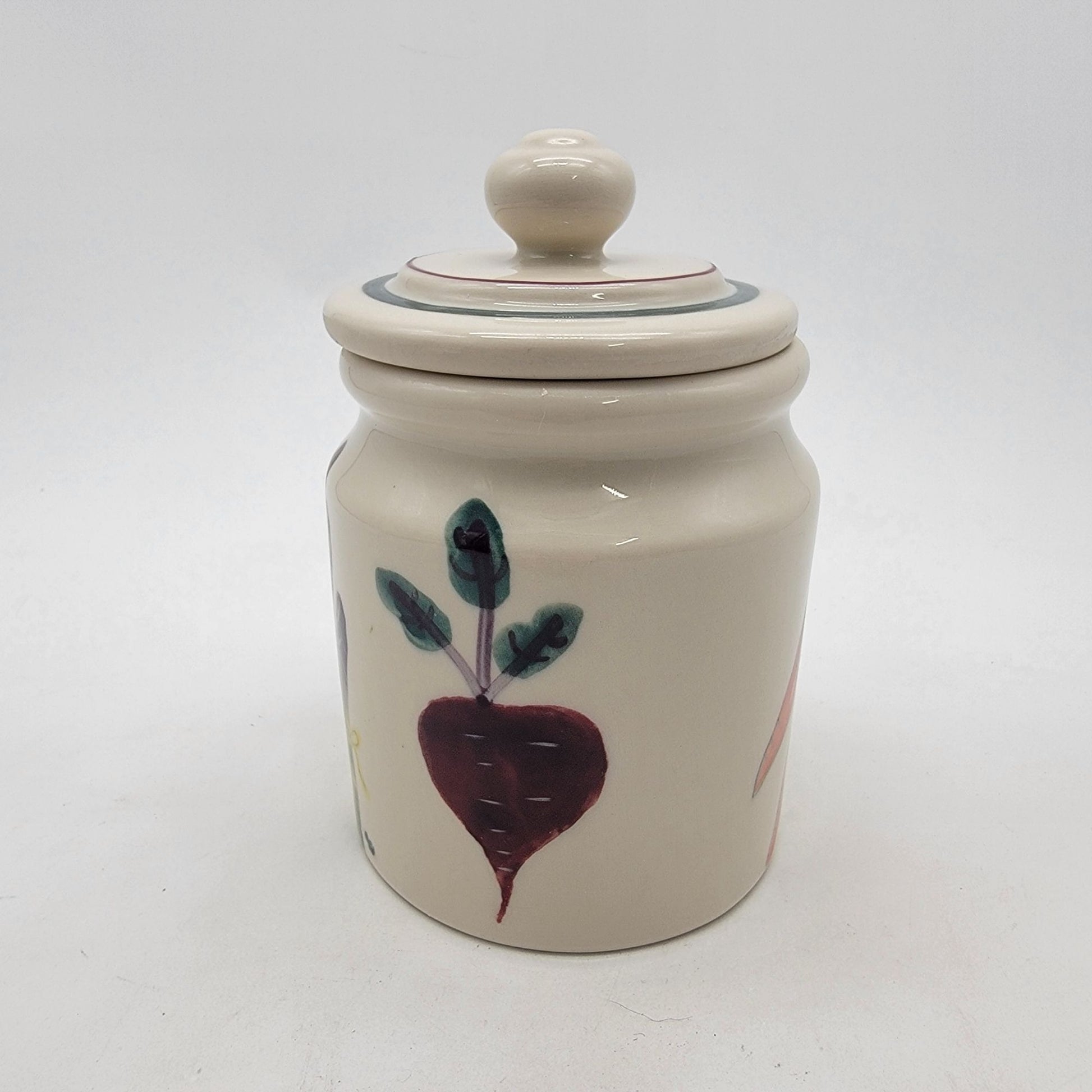 This handcrafted ceramic cannister offers functional storage with a charming handpainted vegetable motif, ideal for kitchens or decorative displays.