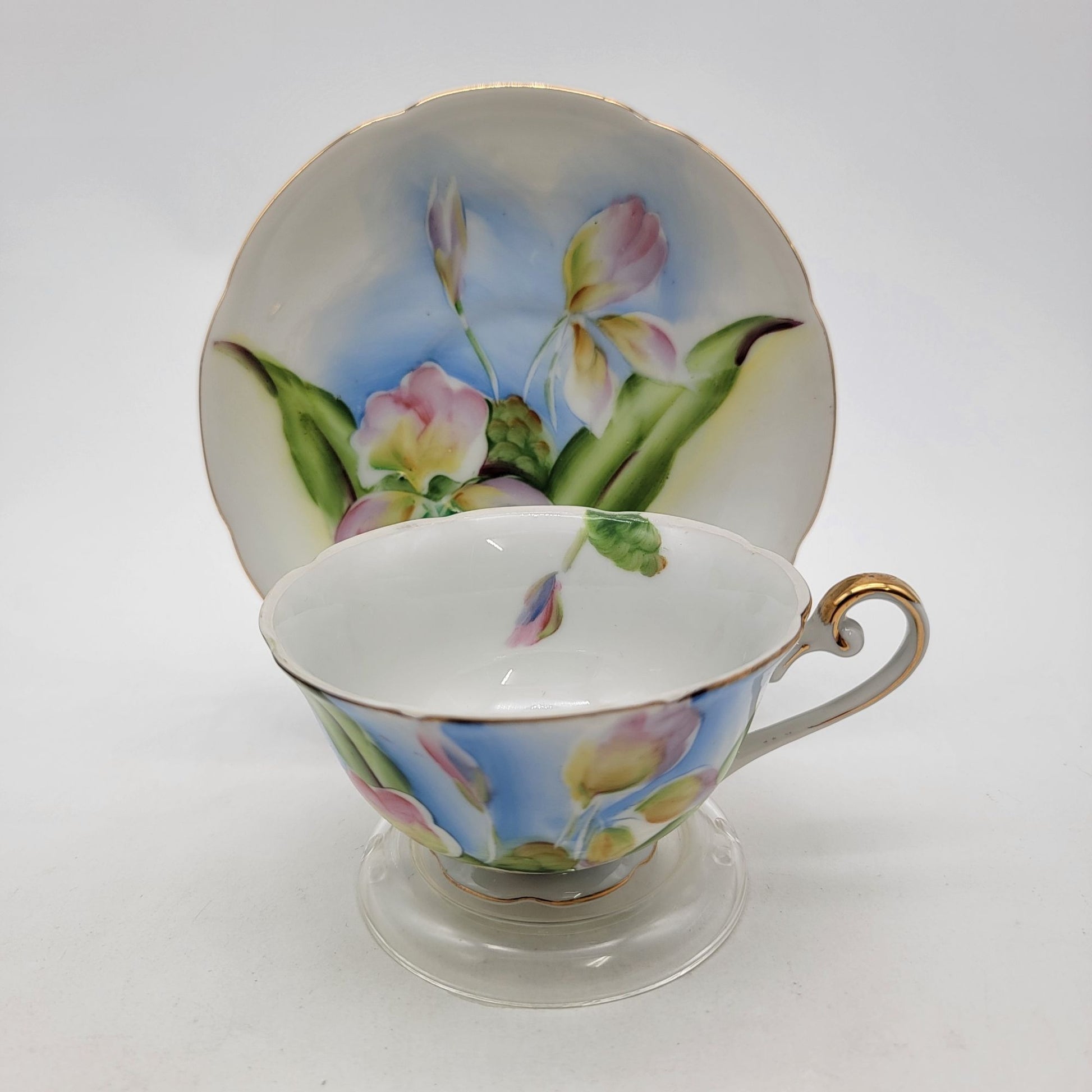 A delicate vintage tea cup and saucer set, crafted from fine bone china, featuring a hand-painted ginger flower design with soft pastel tones, evoking timeless elegance.