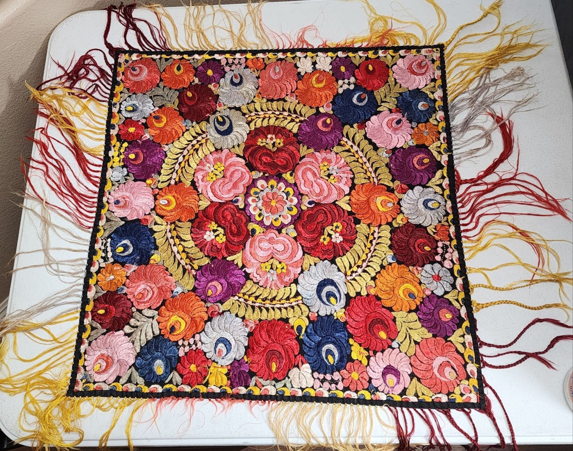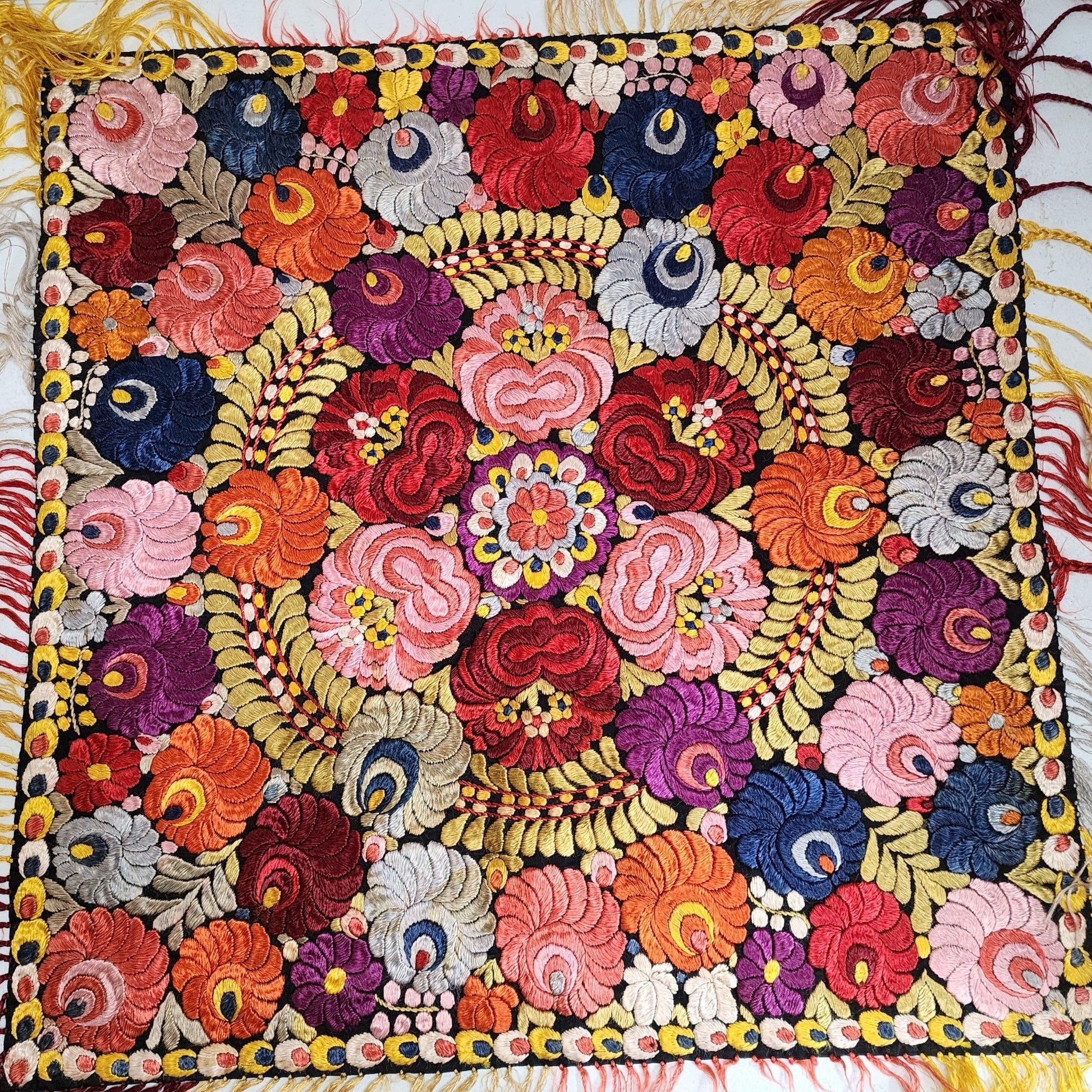 This vintage hand-embroidered tapestry captures the charm of intricate floral designs, evoking a sense of heritage craftsmanship. The vivid colors and detailed patterns make it a timeless decorative piece for any space. The fringed edges add a touch of rustic elegance, highlighting its artisanal origins.
