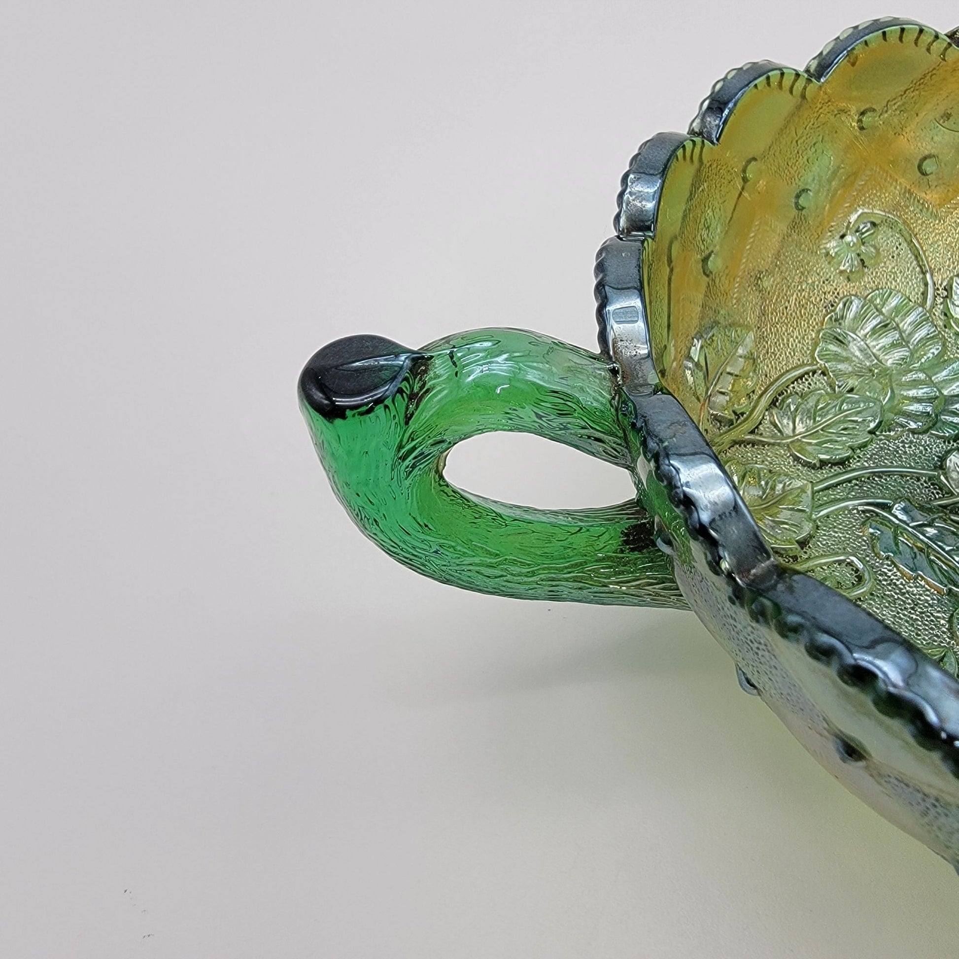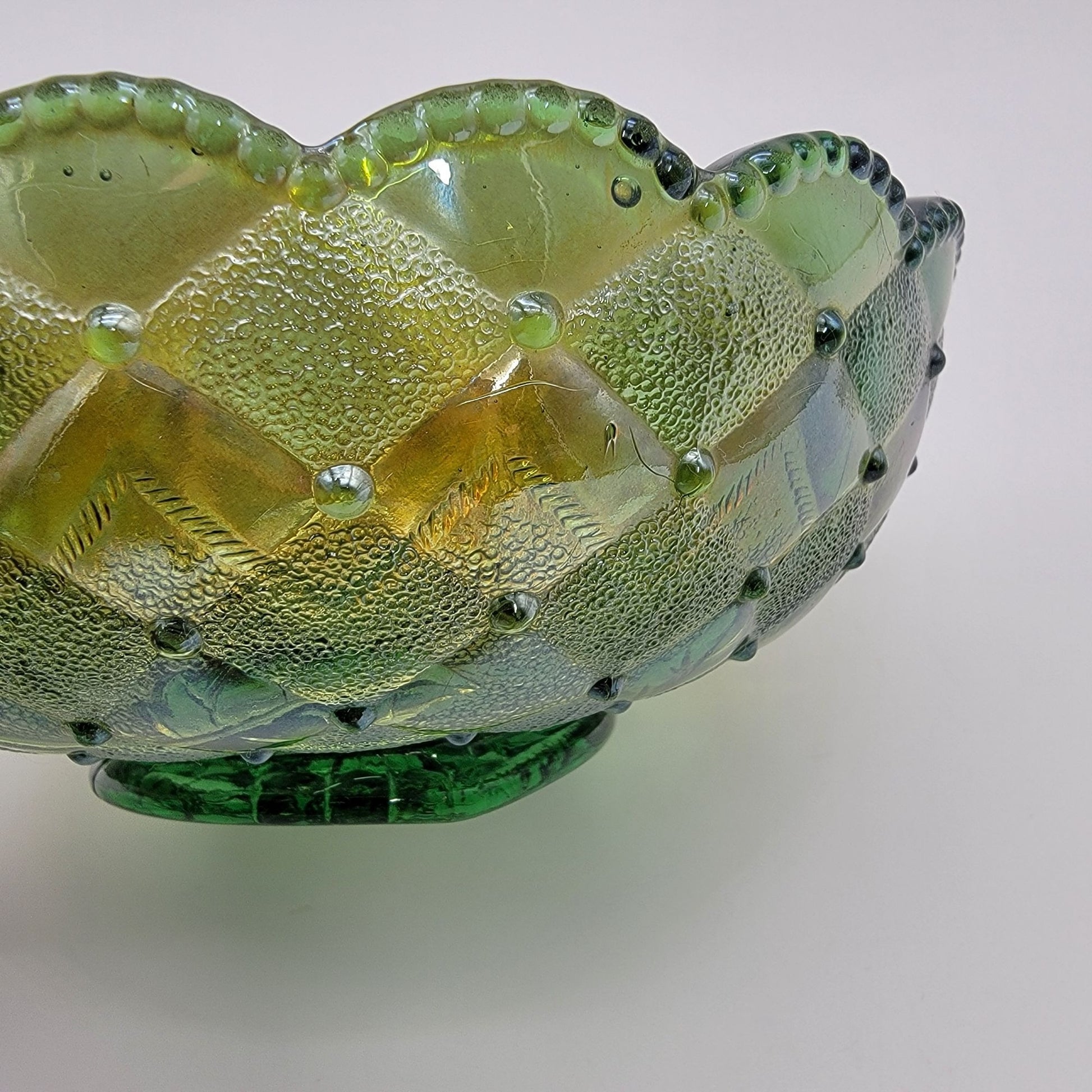 • Made of Carnival Glass with a Helios green base