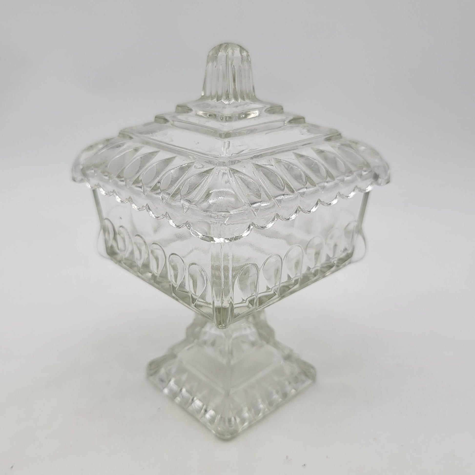 This elegant Jeannette glass candy dish exudes a timeless charm reminiscent of yesteryears. Its intricate pedestal design and detachable lid make it a beautiful addition to any vintage collection, showcasing a blend of form and function. Ideal for storing sweets, it adds a touch of nostalgia to your decor.