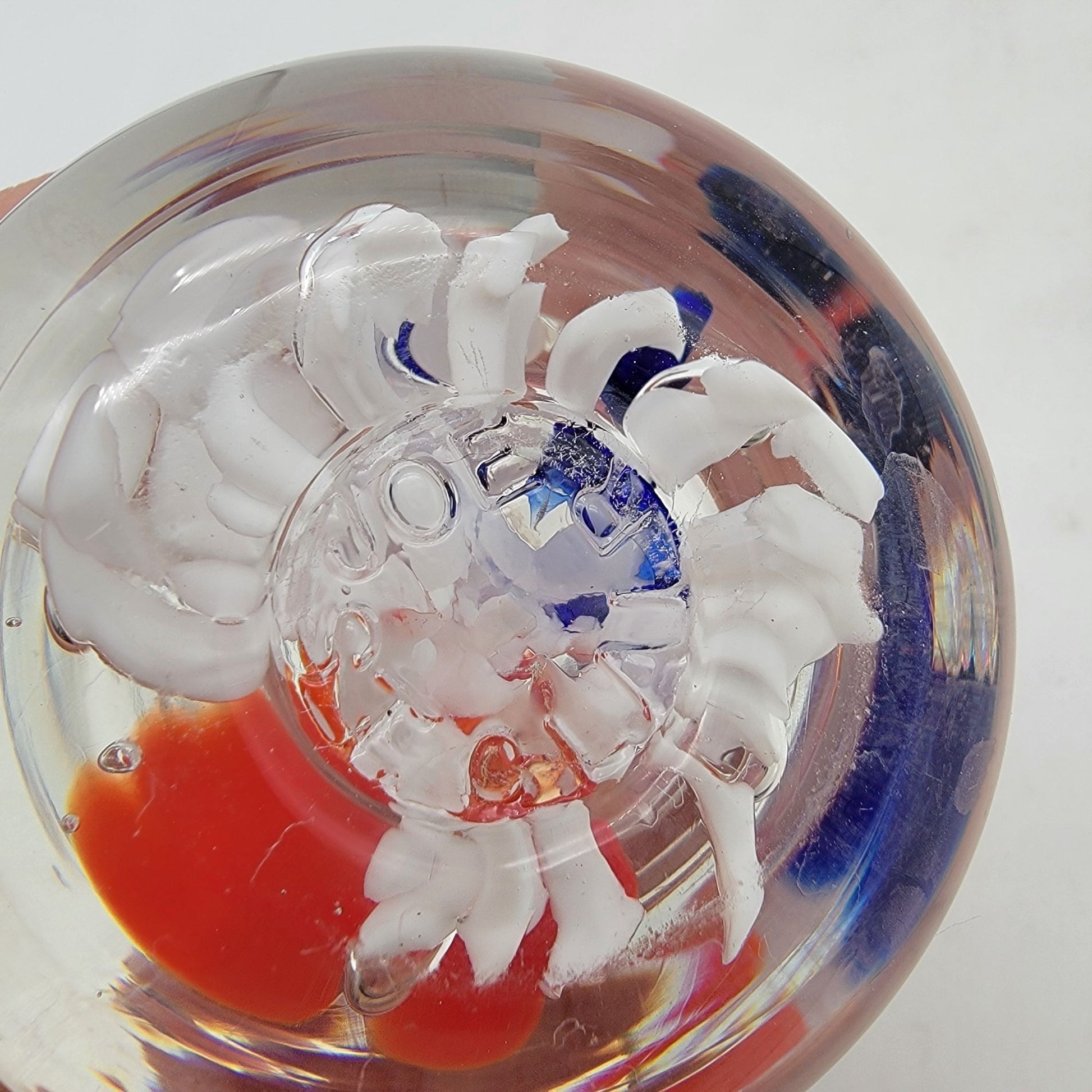 This vintage Joe St. Clair paperweight features a bell shape with vibrant trumpet flowers encased in clear glass. A charming collectible for art glass enthusiasts.