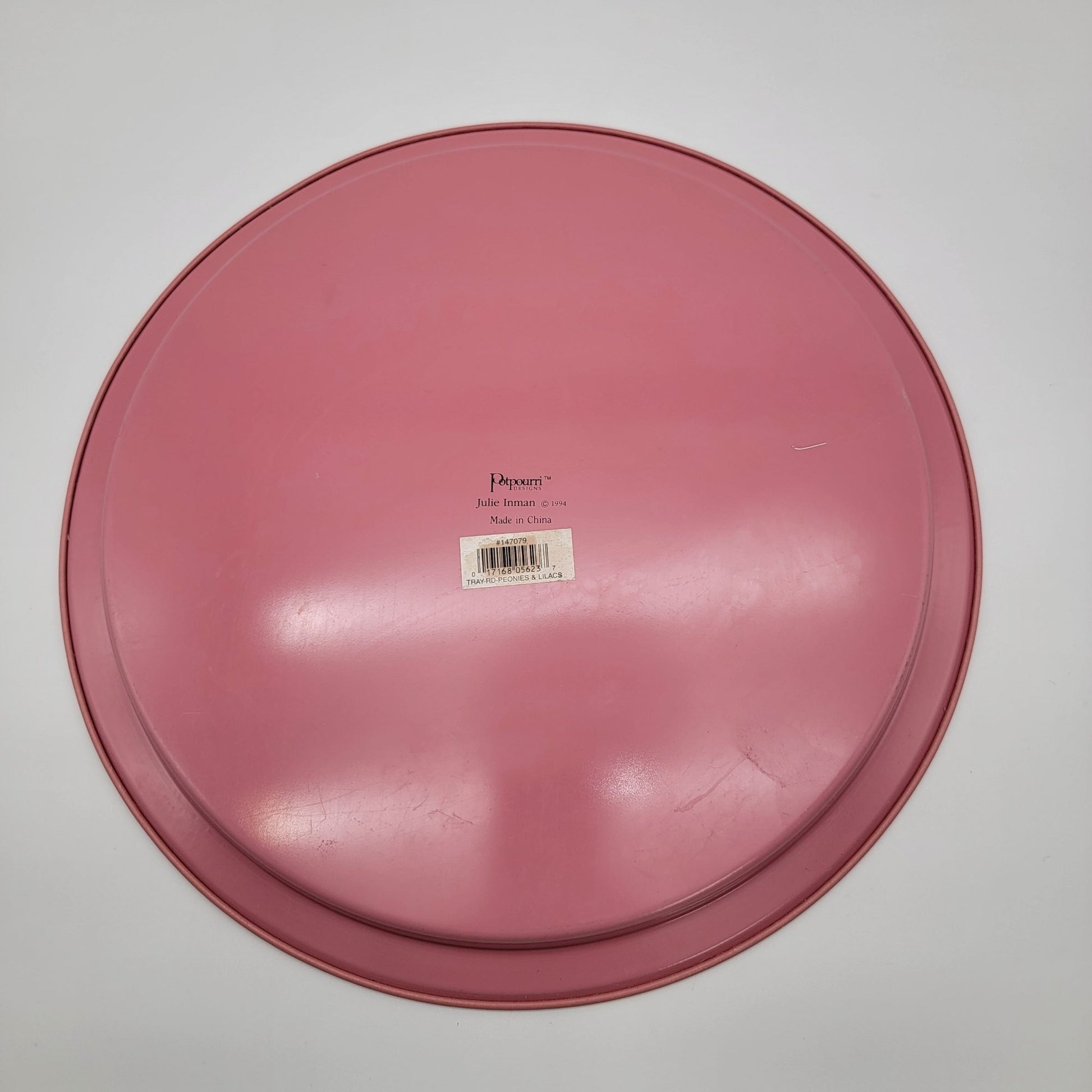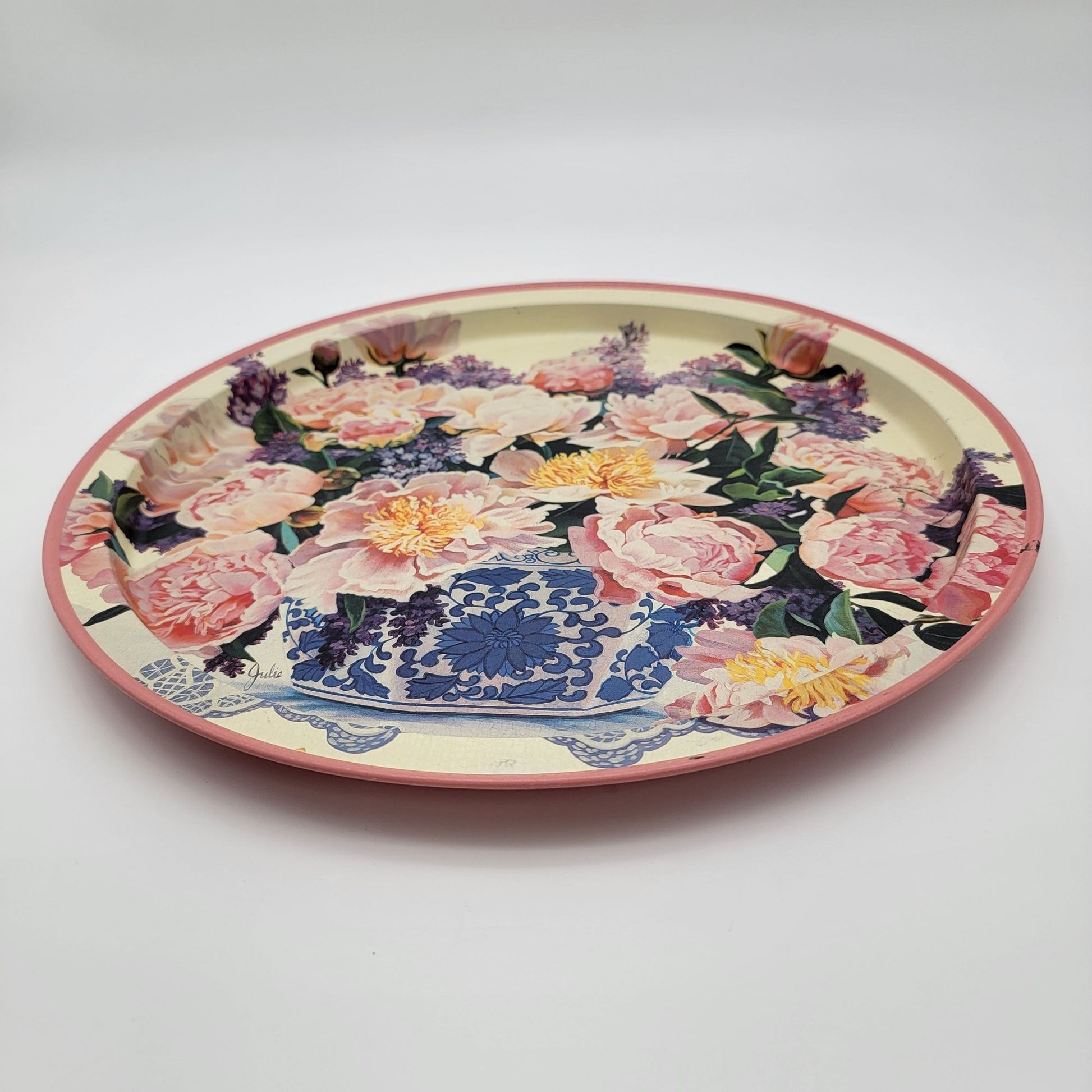 This vintage tin tray features a vibrant floral design of peonies and lilacs by Julie Inman for Potpourri Designs. Its 13.5-inch diameter adds functionality to its decorative charm. Ideal for serving or display.
