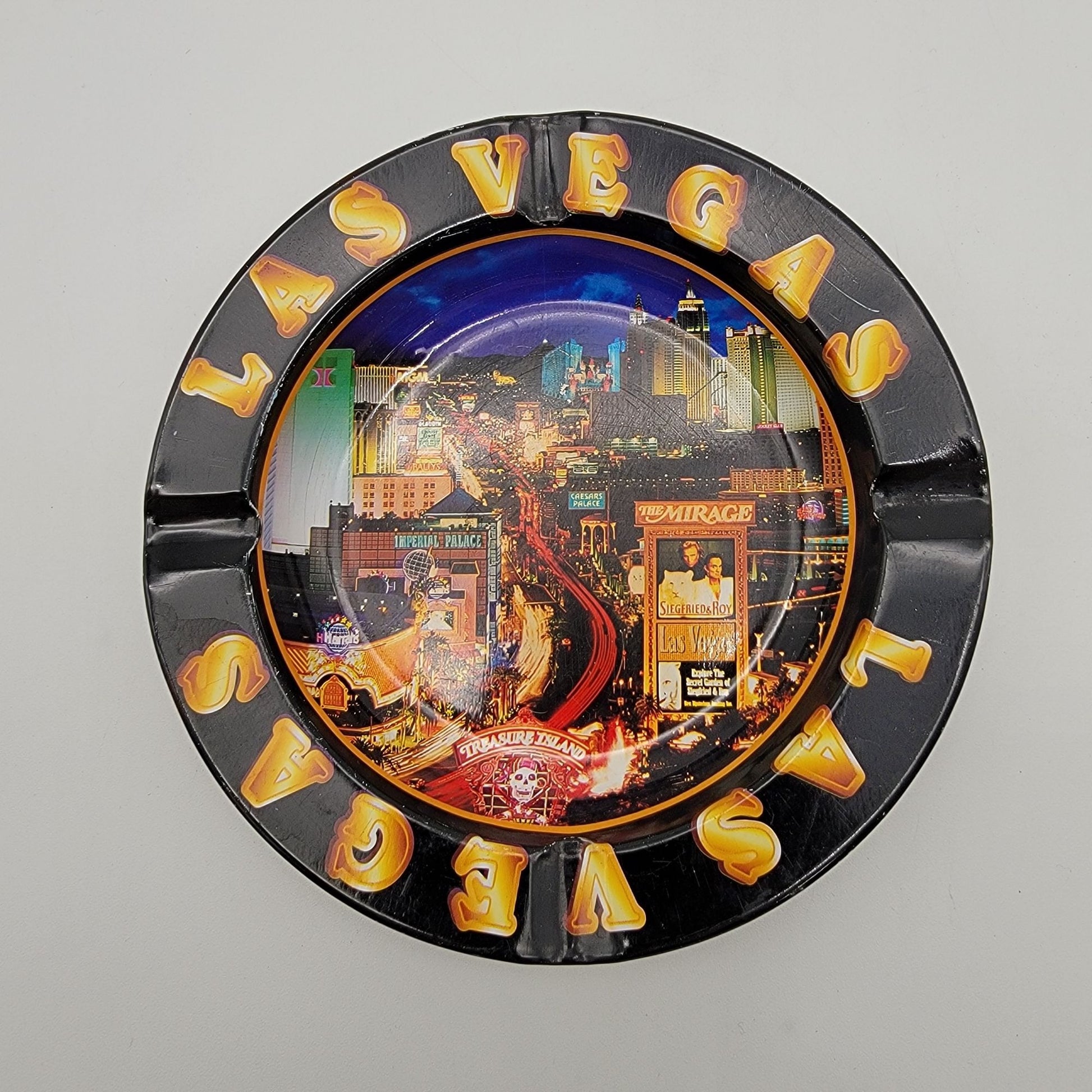 This metal ashtray features a vibrant graphic of the Las Vegas Strip at night, along with bold "Las Vegas" text around the rim. A functional and collectible keepsake.