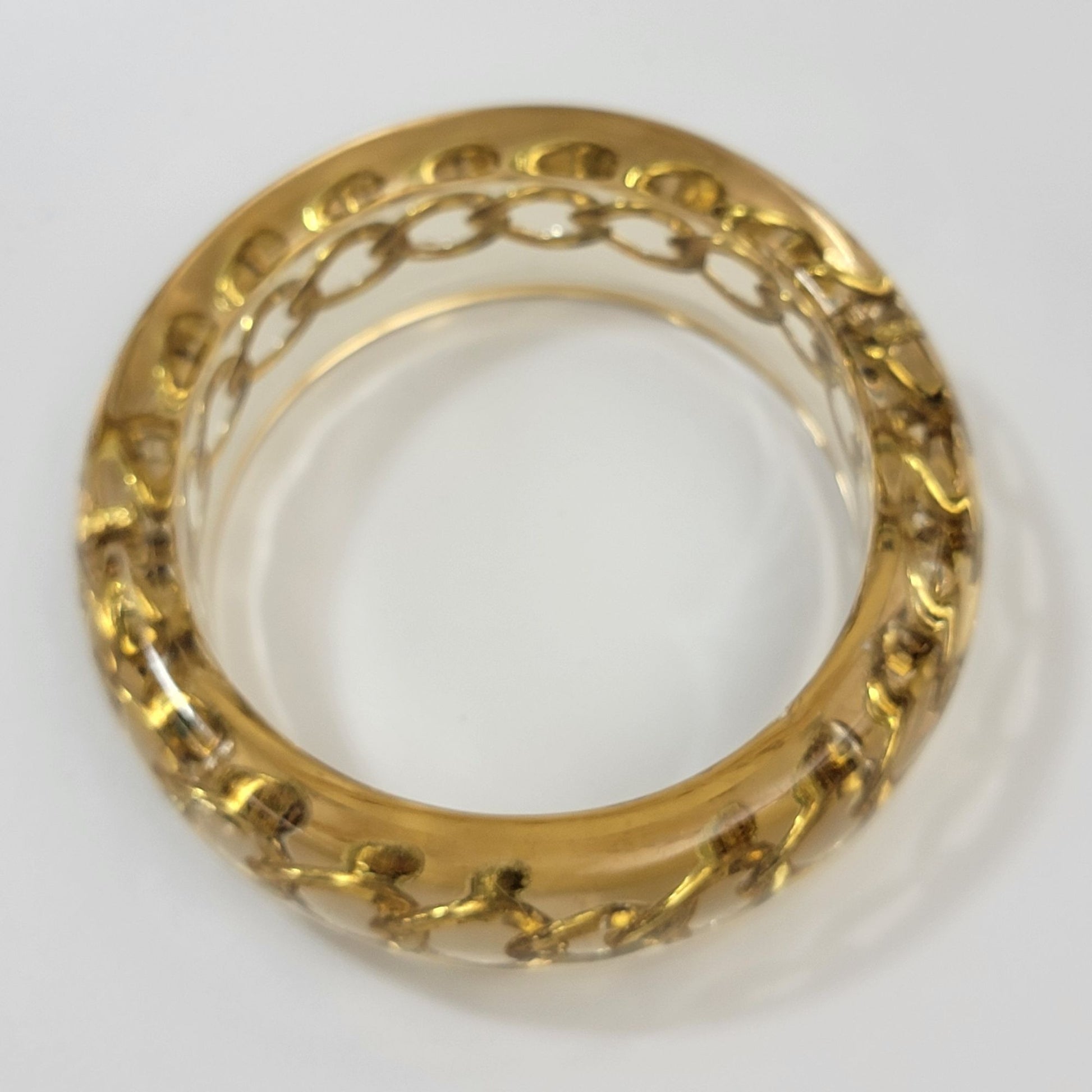 A timeless piece of wearable art, this vintage Lucite bangle encases a gold-tone curb chain, evoking an era of glamour and sophistication. Its bold design and shimmering tones make it a captivating accessory for those who cherish unique craftsmanship. The 8-inch size ensures a comfortable fit for most wrists, blending style with ease.
