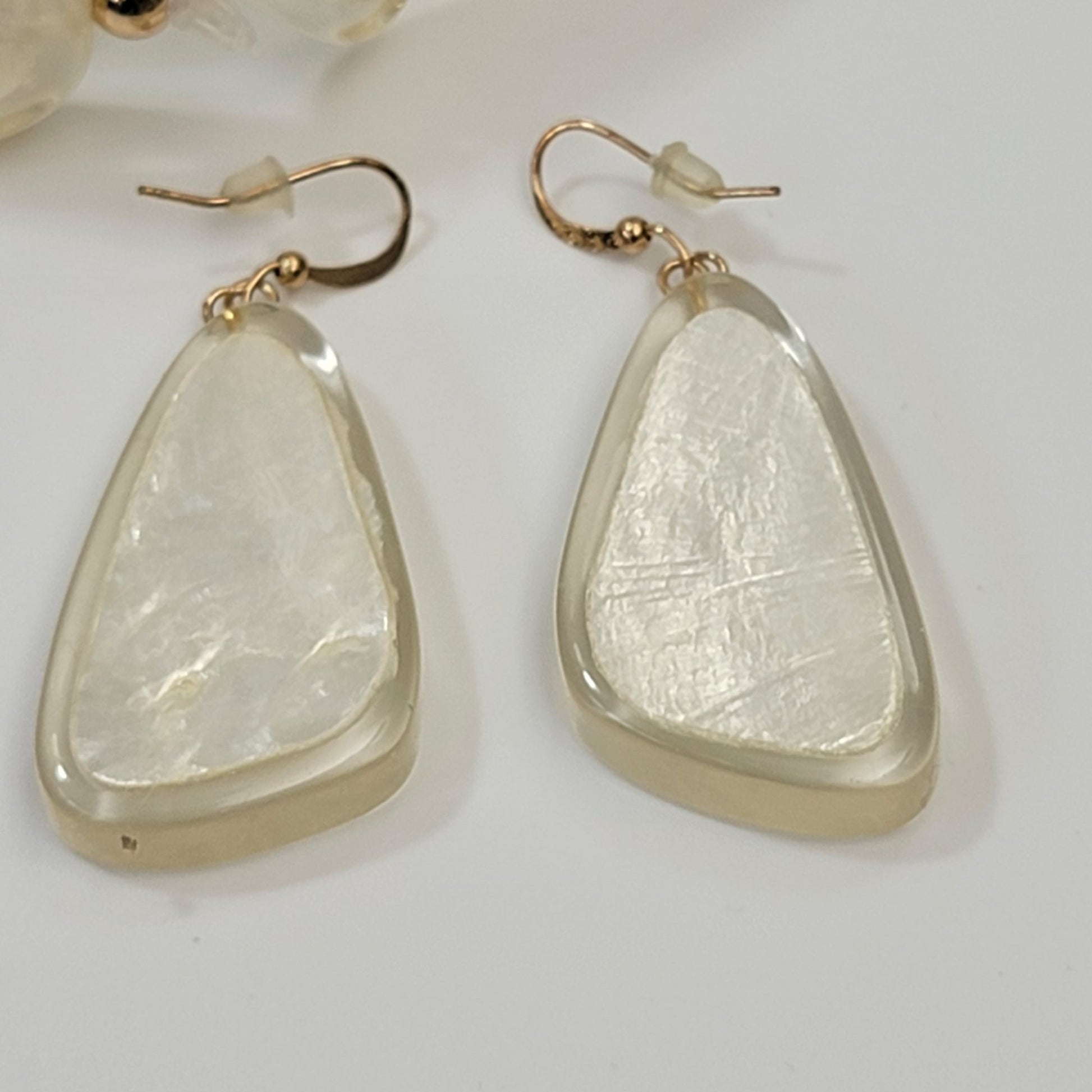 This lucite jewelry set has a vintage flair with a little glow. The soft shimmer of the bracelet and earrings exudes timeless sophistication, capturing the era's charm. A delicate dance of gold-toned accents and smooth curves makes this set a treasured keepsake.