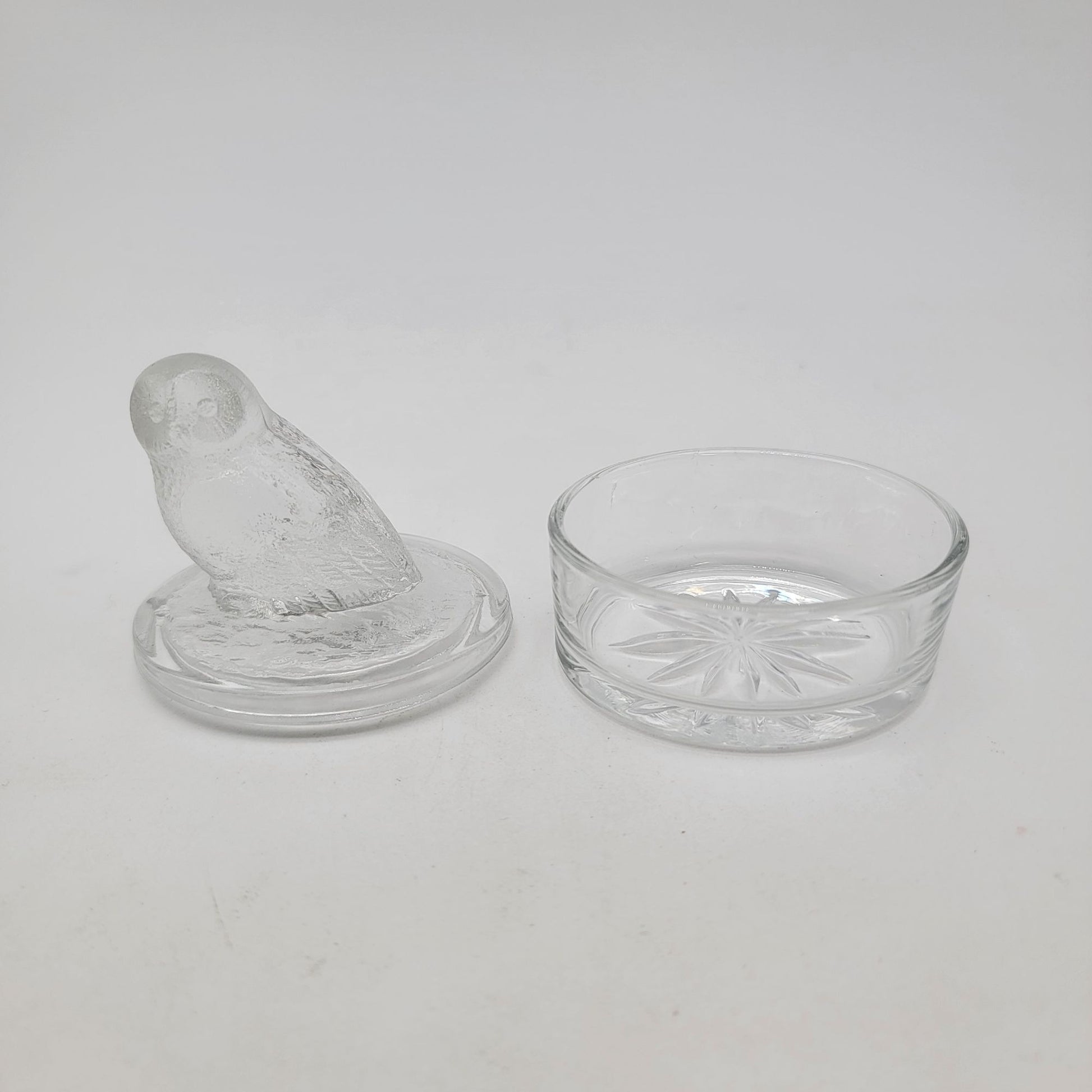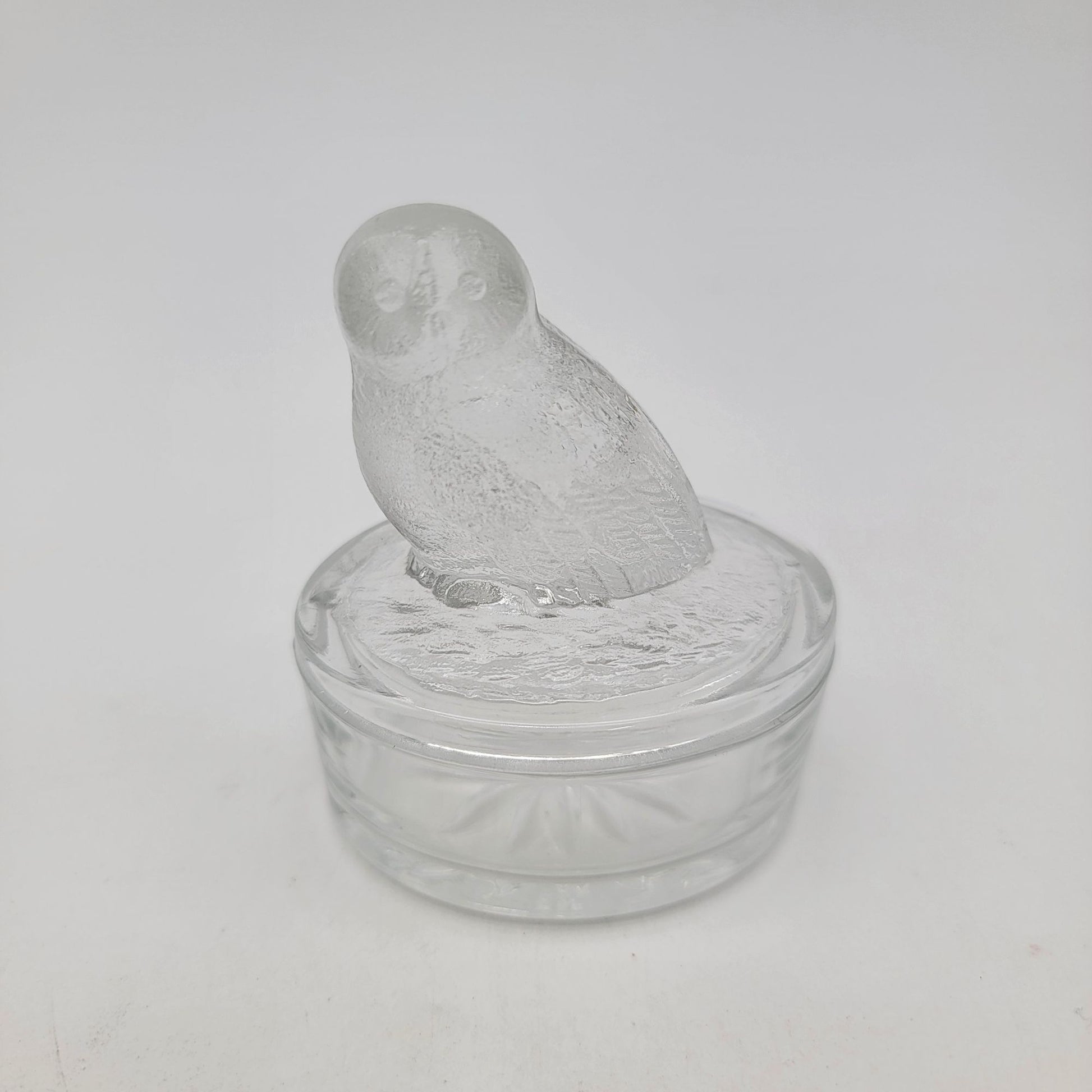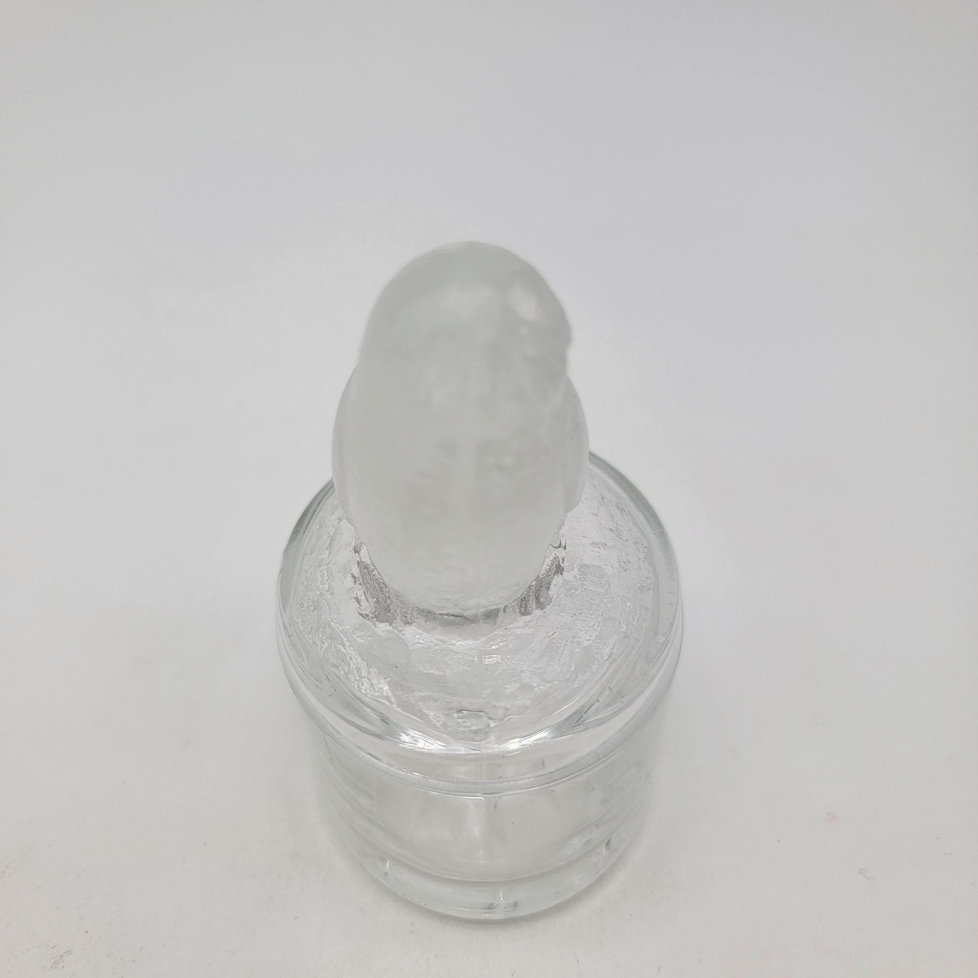 A delicate glass vessel that whispers tales of mid-century design, capturing the serene essence of an owl perched atop a textured base. Crafted with meticulous French glassmaking artistry, this piece serves as both a functional container and a nostalgic art object.