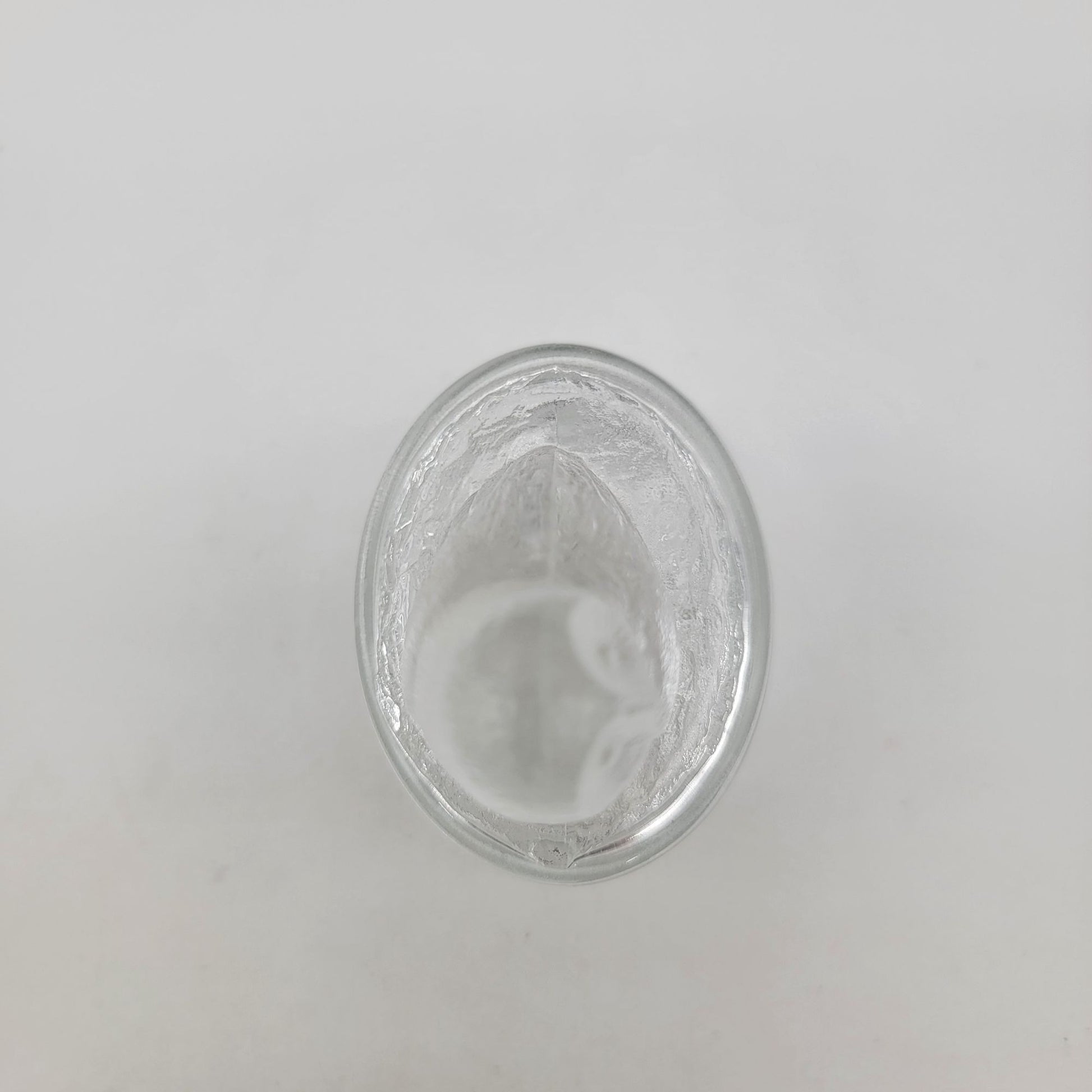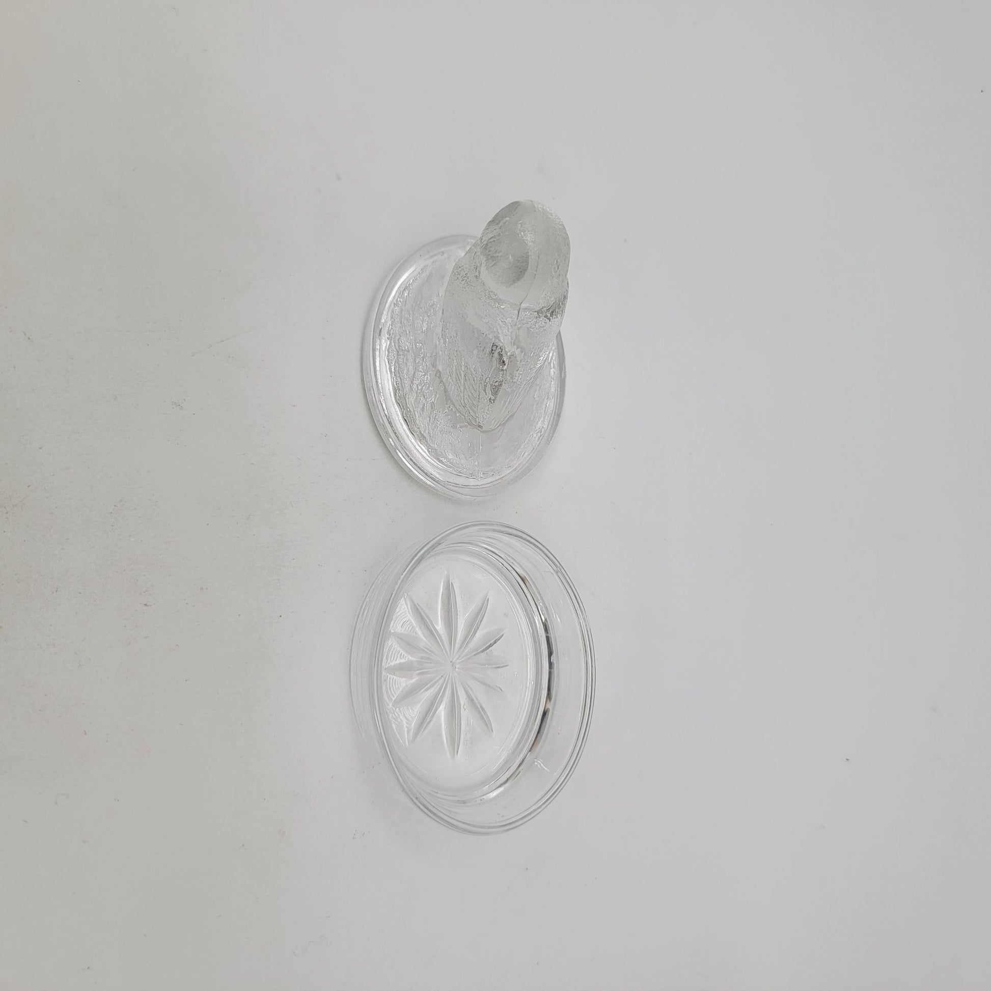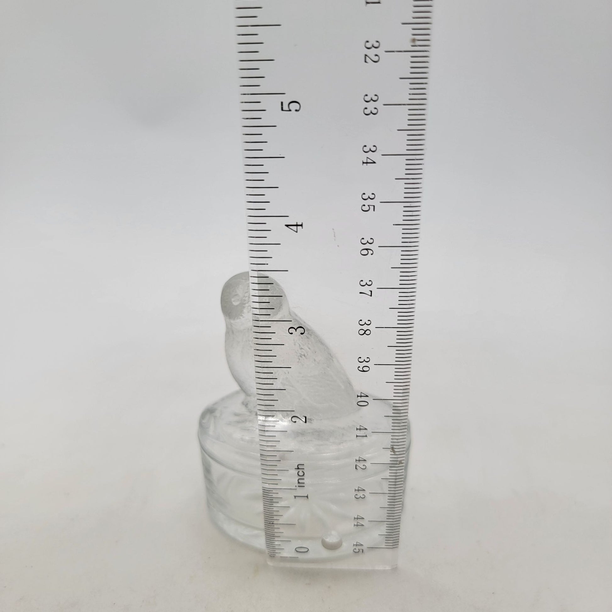 A delicate glass vessel that whispers tales of mid-century design, capturing the serene essence of an owl perched atop a textured base. Crafted with meticulous French glassmaking artistry, this piece serves as both a functional container and a nostalgic art object.