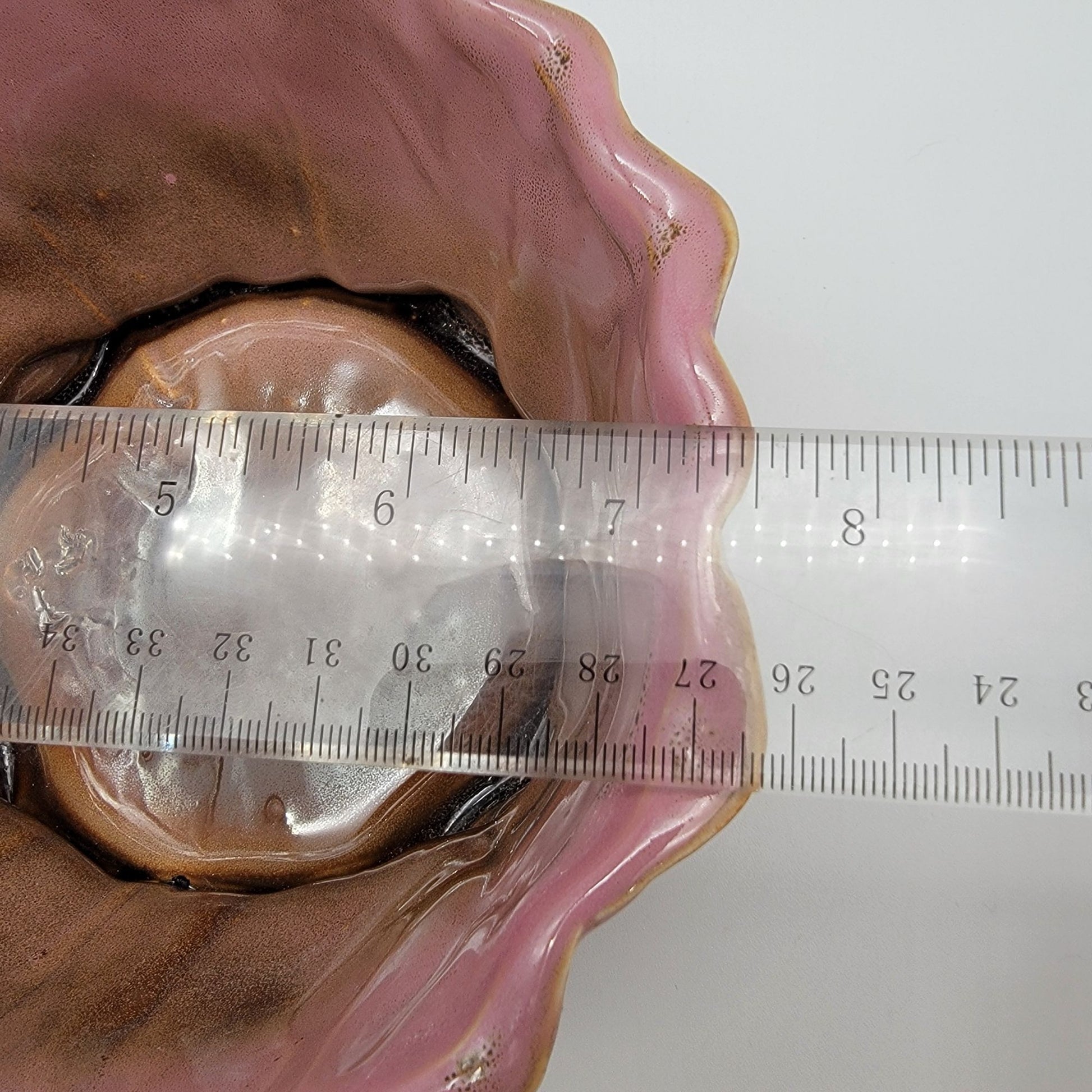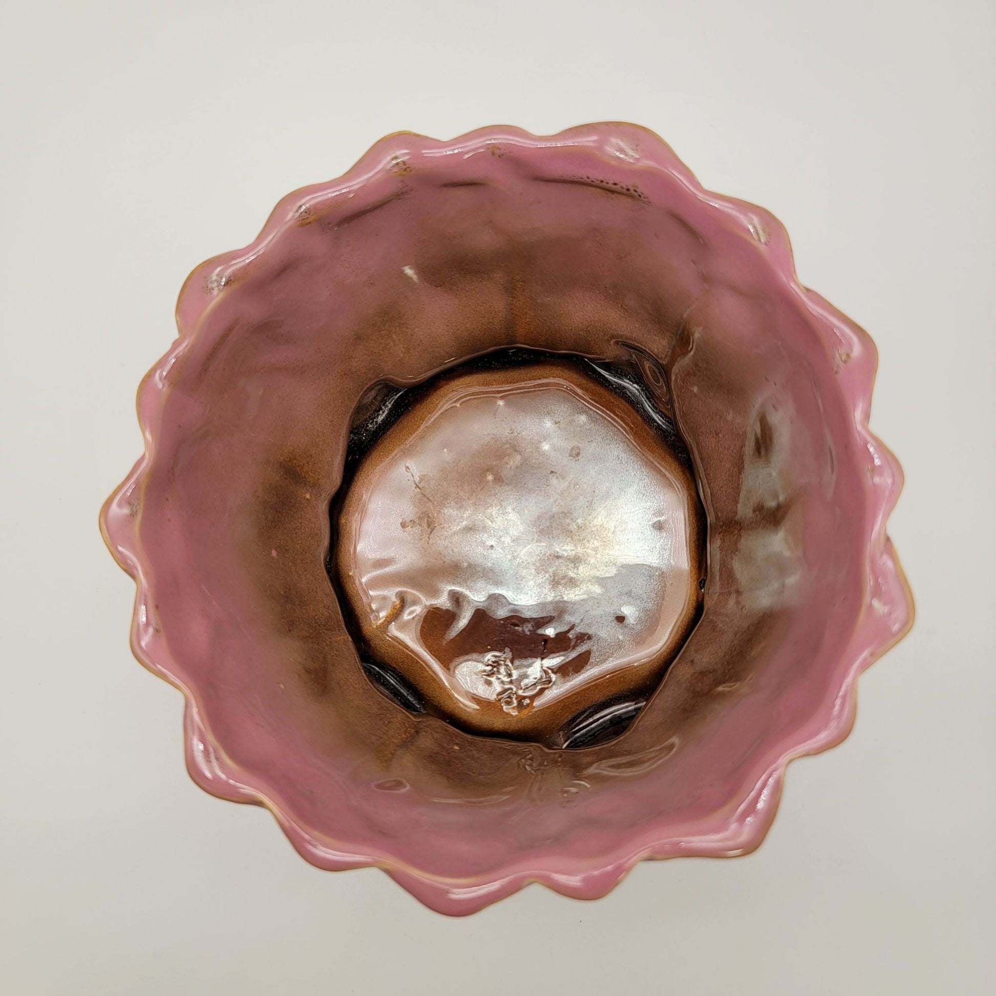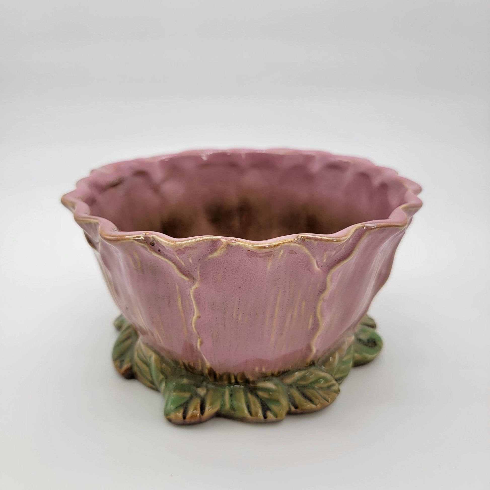 This vintage Majolica vase evokes a timeless charm with its pink rose hue, intricate bird detailing, and scalloped edges. Perfect for adding elegance to any space, this 4-inch tall planter is both decorative and functional, celebrating the beauty of nature in ceramic artistry.