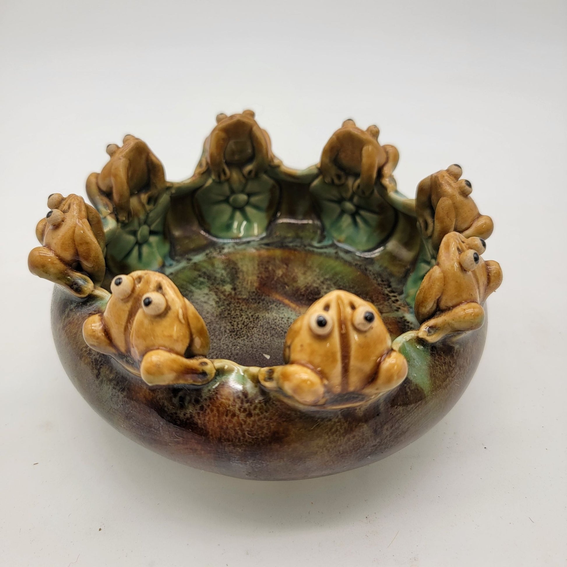 This unique Majolica pottery piece showcases an intricate design, featuring eight charming frogs perched around the rim. The vibrant glaze highlights the detailed craftsmanship, making it a captivating addition to any collection. Ideal for displaying small plants or as a decorative accent, it evokes a sense of whimsy and craftsmanship from eras past.