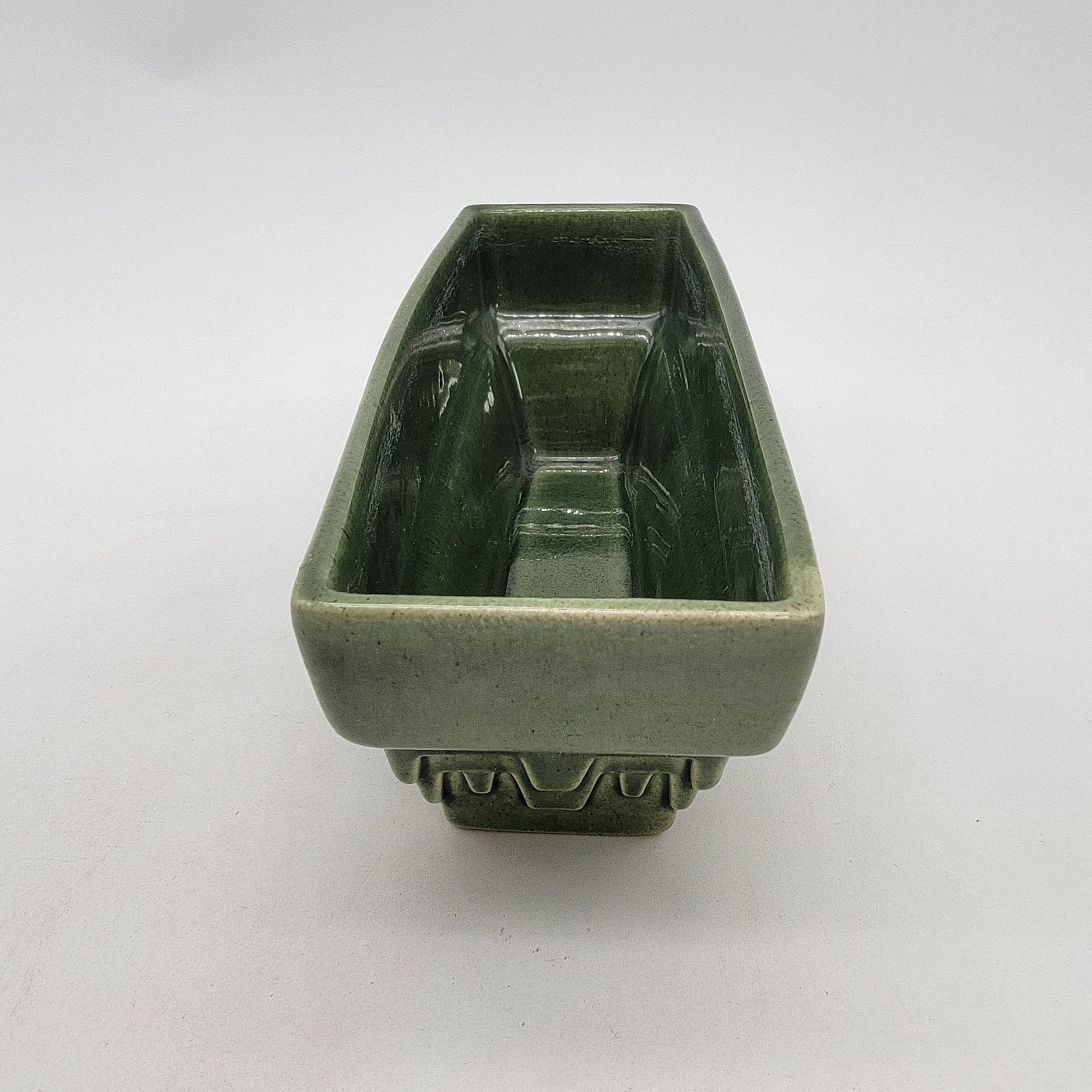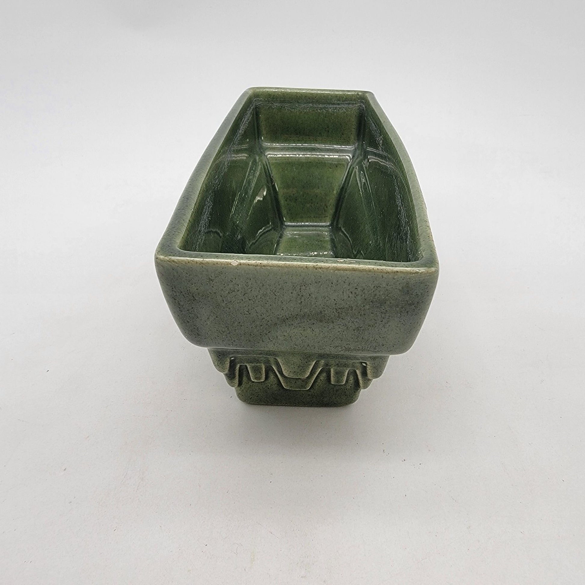 This mid-century modern Haeger pottery planter, model 3774-A, features a rectangular green glaze design. A charming piece for indoor greenery or décor.