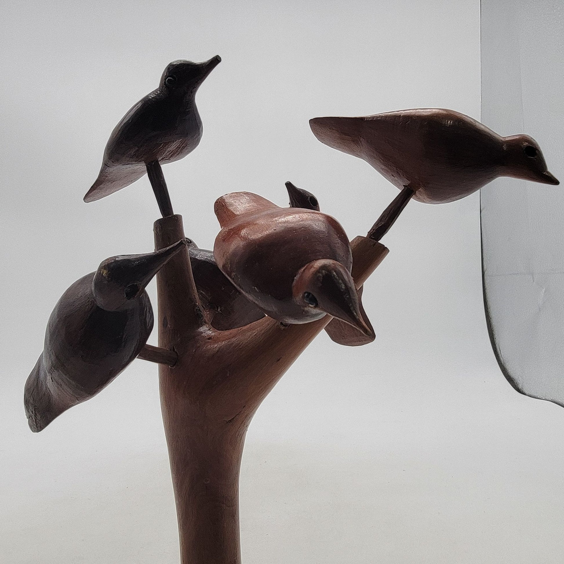 This Mid-Century Modern hand-carved wooden sculpture features five intricately detailed birds perched on a tree limb. A timeless collectible symbolizing natural elegance.