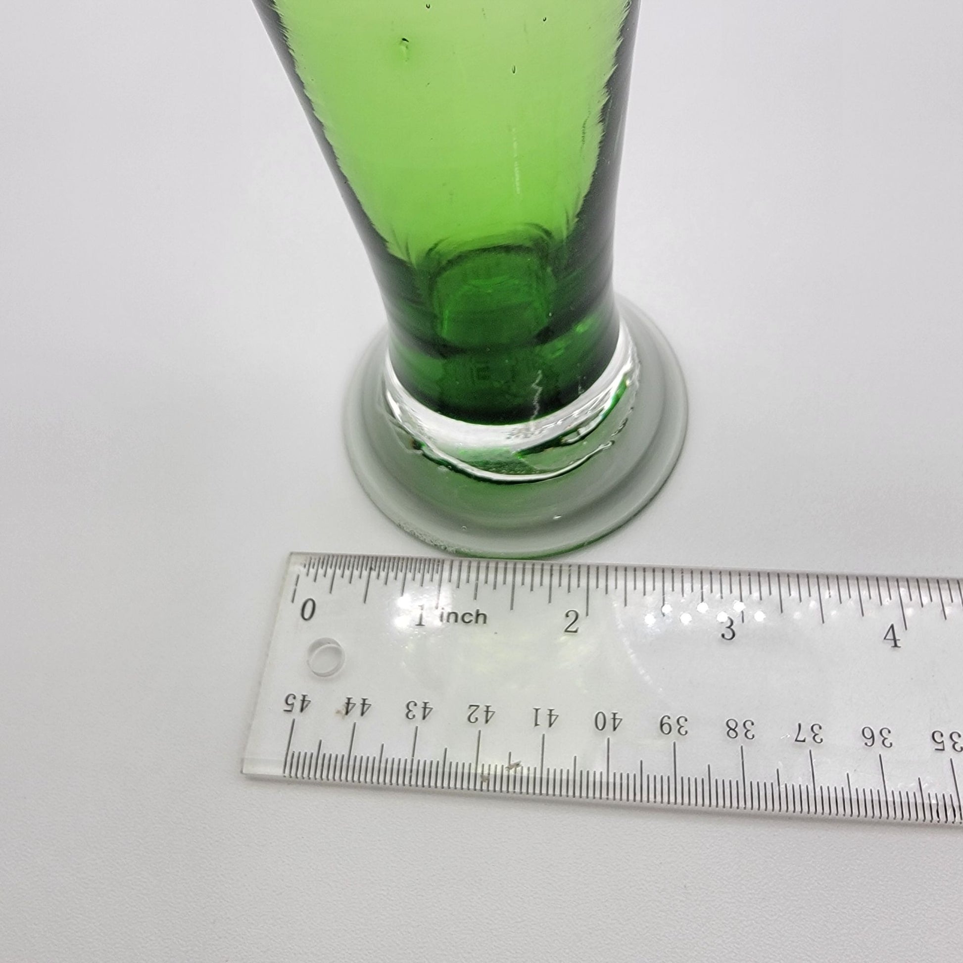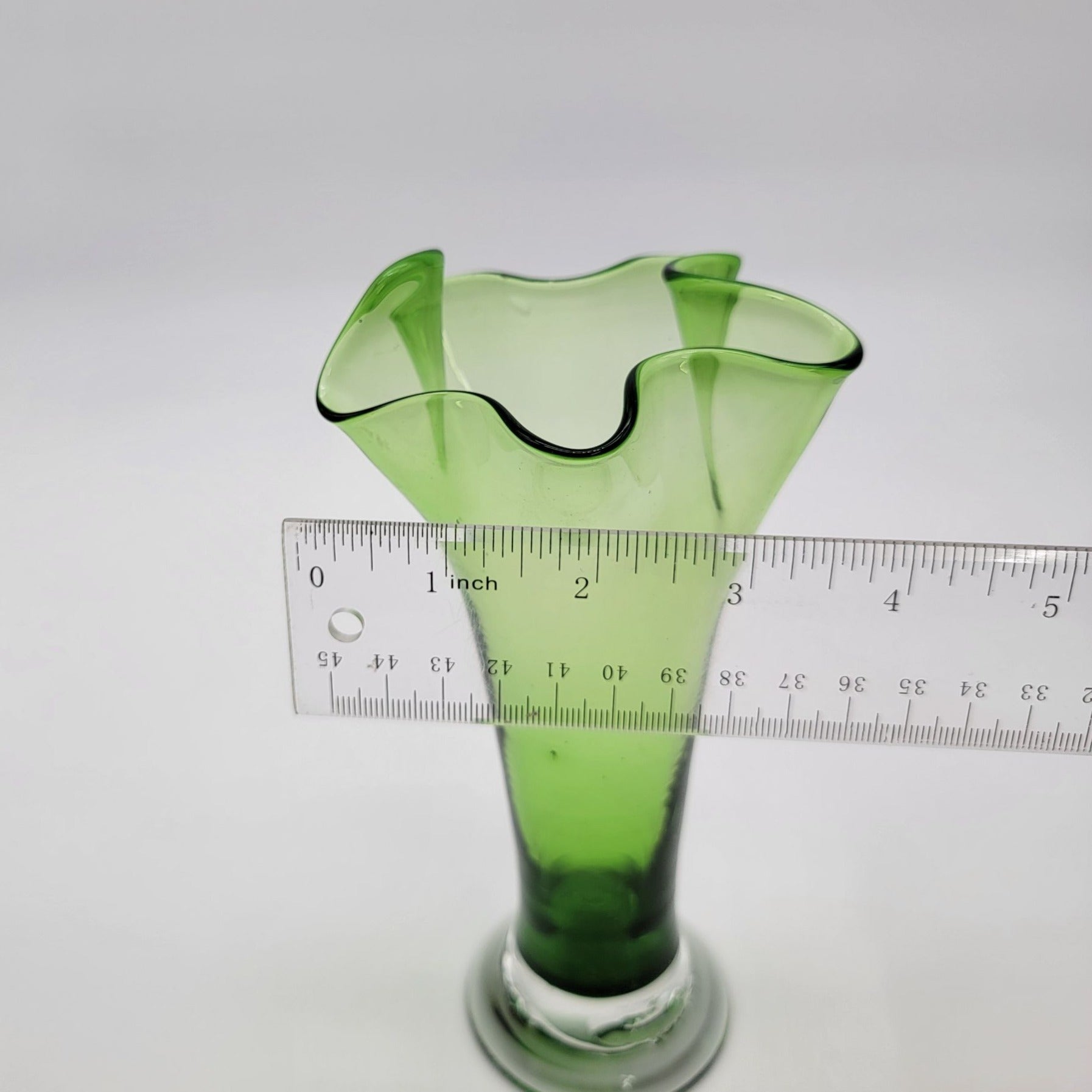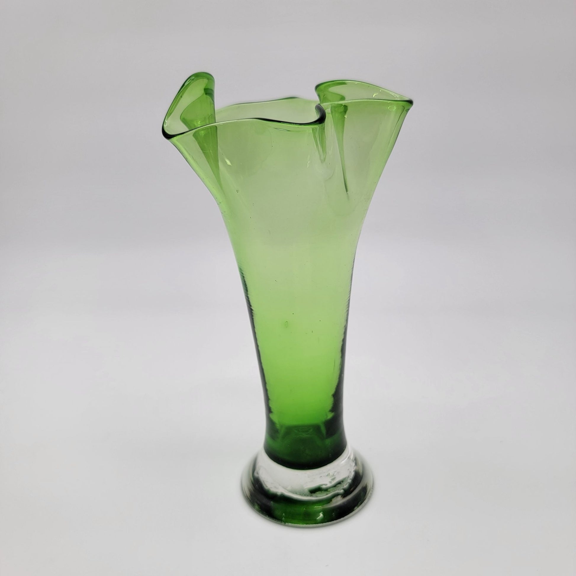 This vintage hand-blown swung vase features a ruffled rim and vibrant green hue. A timeless piece that showcases artisanal craftsmanship, adding charm to any space.